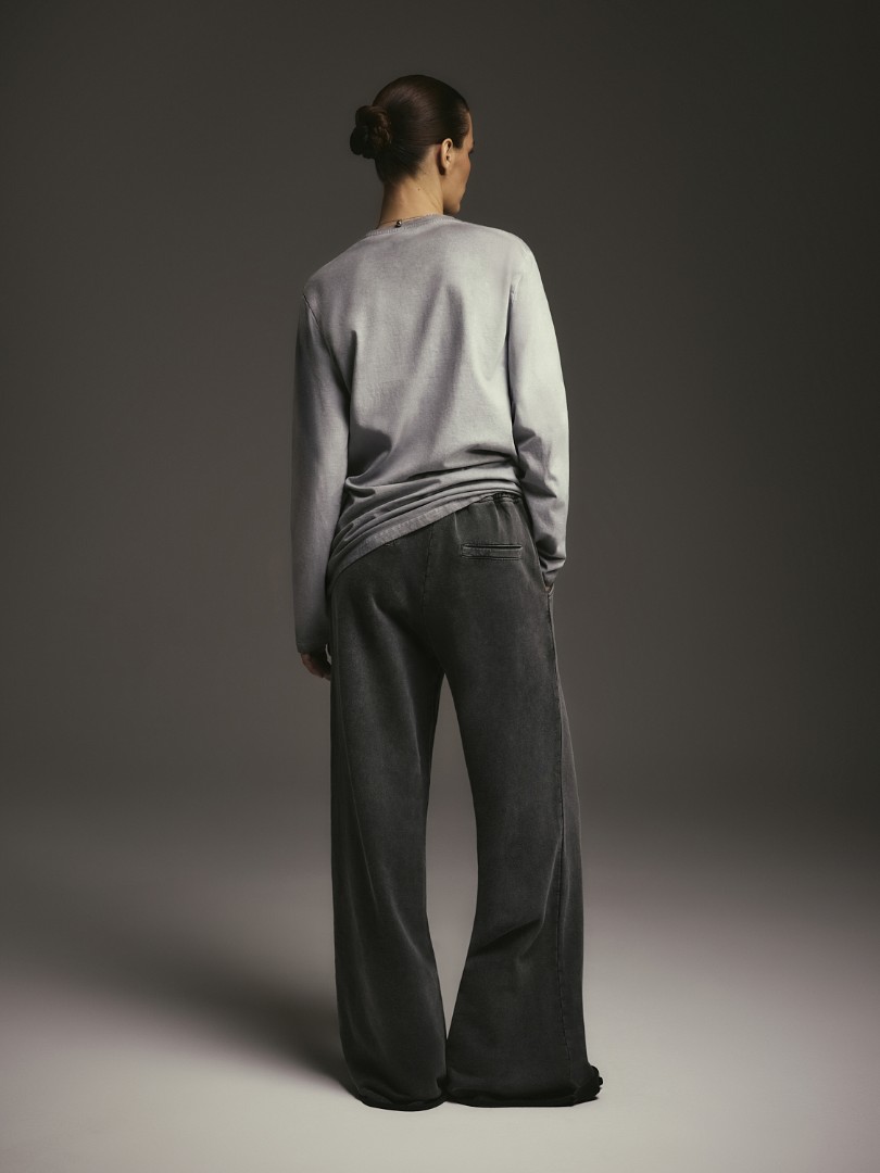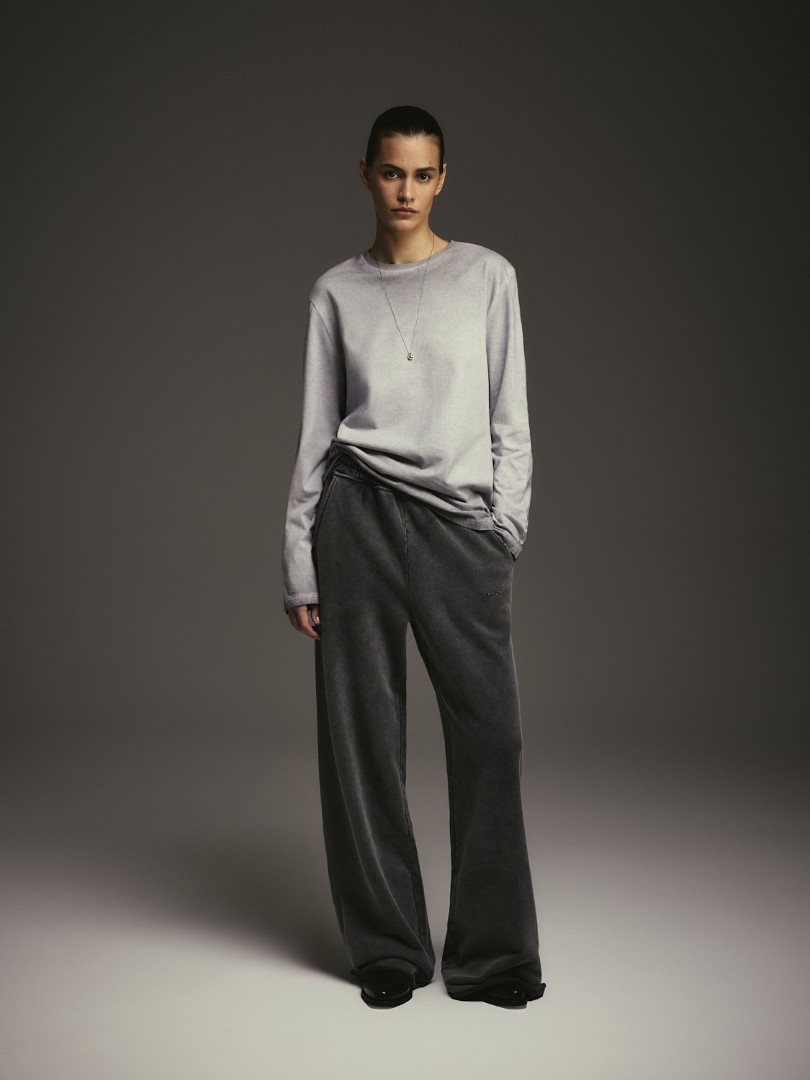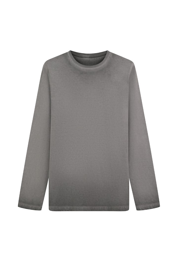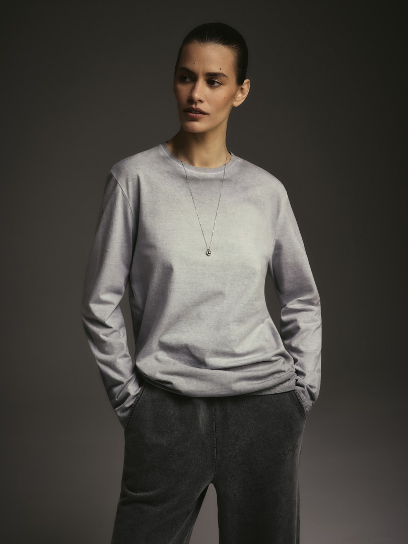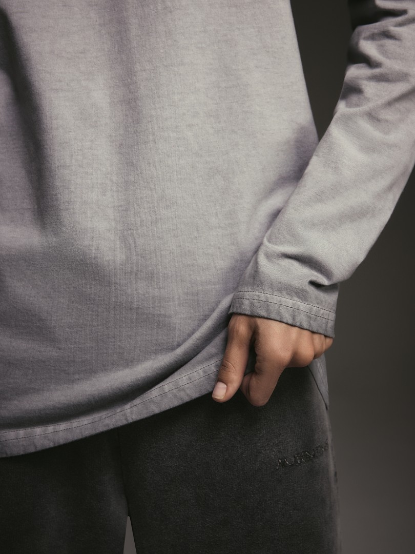 Оверсайз лонгслив с легким washed-эффектом. Модель из хлопка с удлиненными рукавами и классическим круглым вырезом.