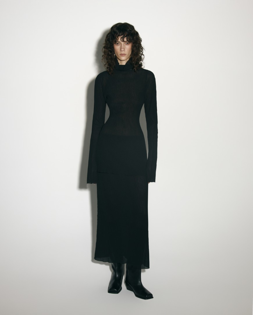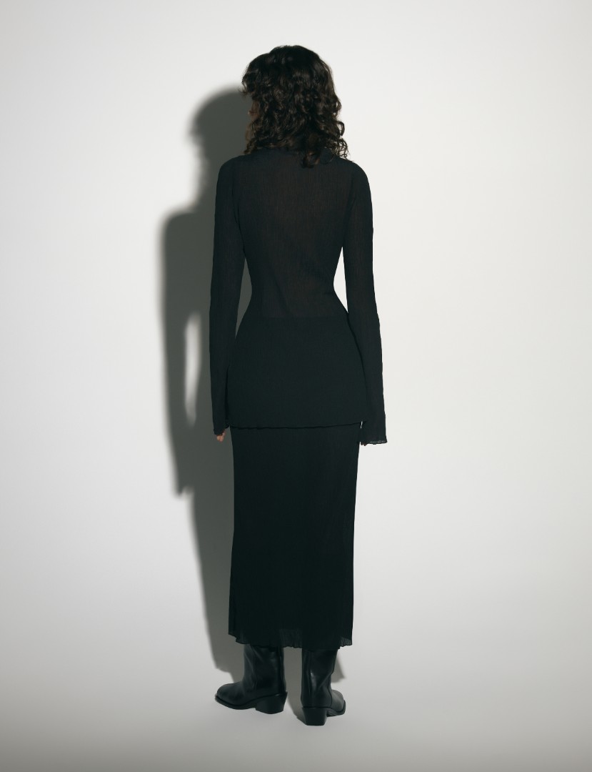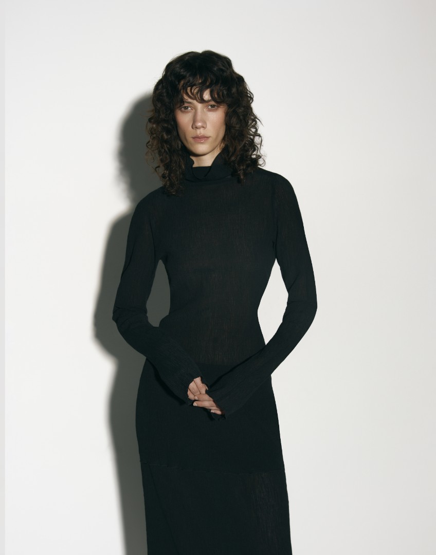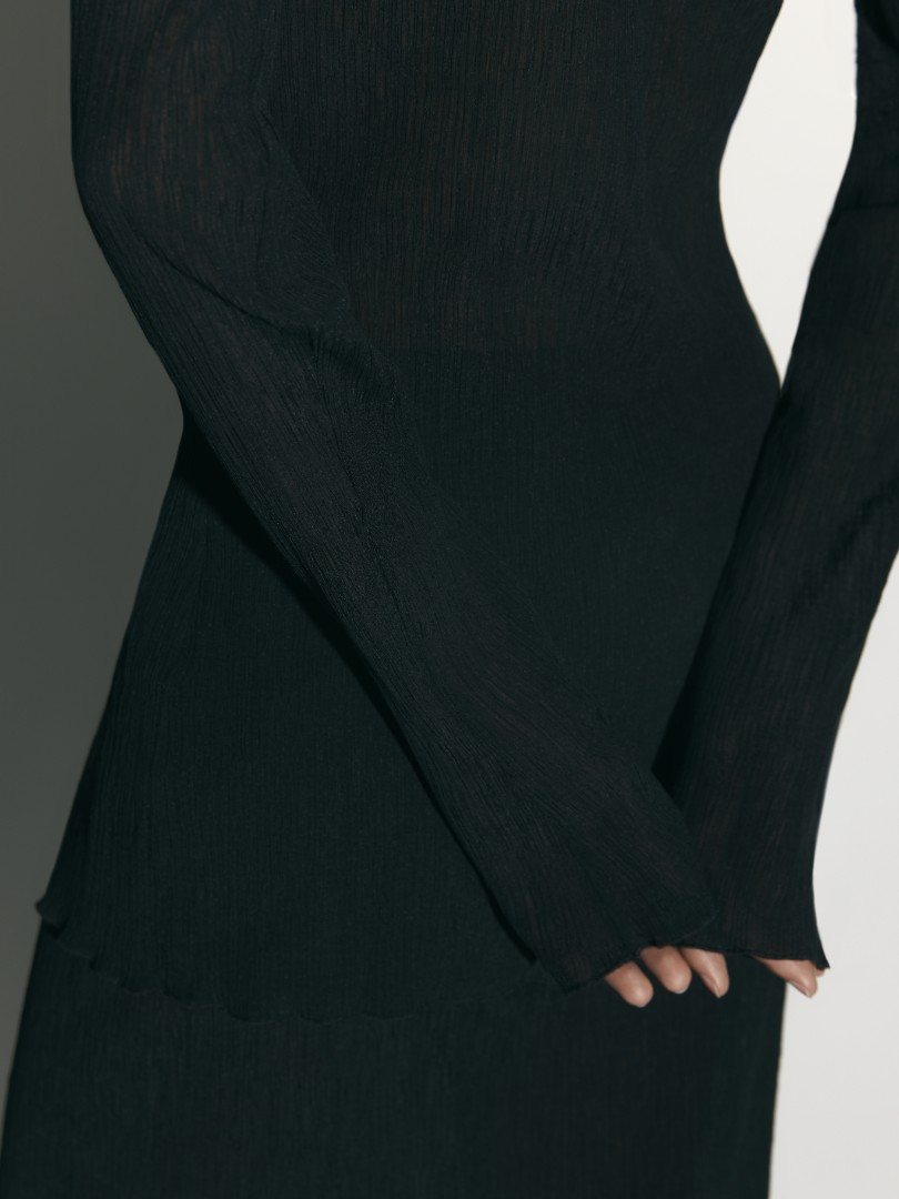 Удлиненный лонгслив приталенного кроя из фактурной жатой ткани. Изделие с воротником-стойкой и длинными рукавами. Подходящий вариант базового лонгслива для тех, кто устал от стандартных текстур, но так же ценит комфорт и точеную простоту.
