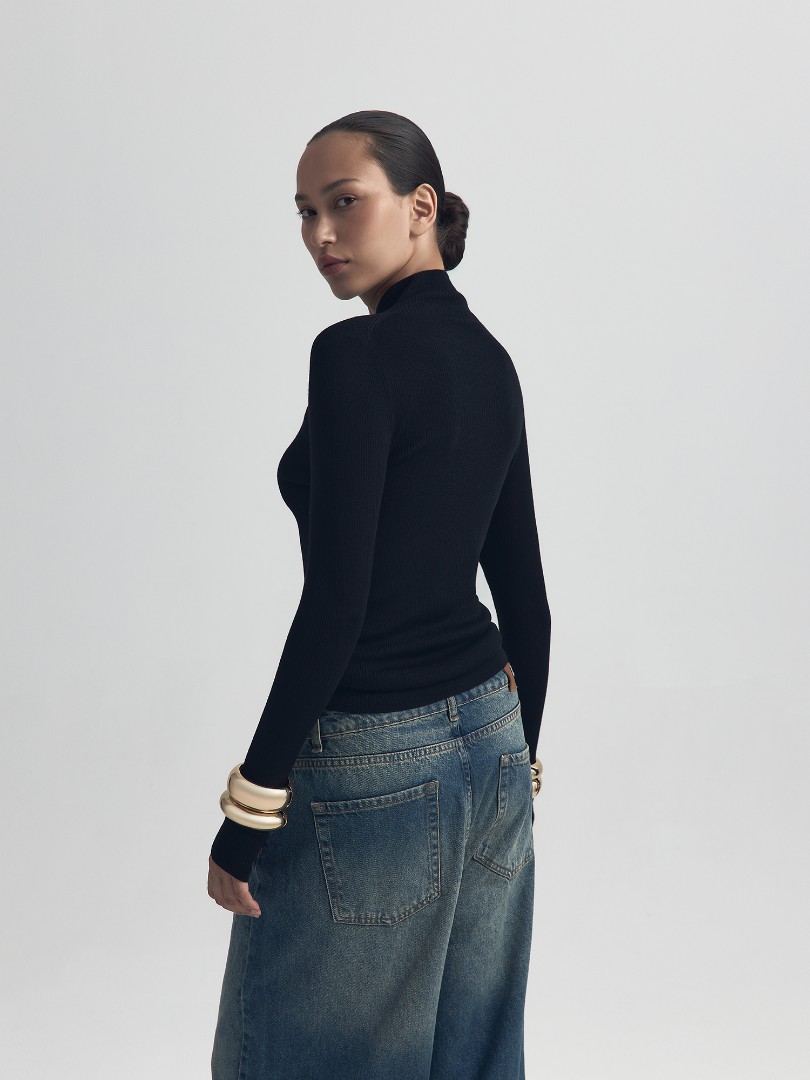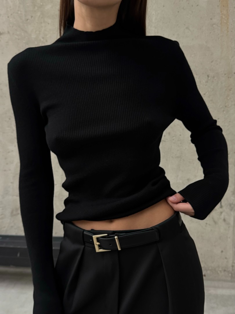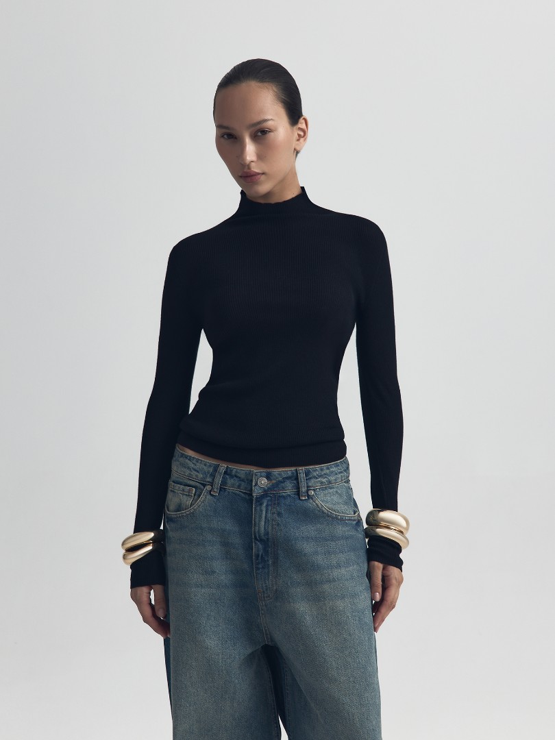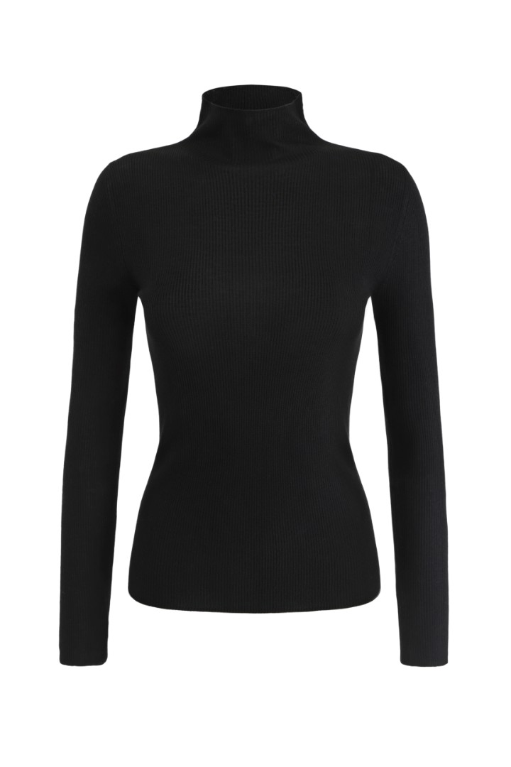 Базовый лонгслив облегающего кроя в рубчик. Модель из мягкой шерсти с воротником-стойкой и удлиненными рукавами.