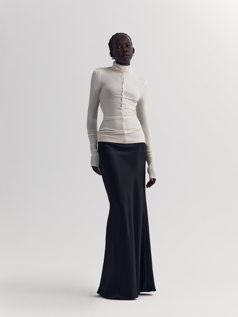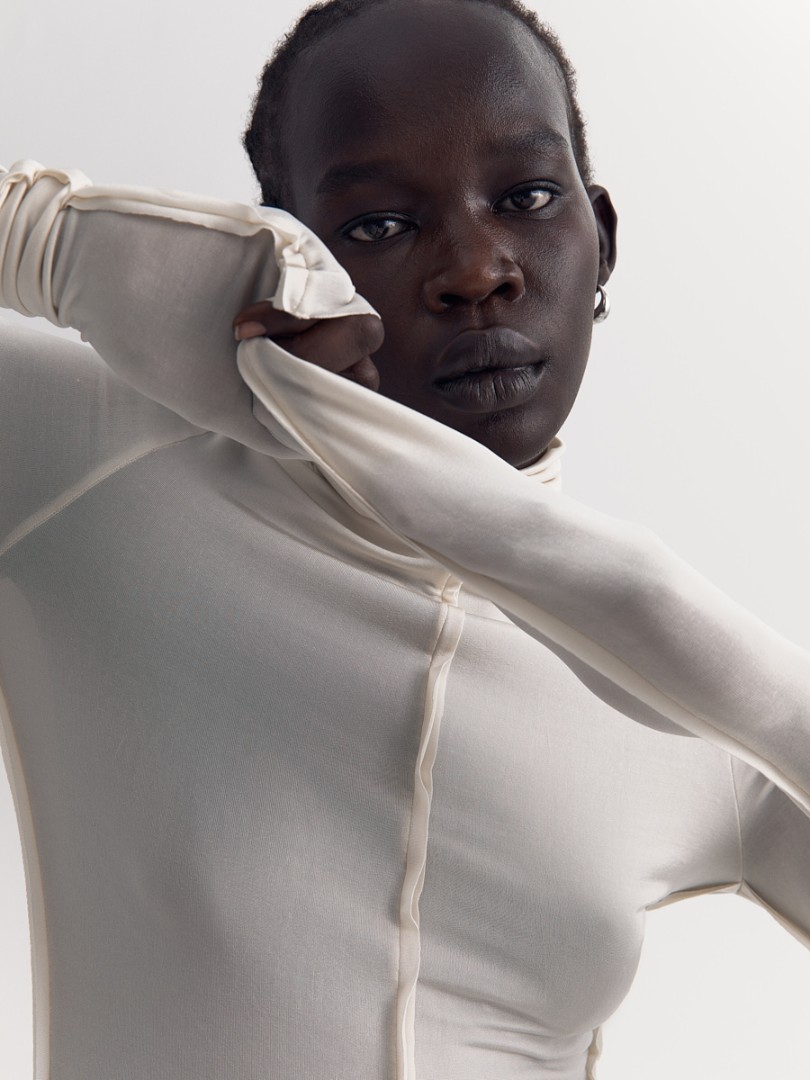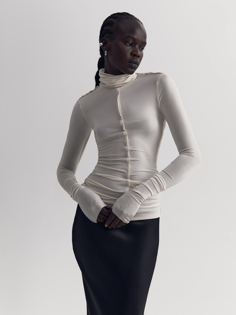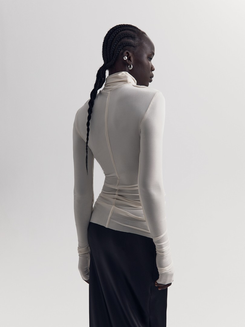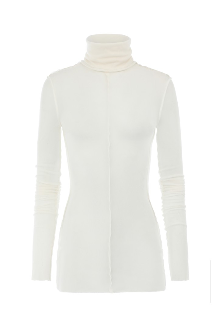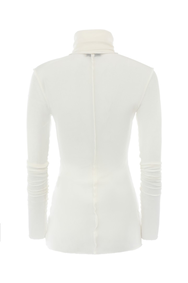 Удлиненный лонгслив с воротником turtle neck. Изделие из тонкого трикотажа декорировано фактурными швами наружу с необработанным краем.