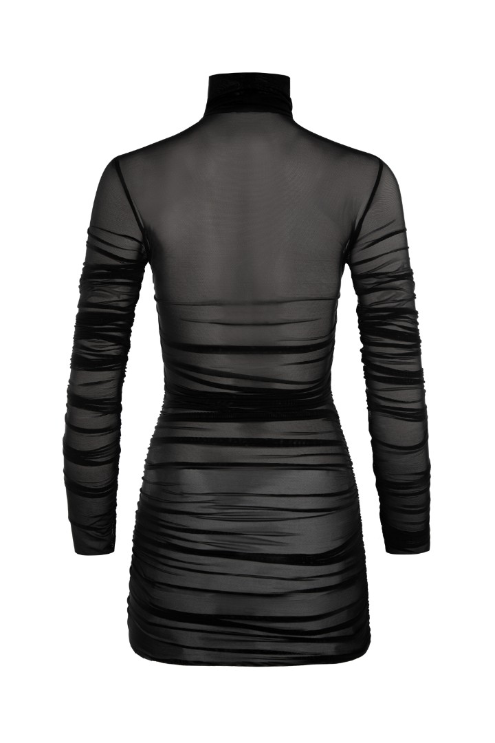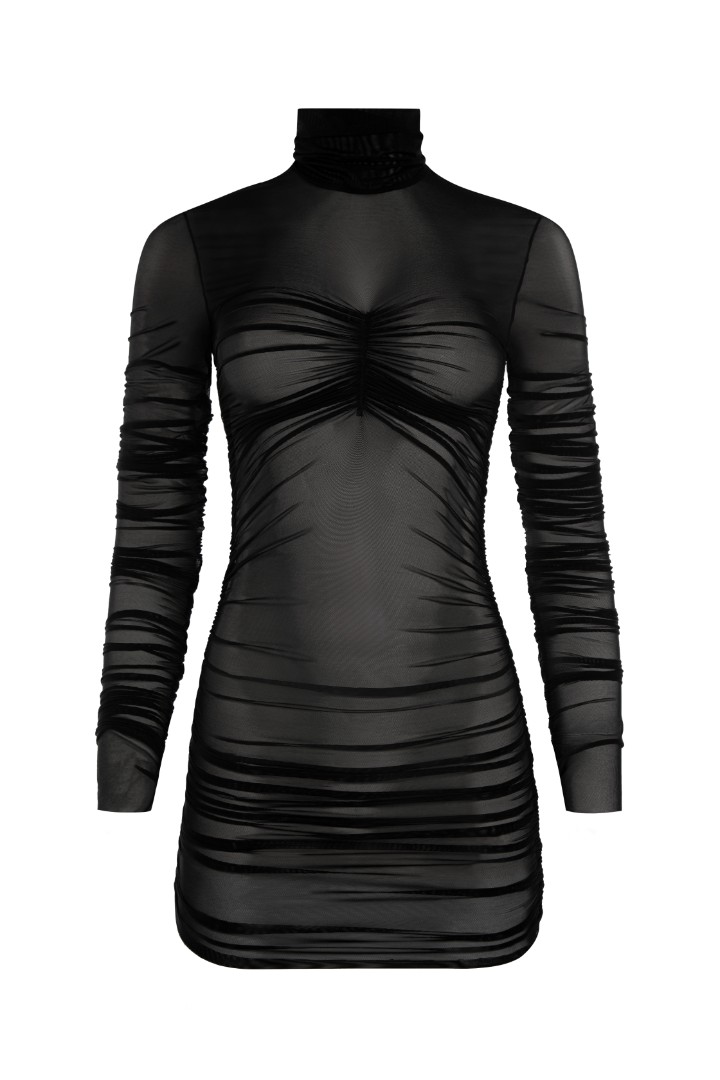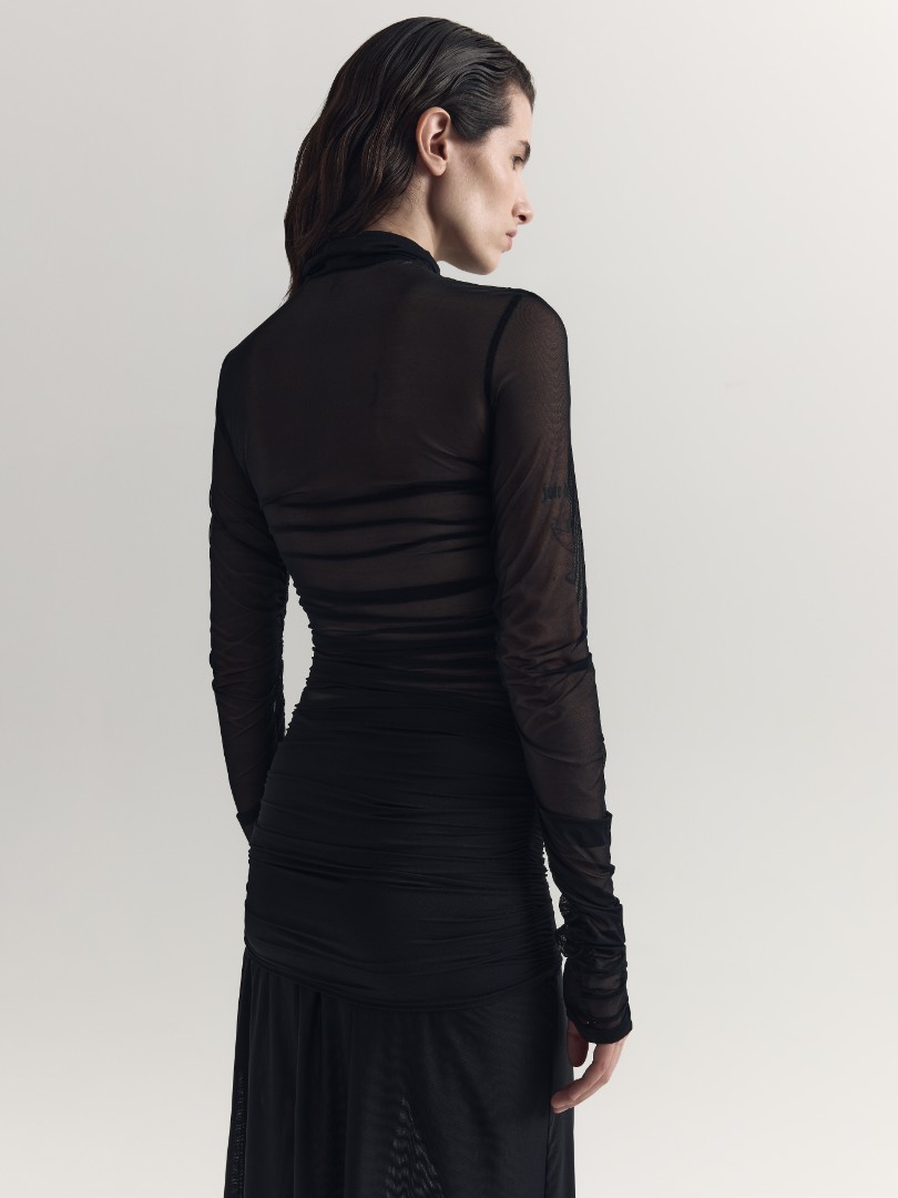Лонгслив из прозрачной эластичной сетки с драпировками в боковом шве. Воротник-стойка, удлиненные рукава и декоративная сборка в области декольте.