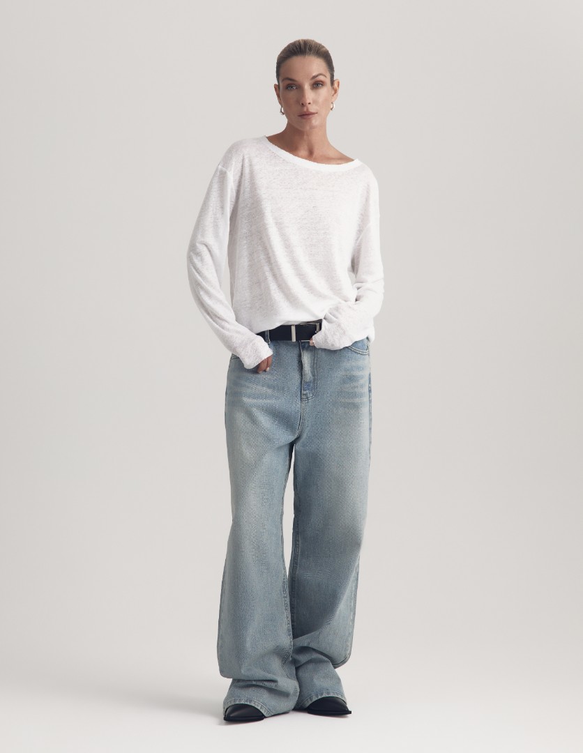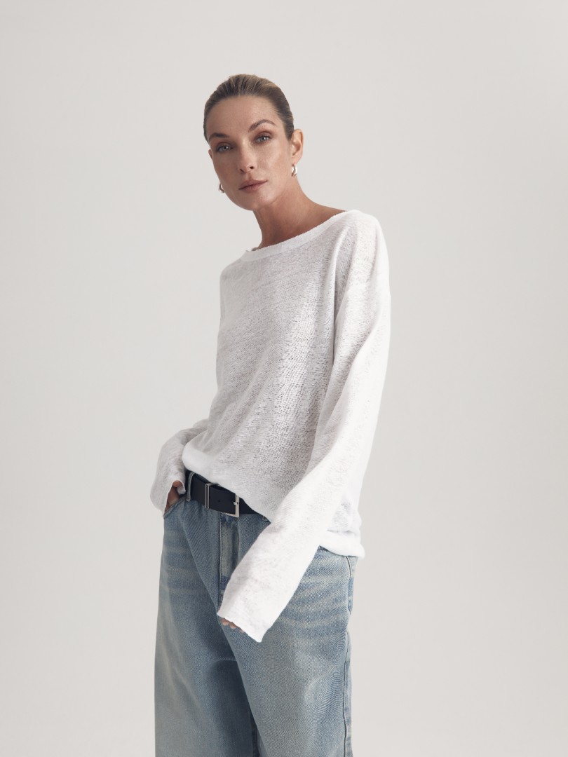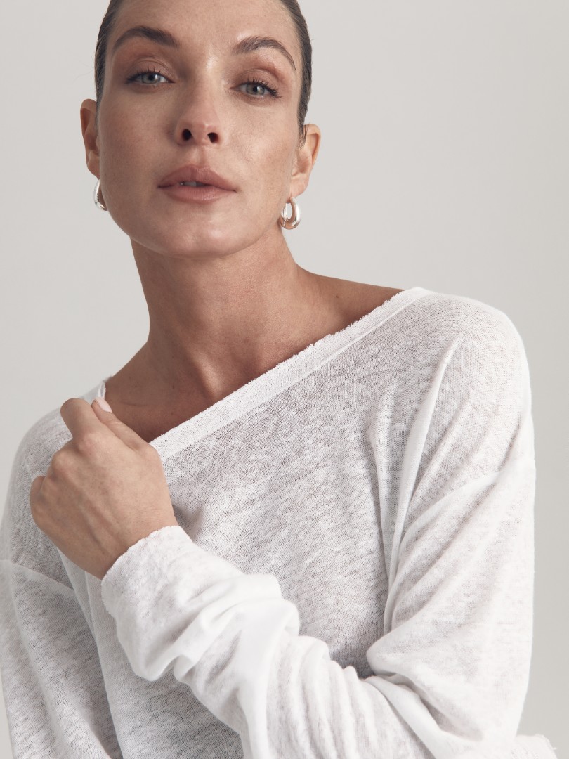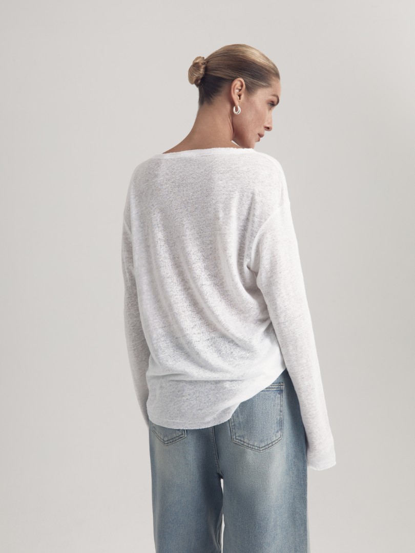 Полупрозрачный лонгслив из эластичного трикотажного льна. Модель со спущенной линией плеча, круглым вырезом и удлиненными рукавами станет незаменимым элементом базового гардероба в весенне-летний сезон.