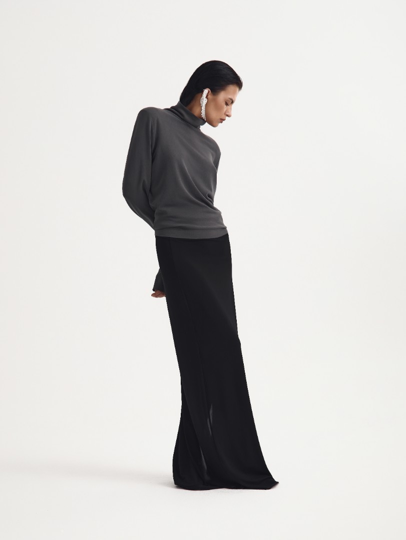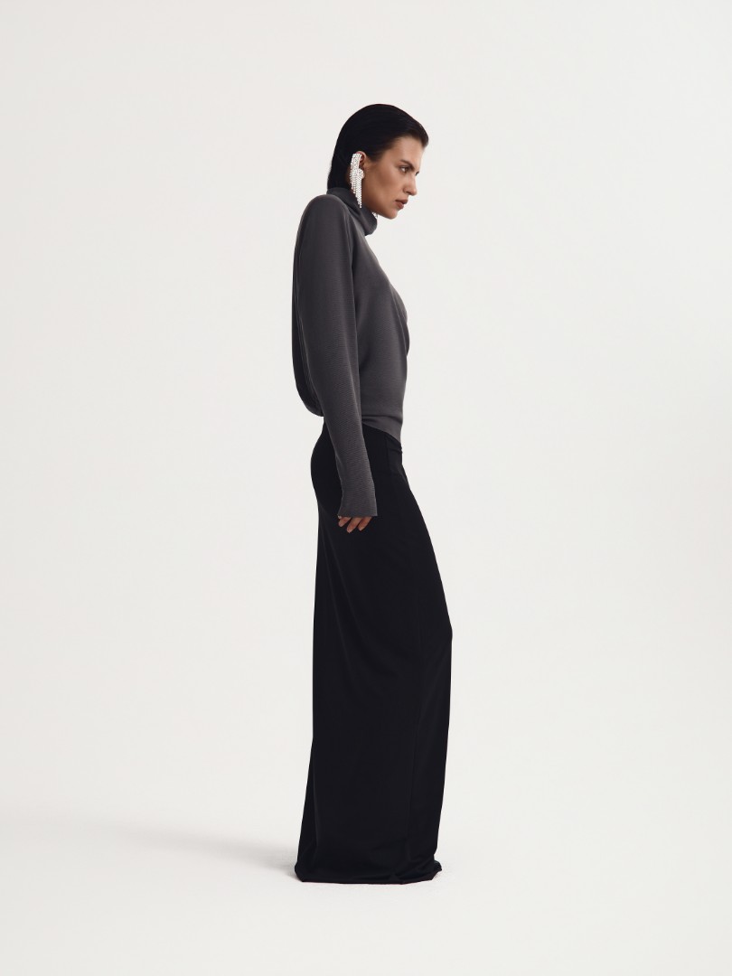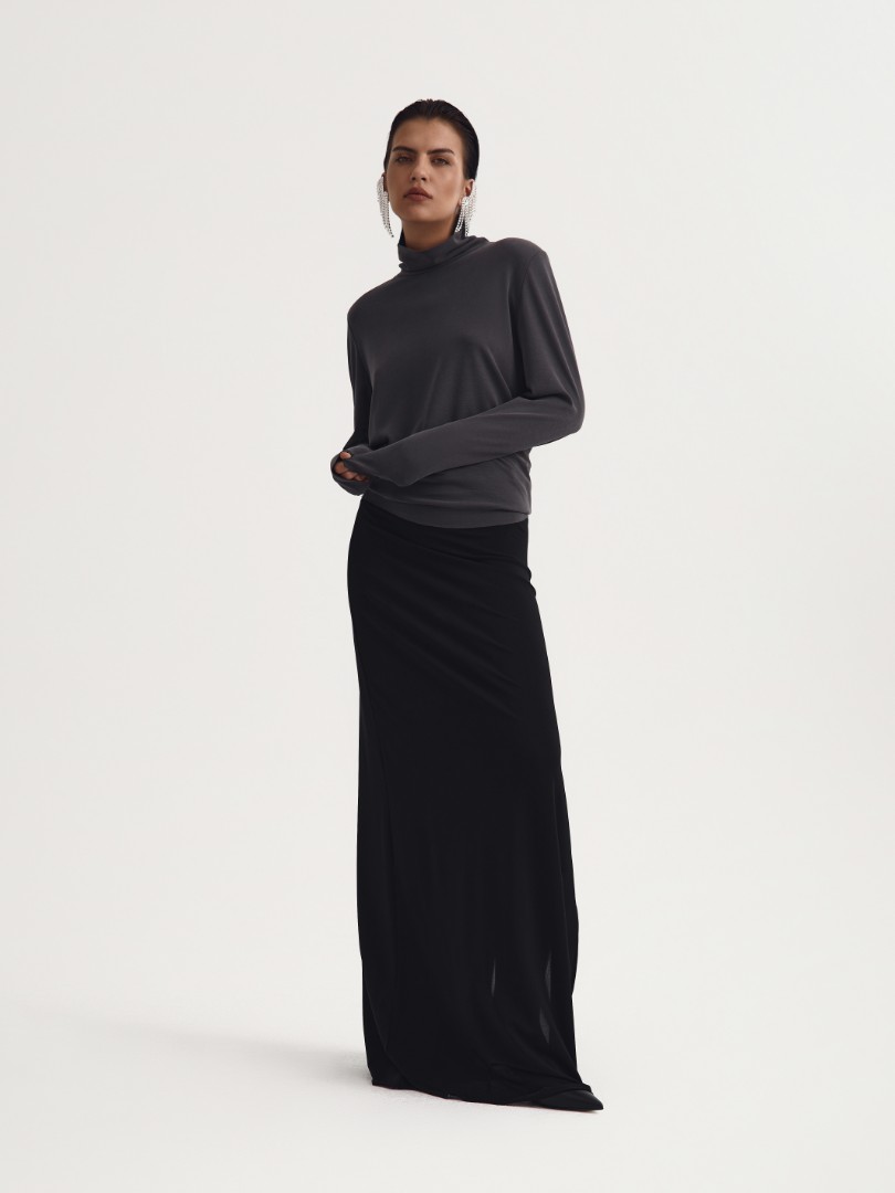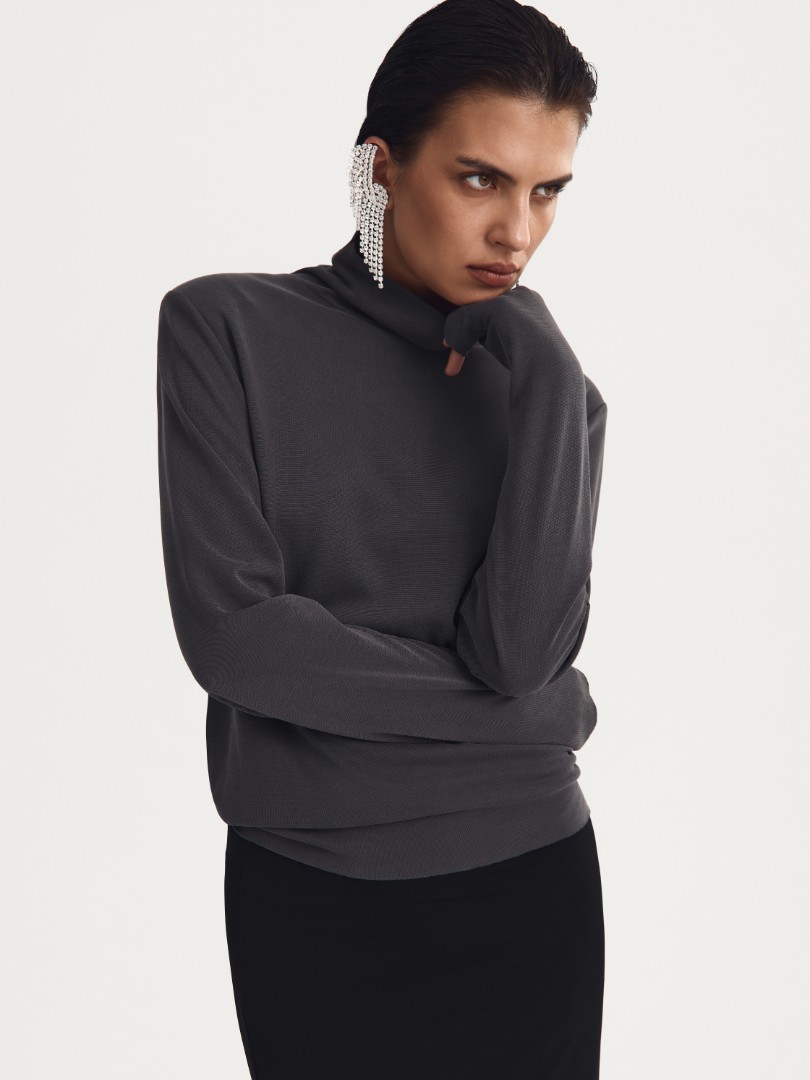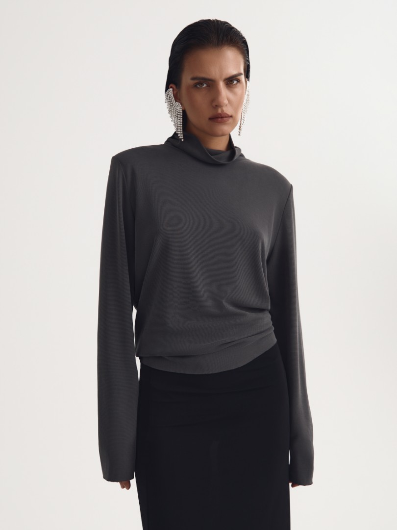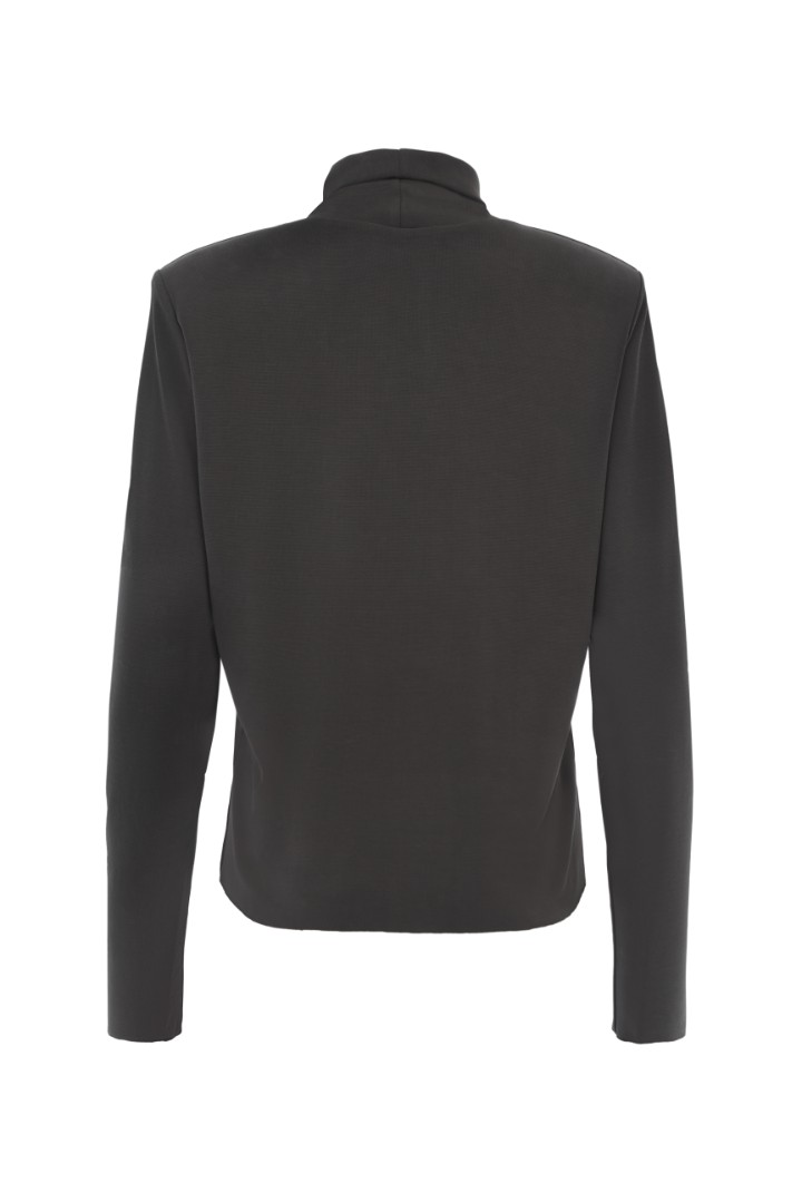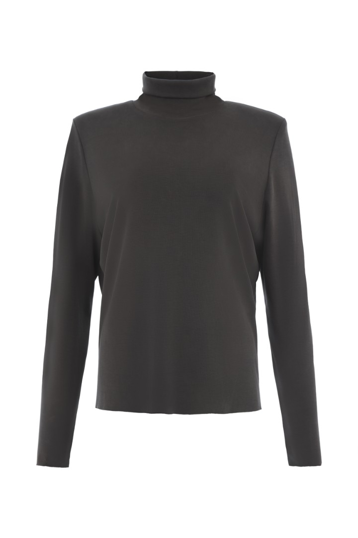 Трикотажный бадлон с воротником turtle neck. Прямой крой, свободная посадка, длинные рукава и графичные подплечники. Необработанный нижний край.