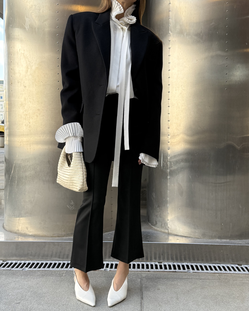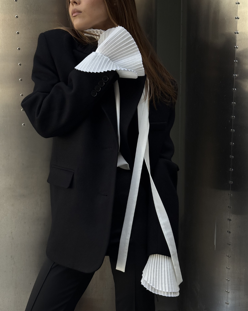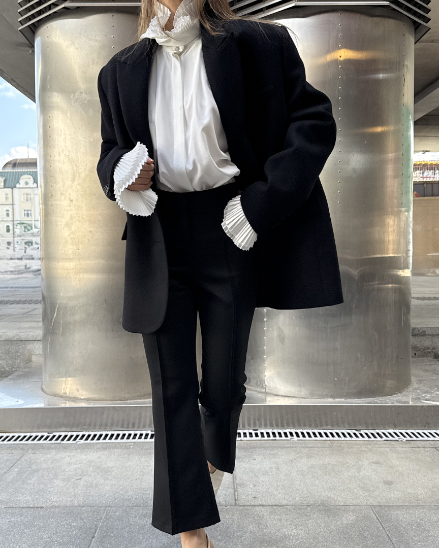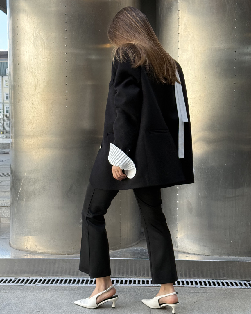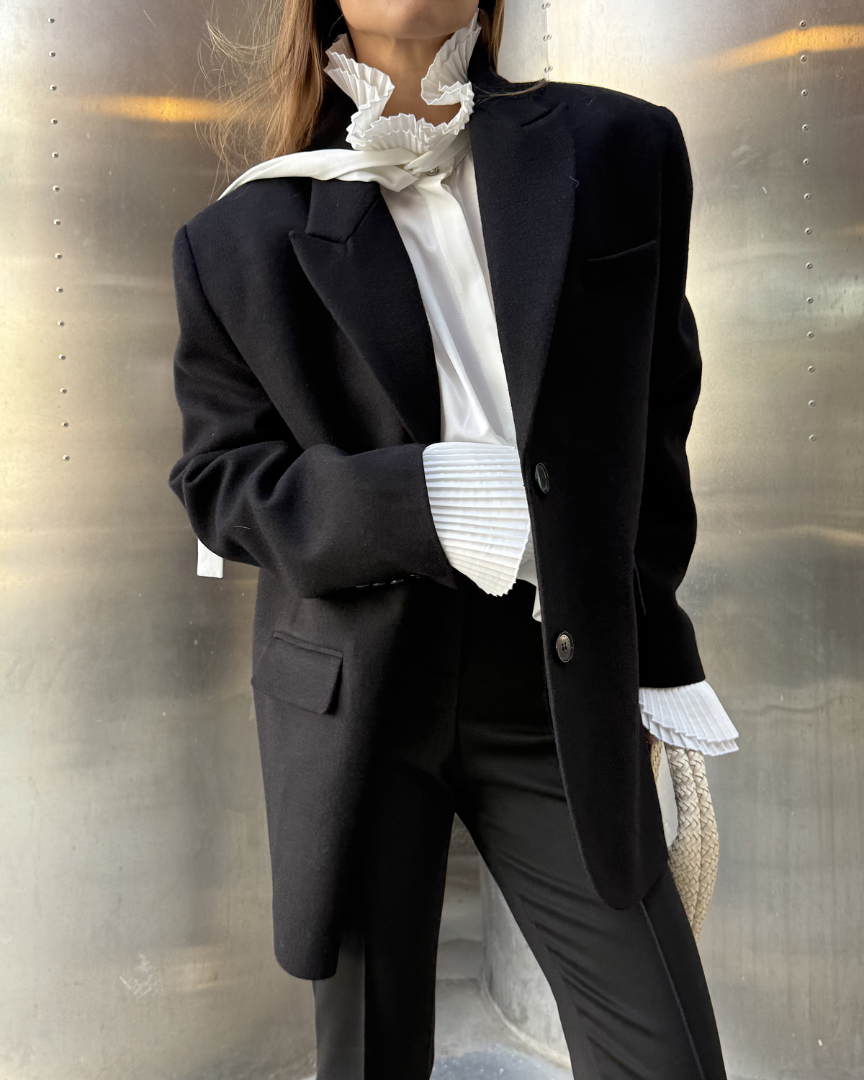 Бушлат оверсайз кроя из плотной шерсти с подплечниками. Маскулинный стиль изделия сочетает в себе лёгкость женской натуры наряду с величественной внутренней силой.