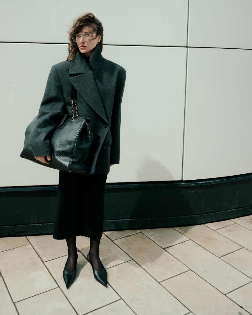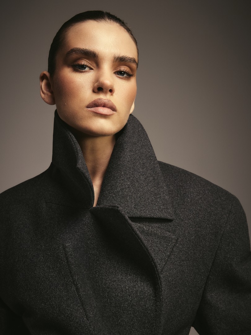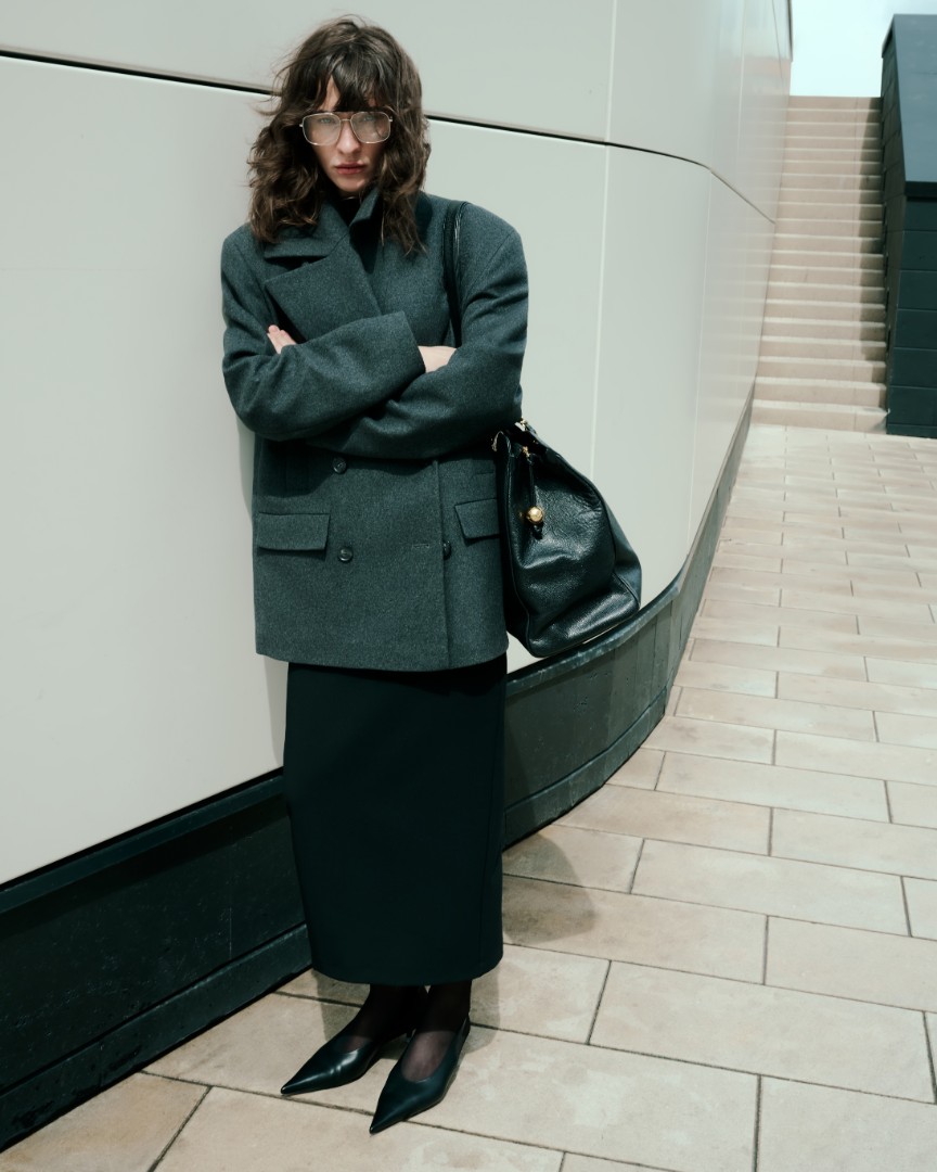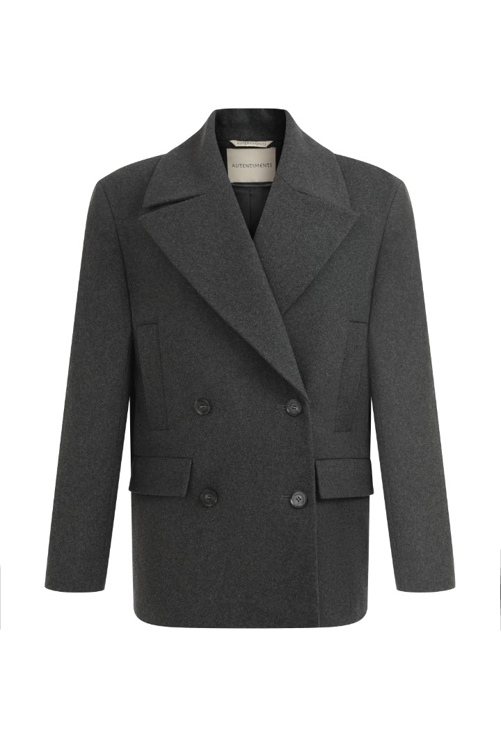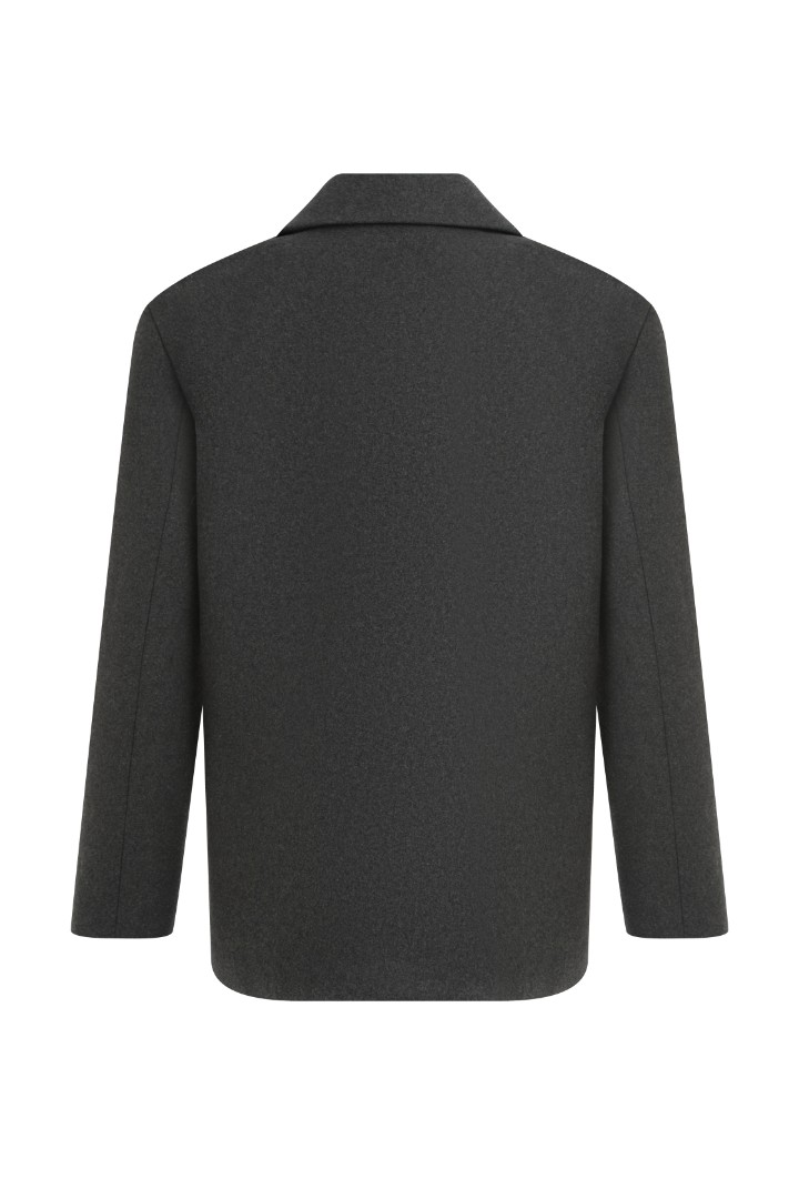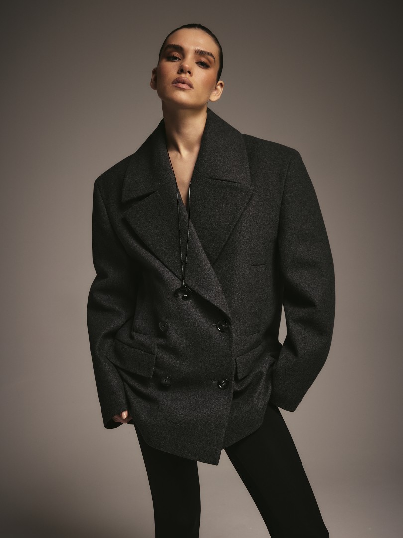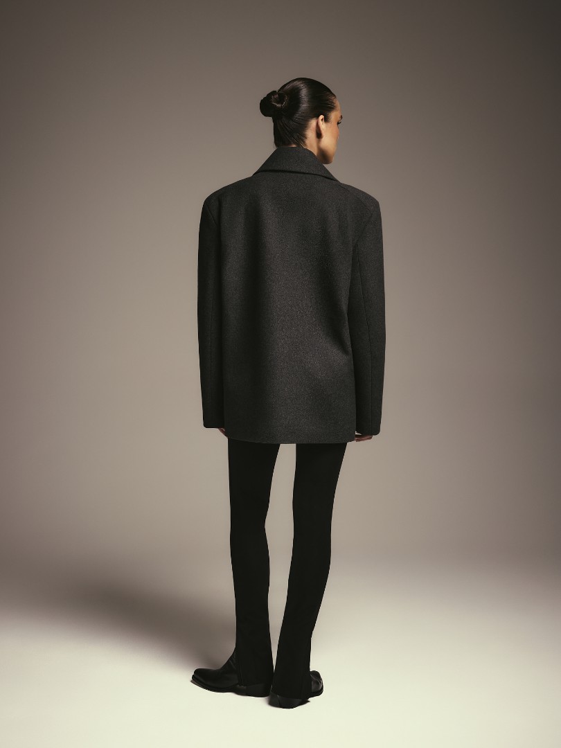 Пальто-бушлат оверсайз кроя из шерсти, зауженное к низу. Двубортная модель с подплечниками, прорезными карманами с клапанами и двумя карманами в рамку спереди. Широкие лацканы, трансформирующиеся в воротник-стойку. Застёжка на пуговицы.
