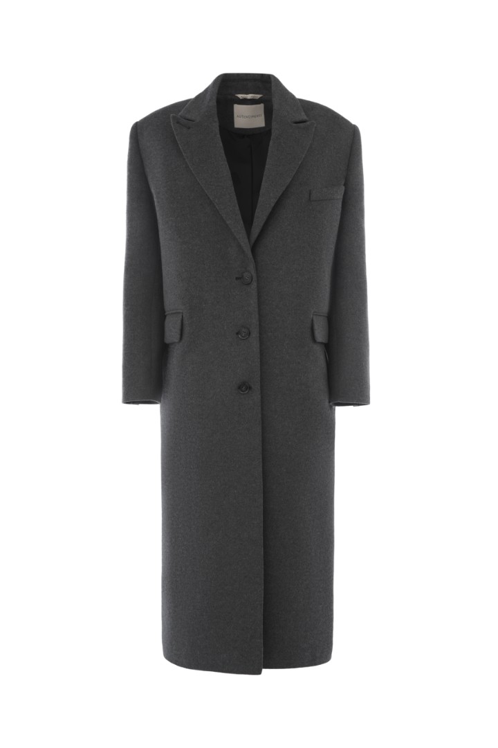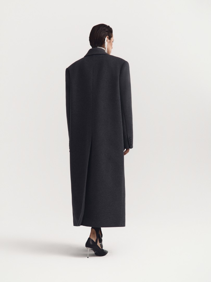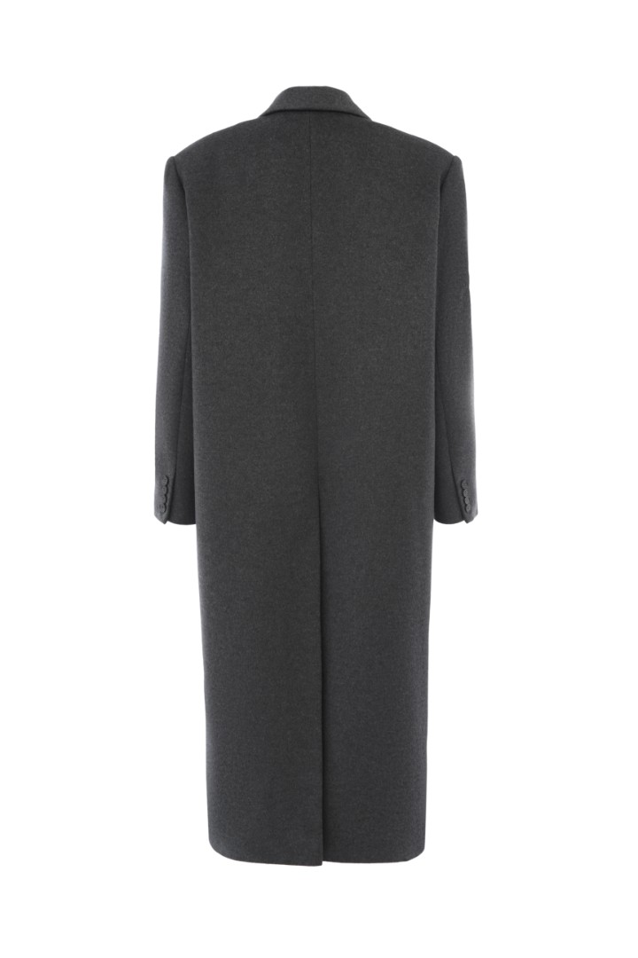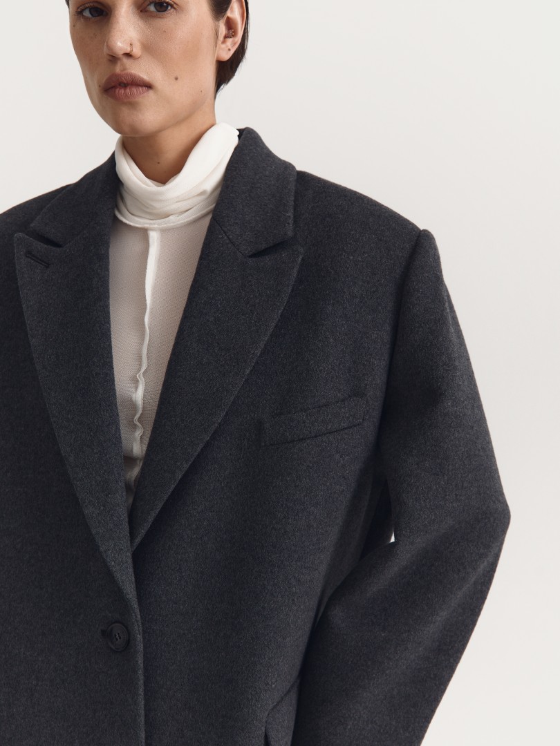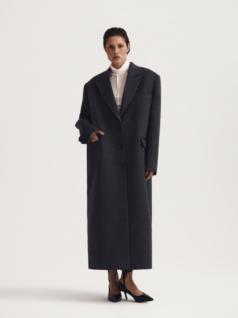 Классическое однобортное пальто из шерсти и кашемира. Оверсайз крой, объемные подплечники и врезные карманы с широкими клапанами. Плотная ткань хорошо держит форму и создает графичный выверенный силуэт.