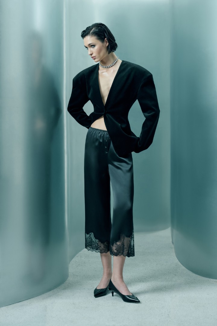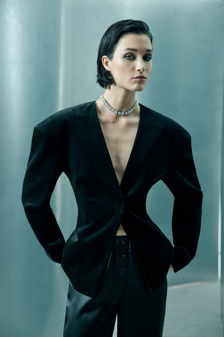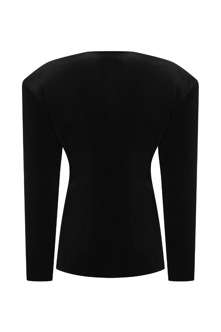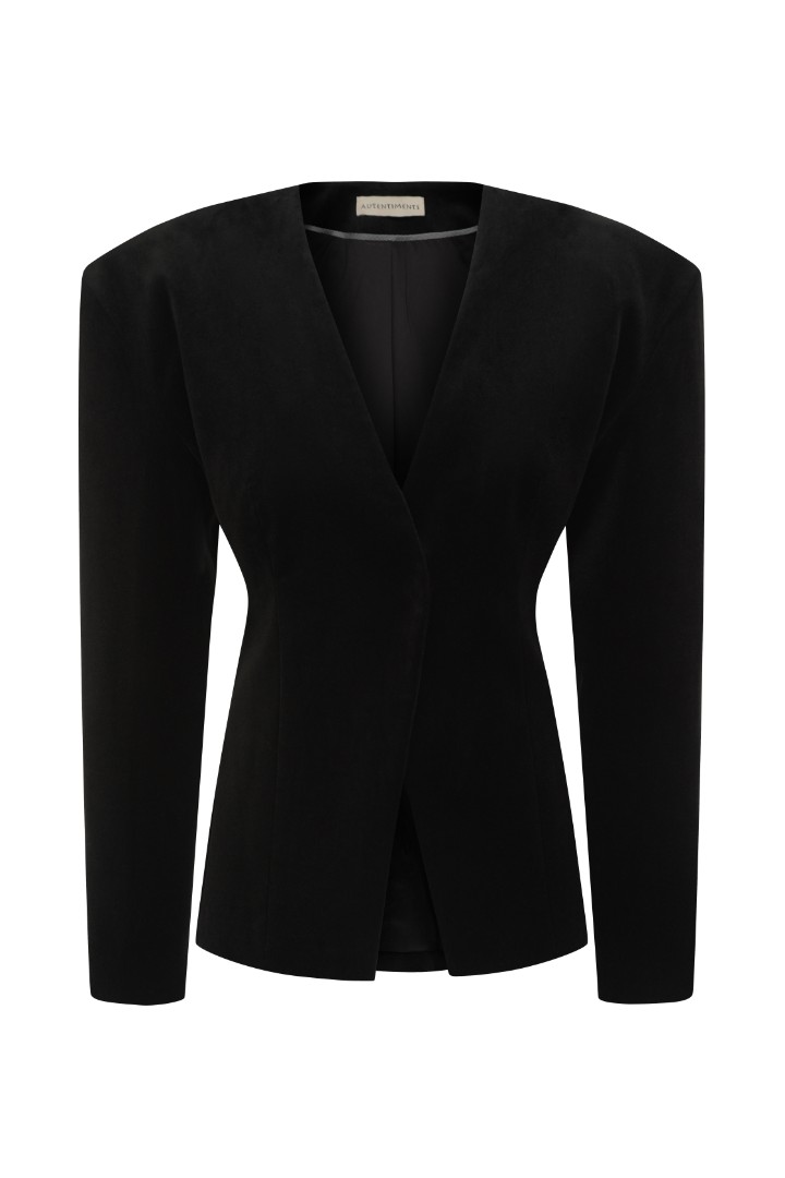 Приталенный жакет с акцентной плечевой линией, выполненный из костюмной бархатной ткани, которая придаст любому образу эксклюзивности и характера.