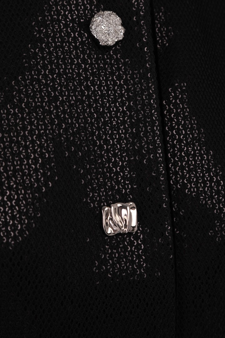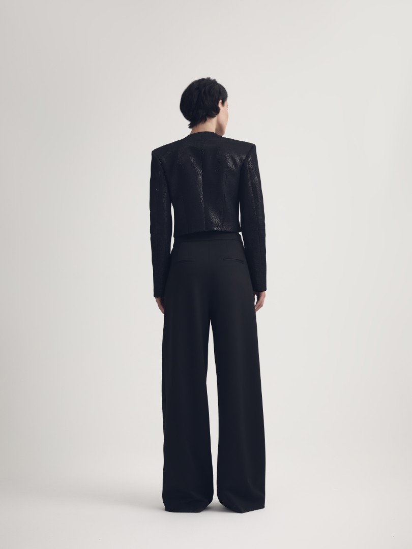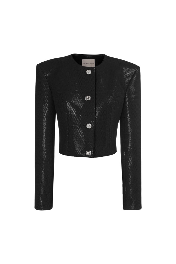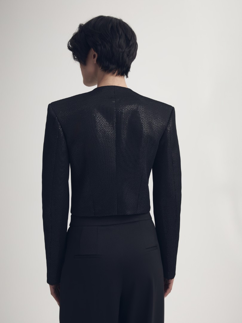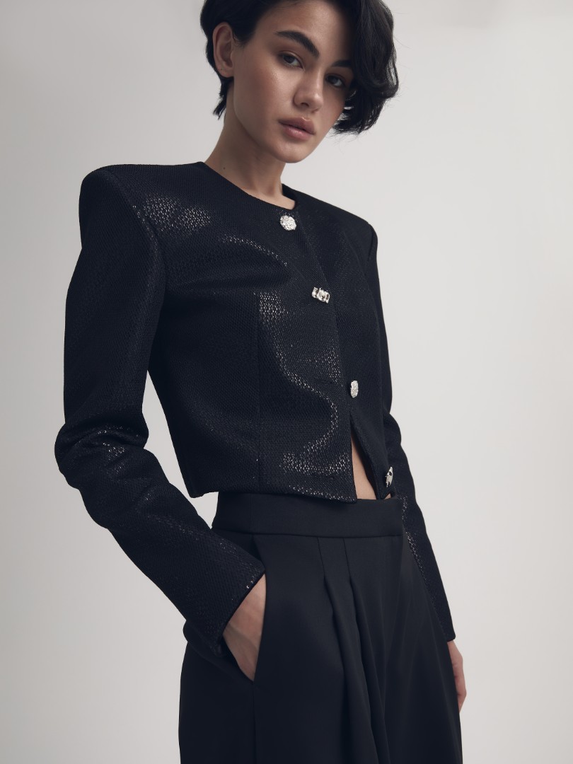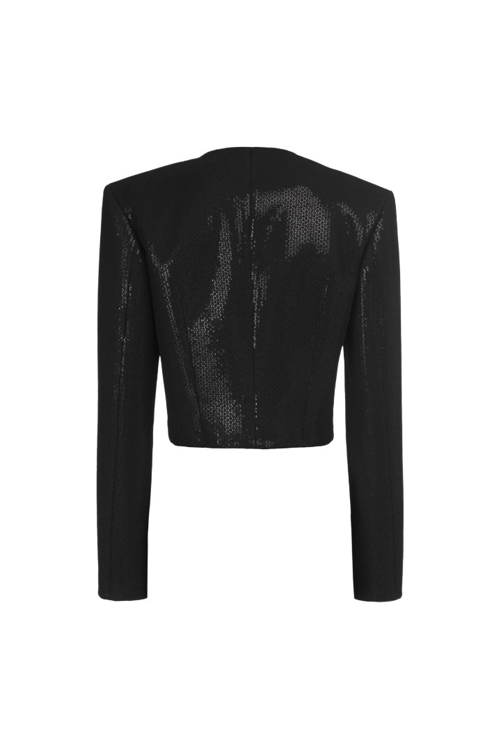 Укороченный полуприталенный жакет с графичными подплечниками. Модель с круглым вырезом без лацканов дополнена крупными акцентными пуговицами. Плотная ткань, декорированная мерцающими пайетками, хорошо держит форму, подчеркивая безупречный крой изделия.