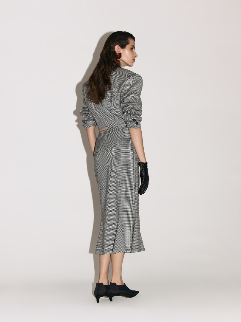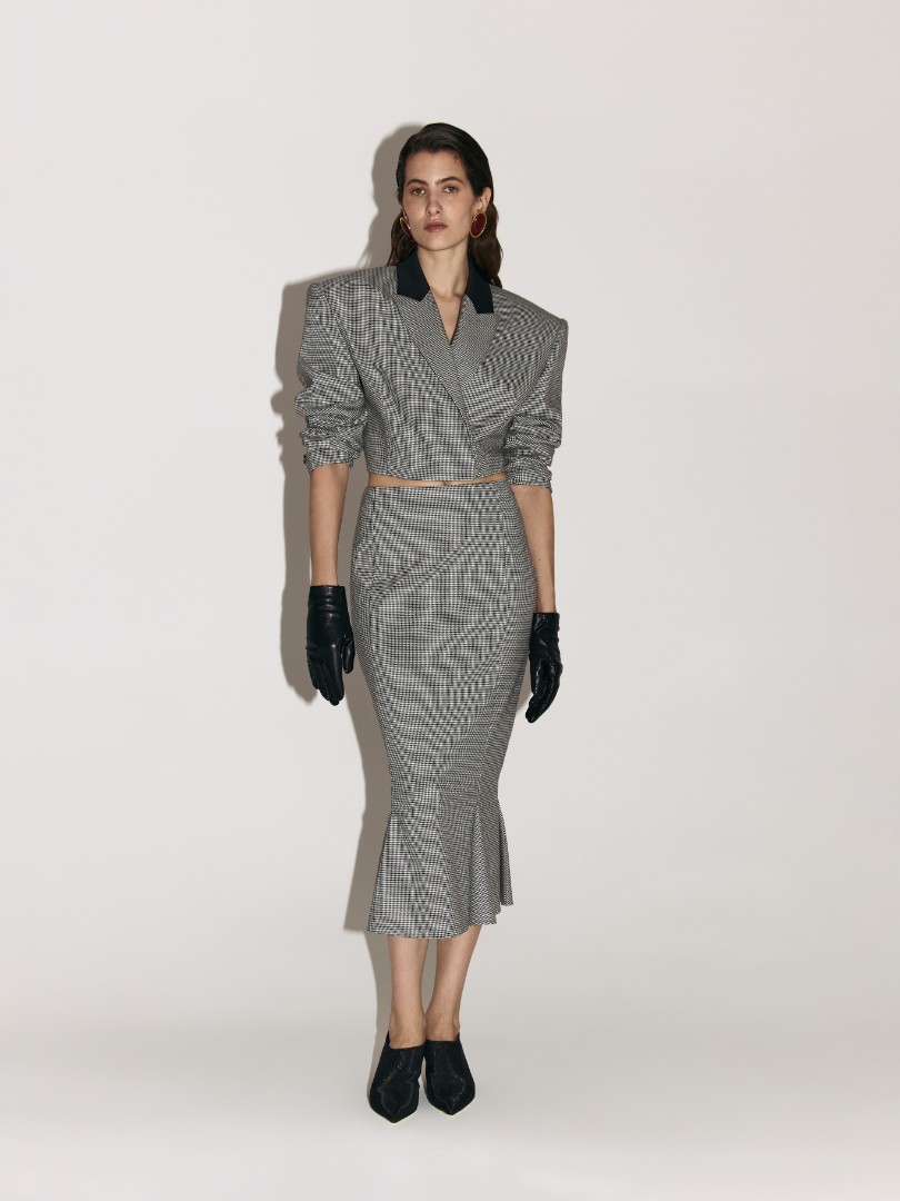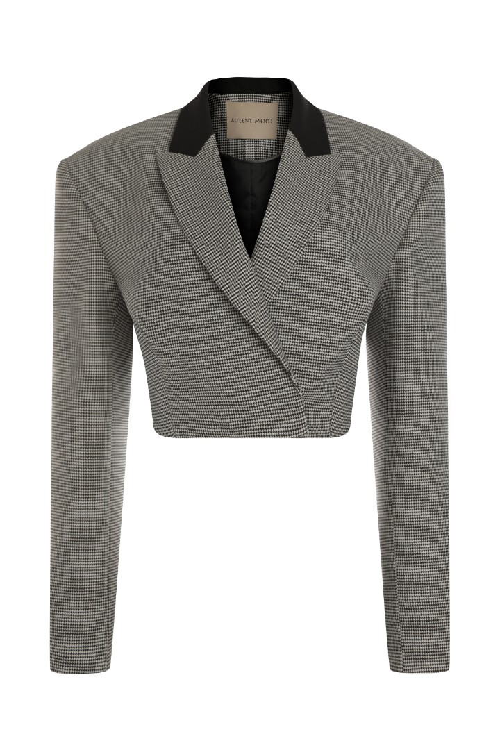 Укороченный жакет приталенного кроя на подкладке. Модель с подплечниками и заостренными лацканами. Контрастная черная вставка на воротнике.