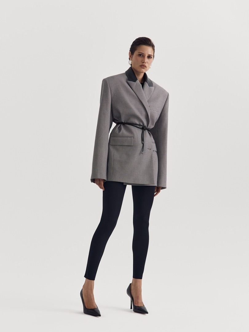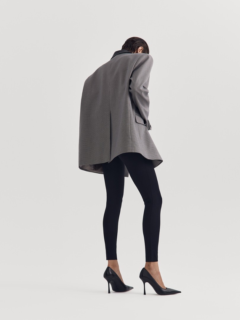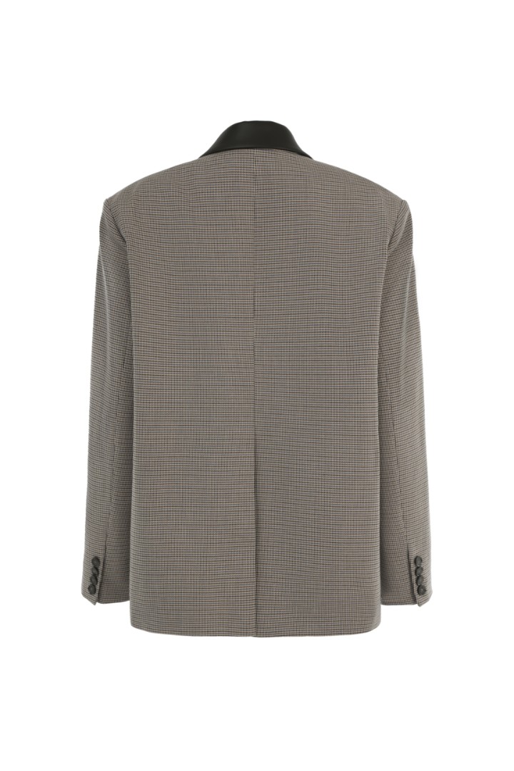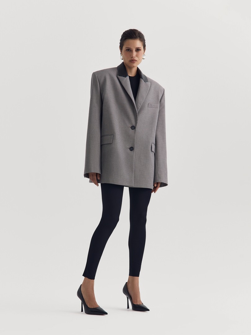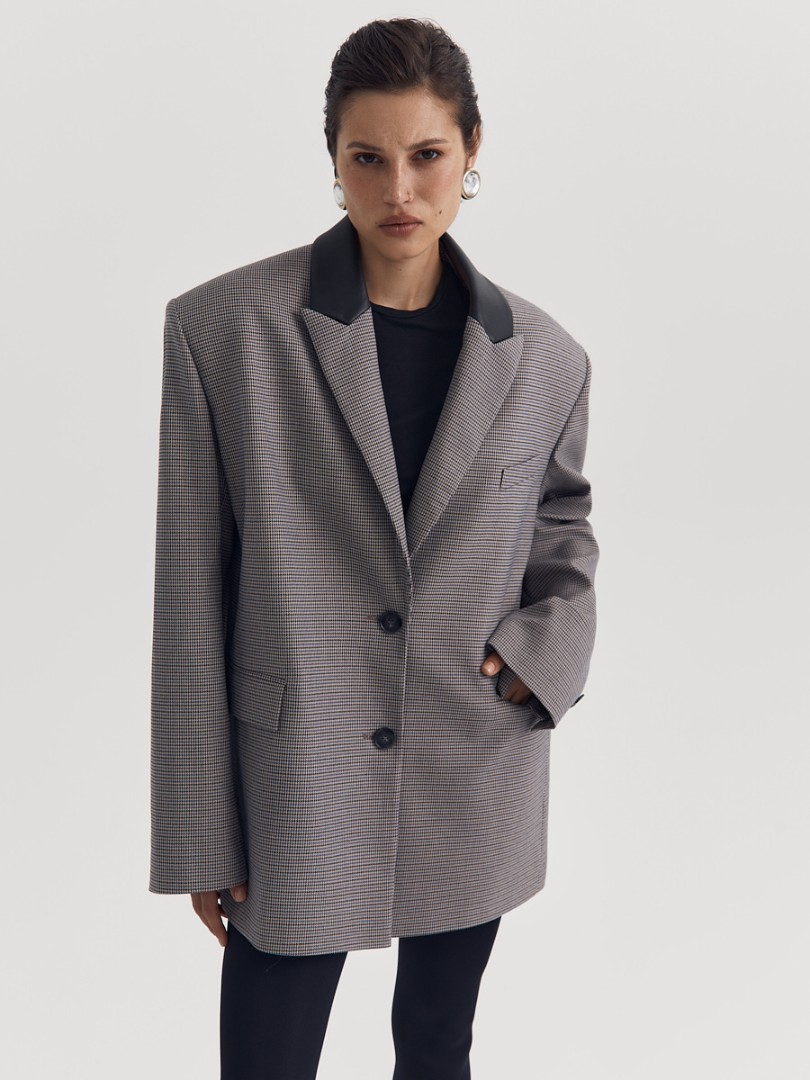 Однобортный оверсайз жакет в гусиную лапку. Прорезные карманы с широкими клапанами, отложной воротник с лацканами и вставкой из натуральной кожи. Застежка на две пуговицы.
