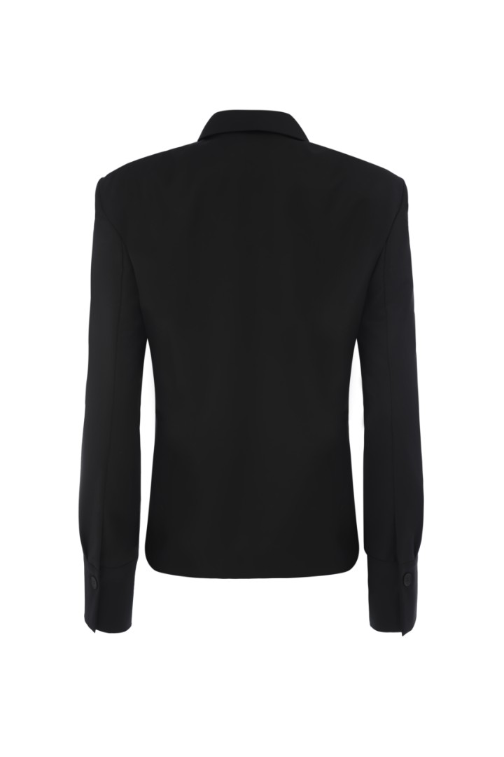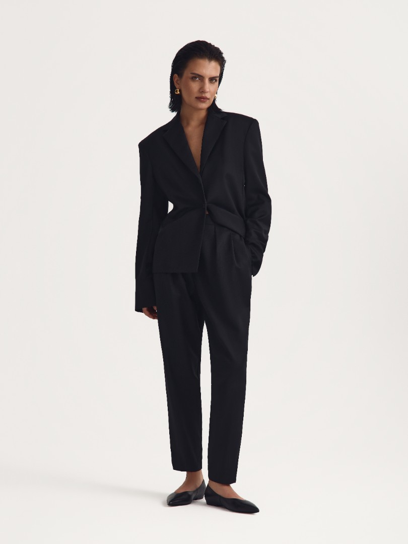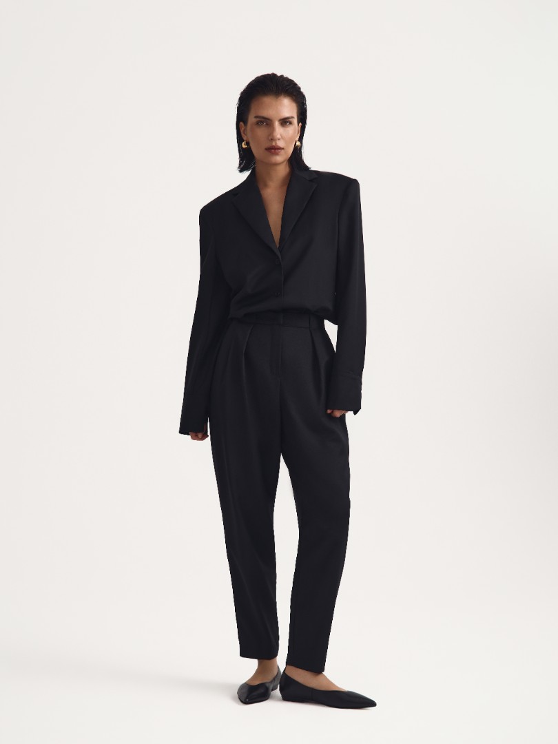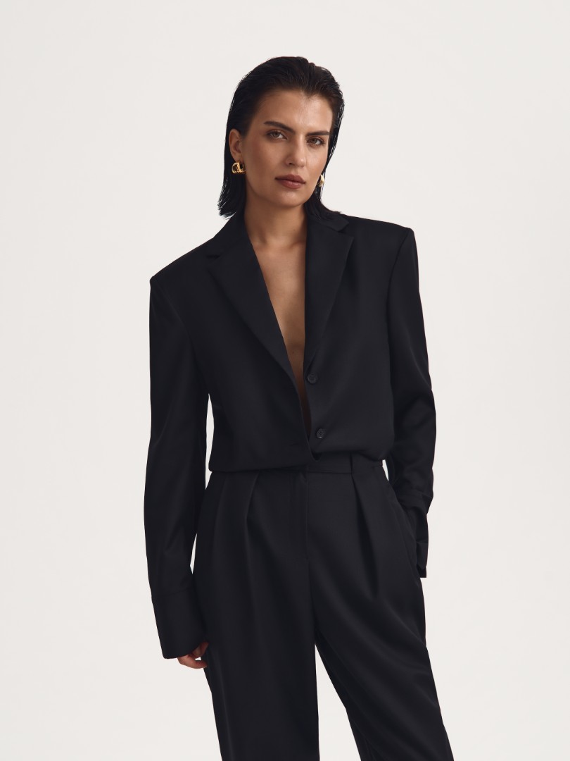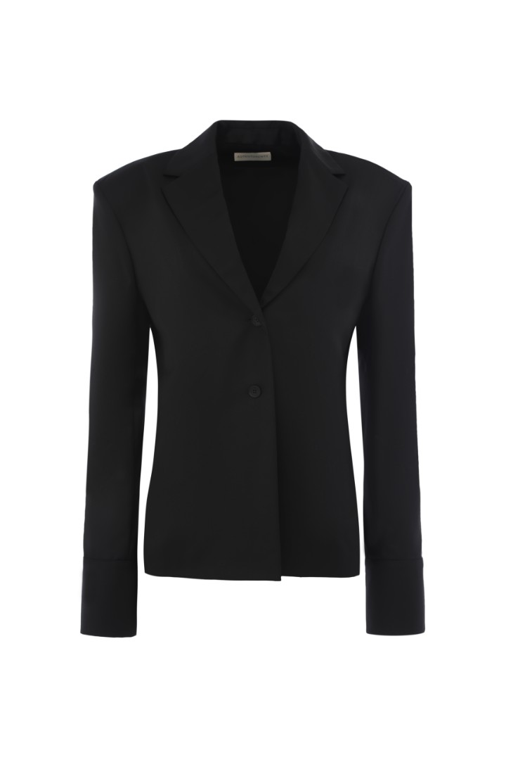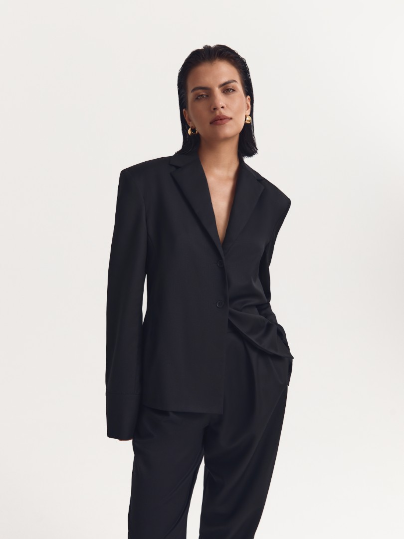 Однобортный жакет из тонкой костюмной ткани. Вшитые подплечники, широкие манжеты и застежка на 2 пуговицы спереди. Плотность ткани позволяет как заправить рубашку в брюки, так и носить навыпуск в качестве жакета.