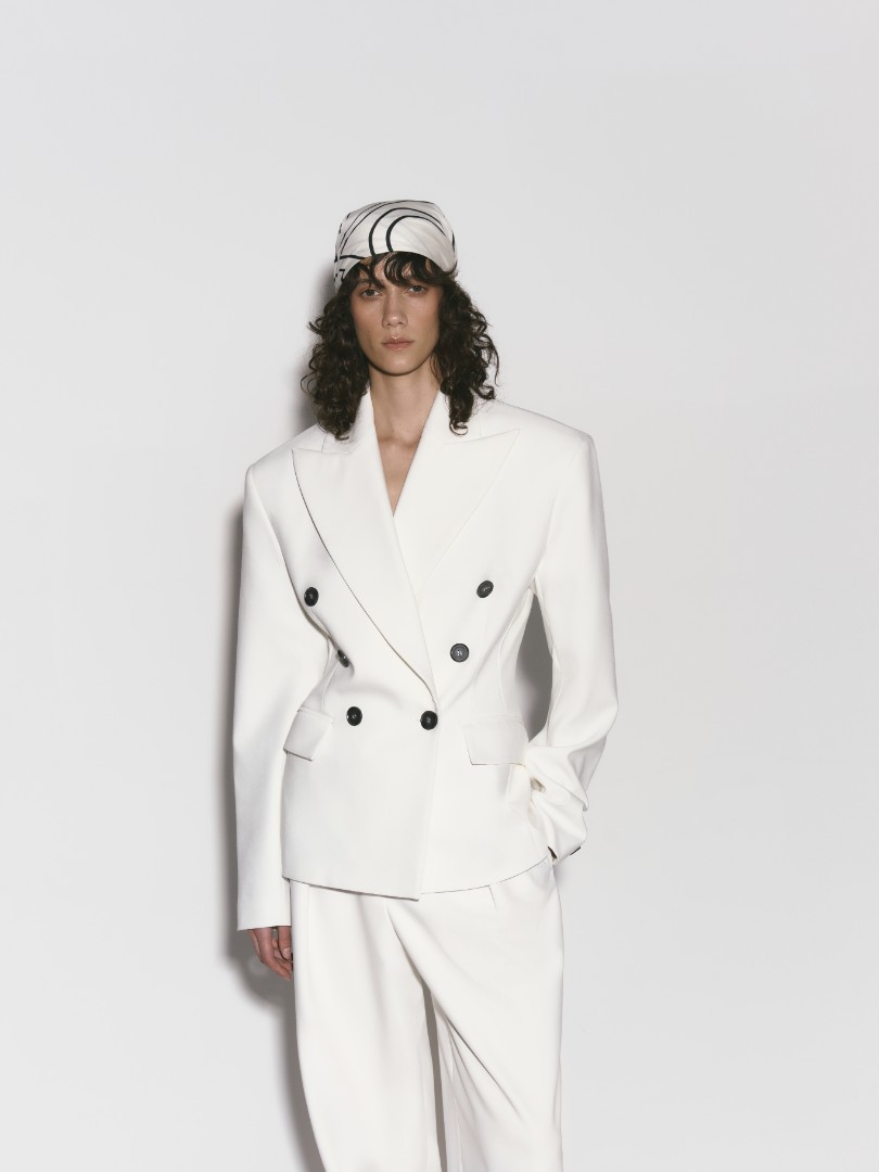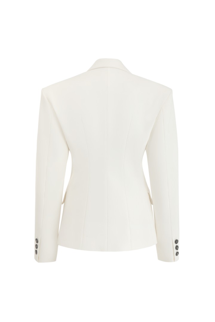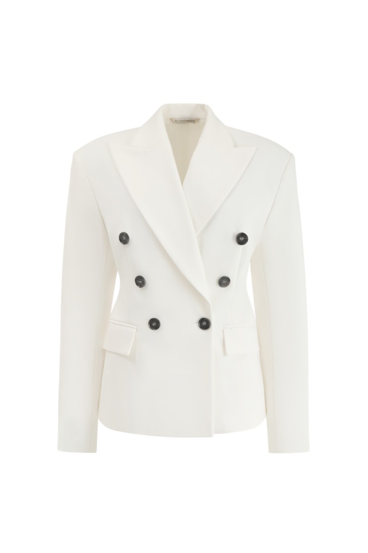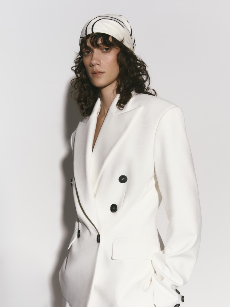 Приталенный двубортный жакет с подплечниками. Два ряда декоративных пуговиц, заостренные лацканы и прорезные карманы с широкими клапанами. Вытачки на спине для лучшей посадки по фигуре.