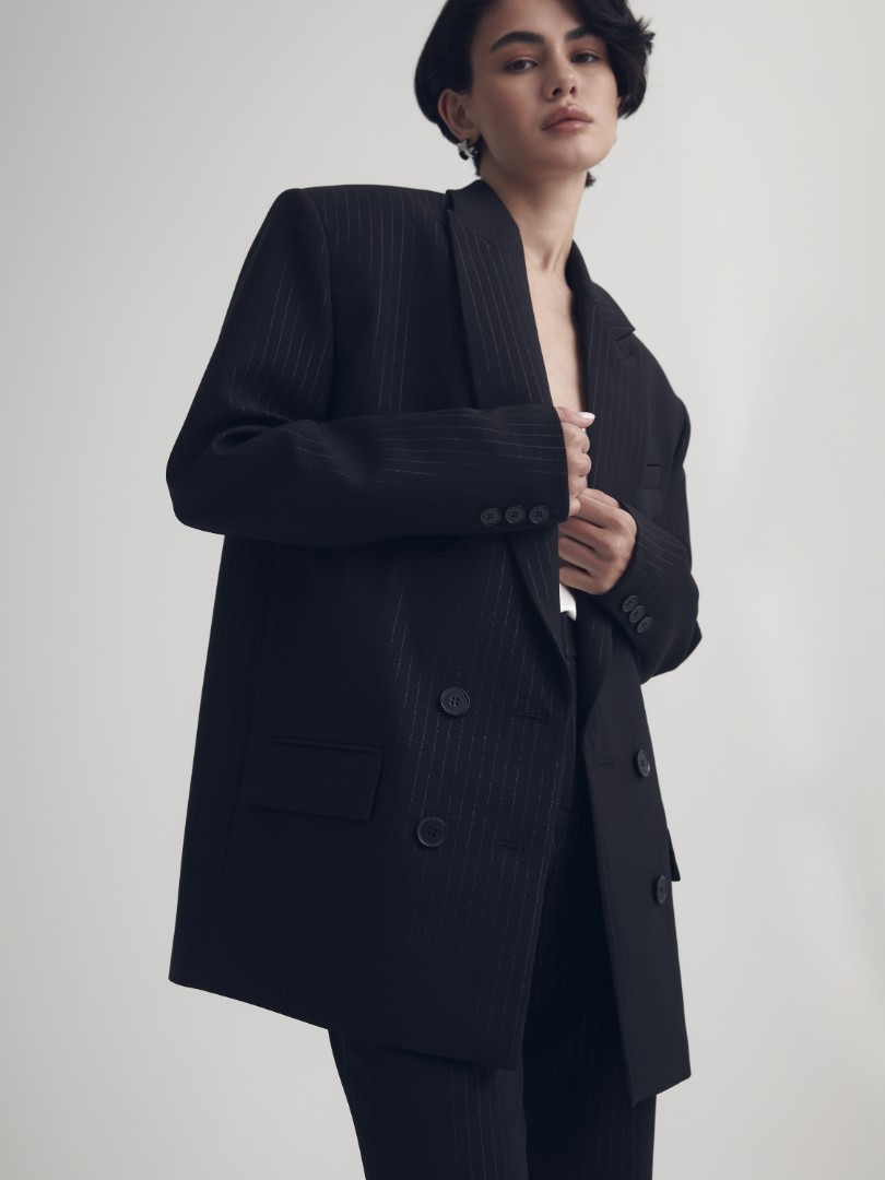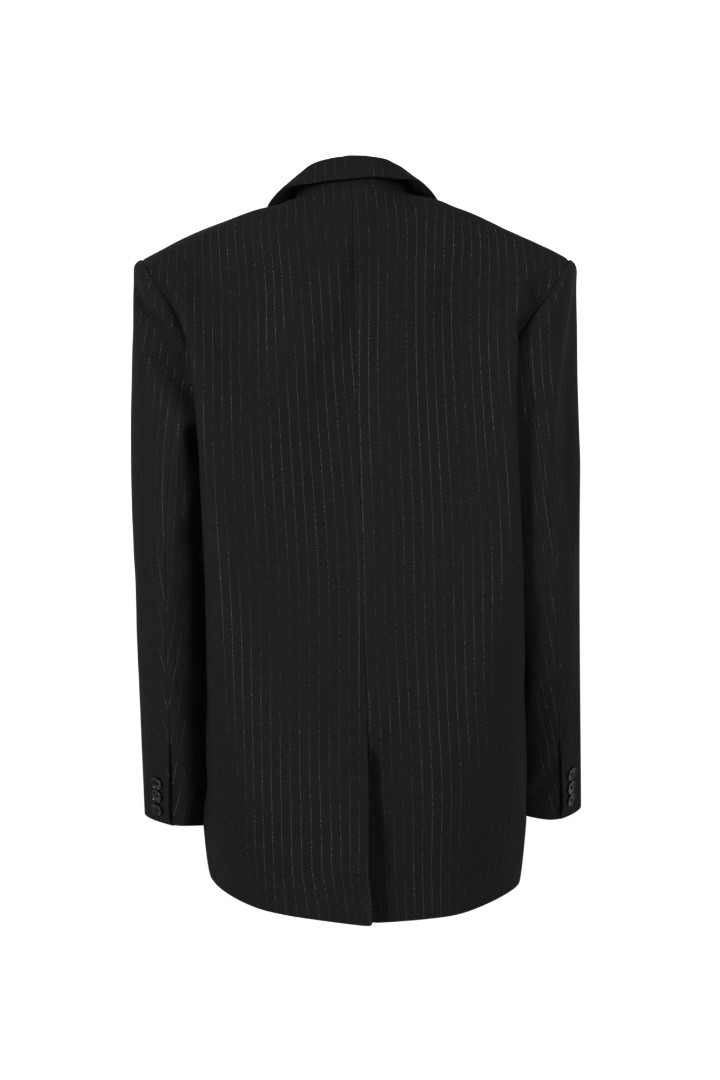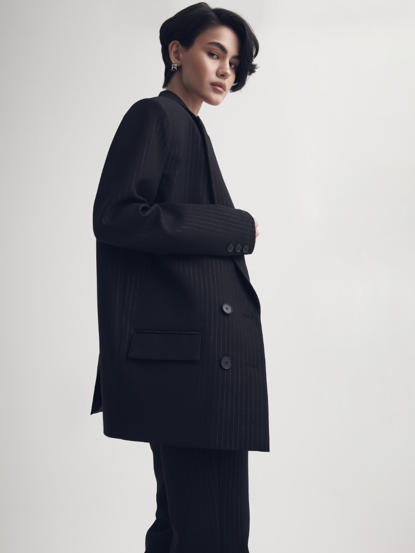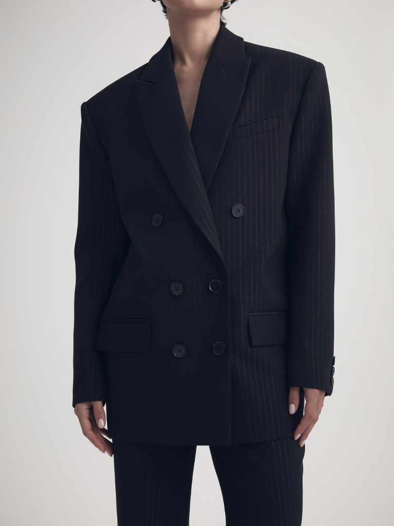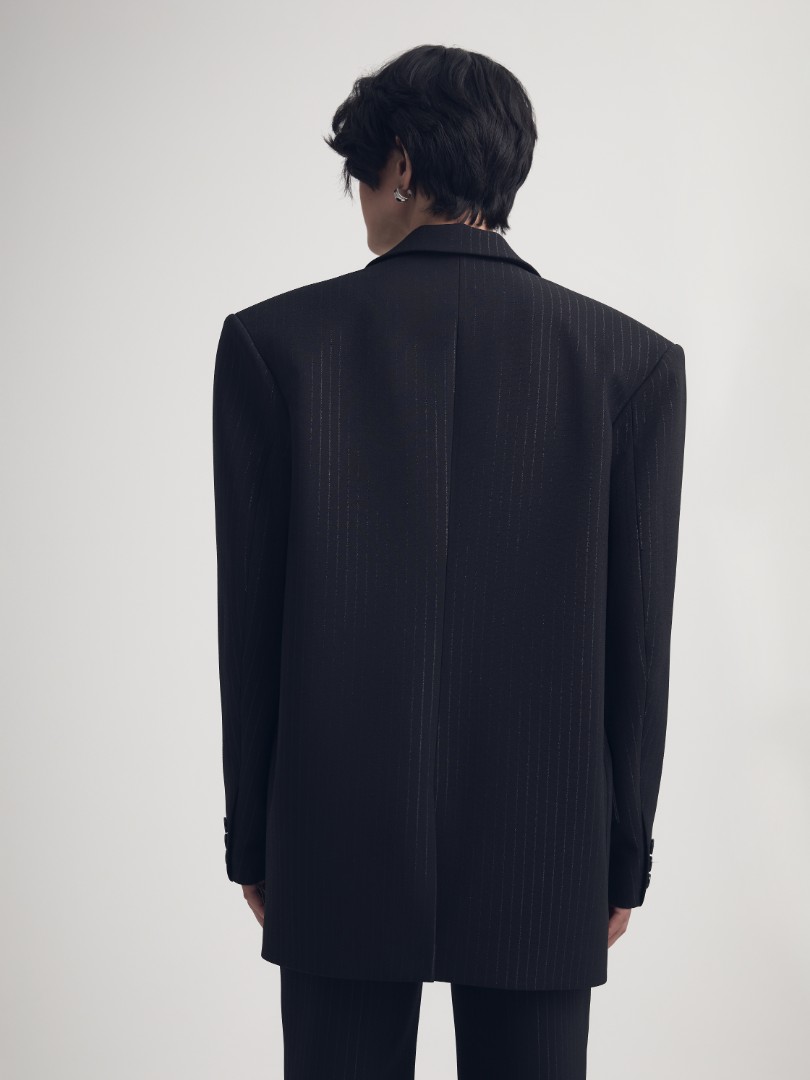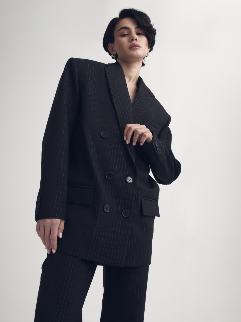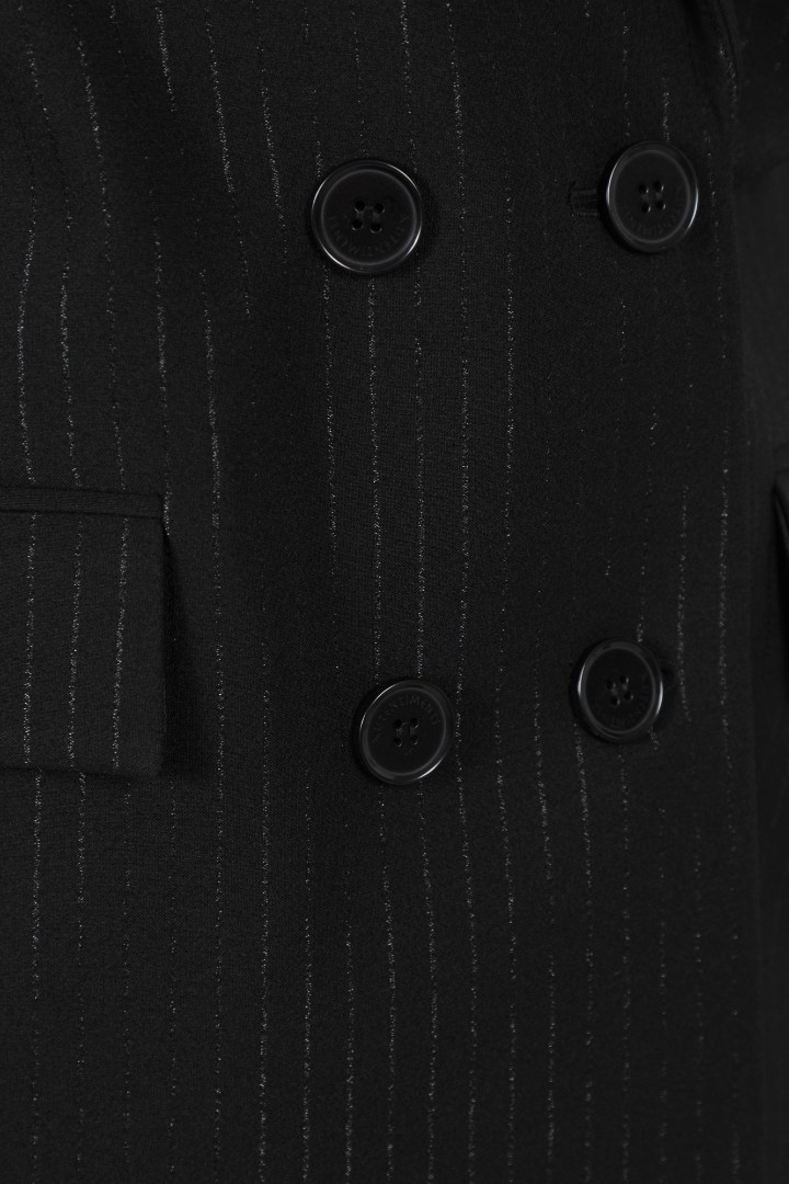 Двубортный жакет объемного кроя. Модель с традиционным отложным воротником с лацканами дополнена подплечниками и карманами с широкими клапанами. Черная костмюмная ткань декорирована тонкой вертикальной полоской с легким мерцанием.