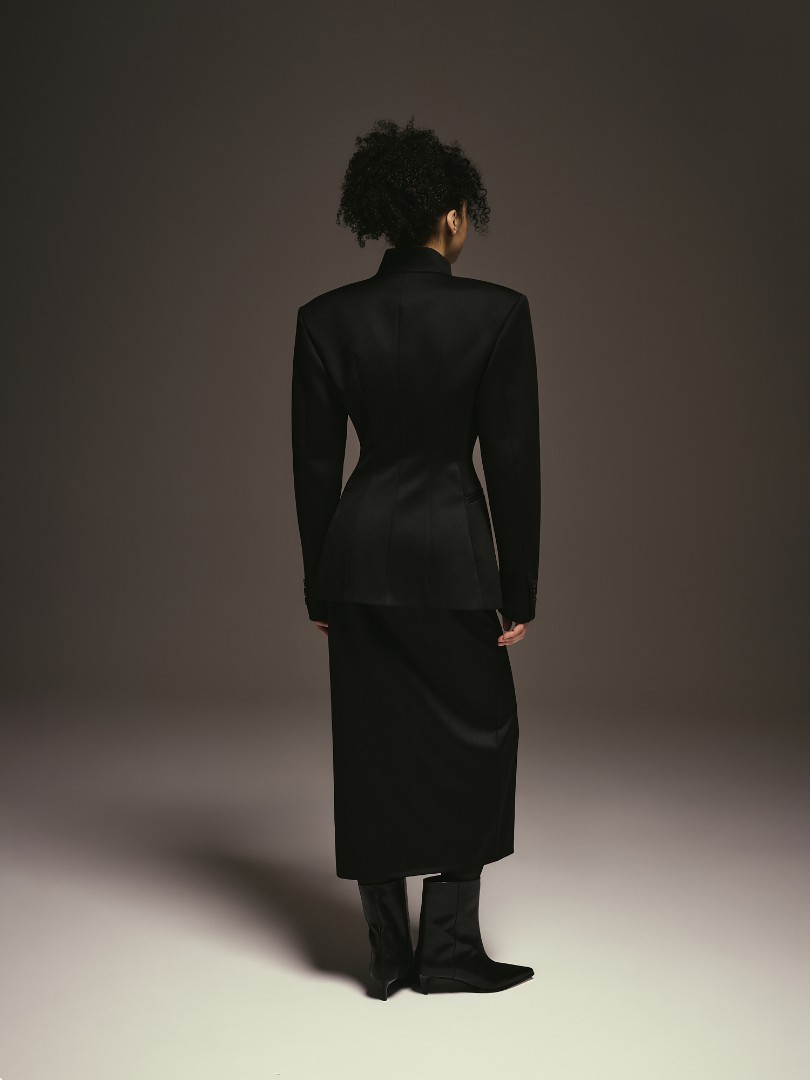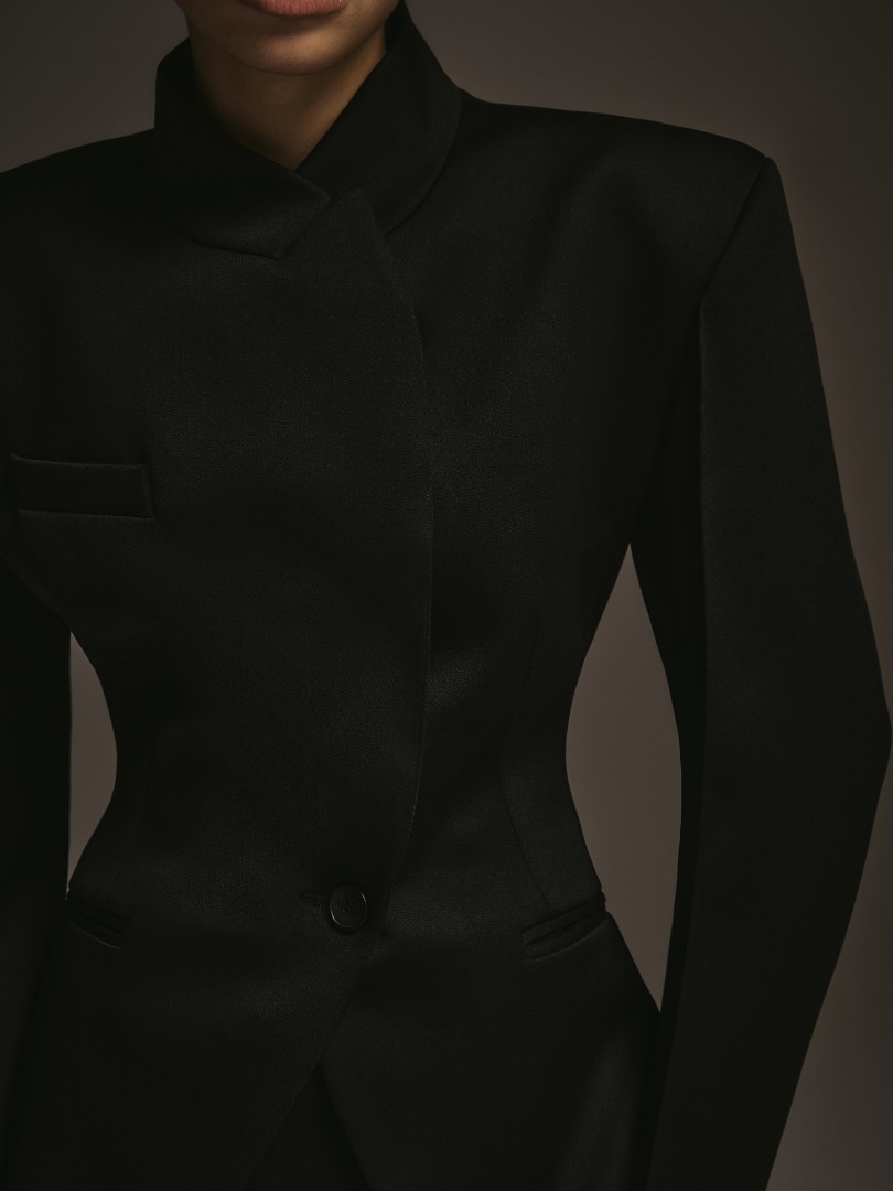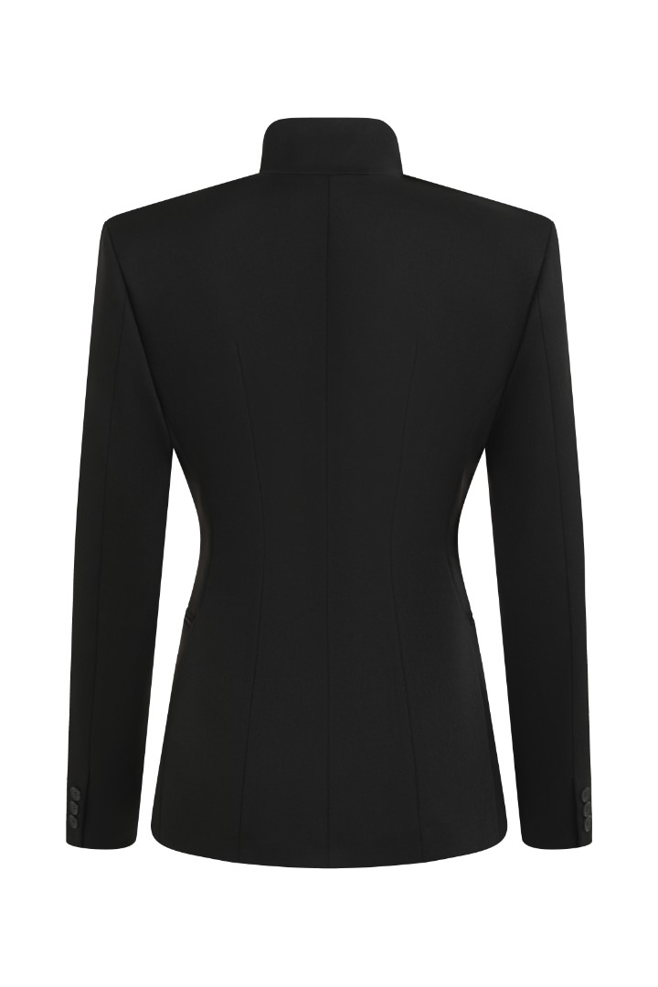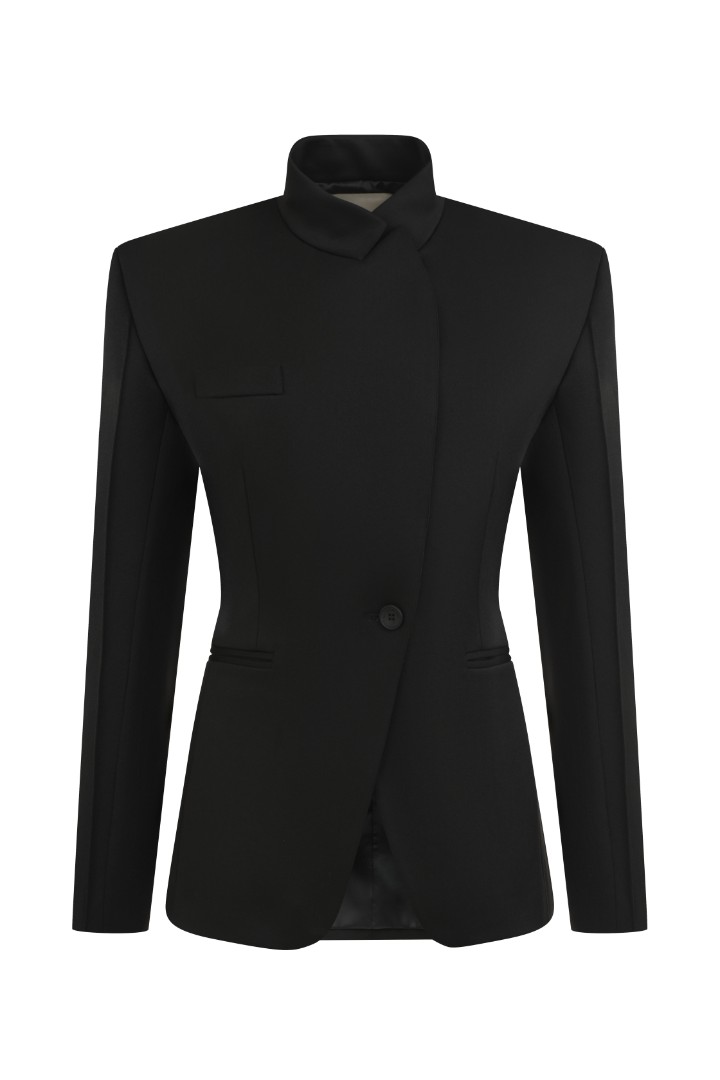 Приталенный жакет с застёжкой на пуговицу и магнит на лацкане. Модель с подплечниками, фигурной линией борта и воротником-стойкой.