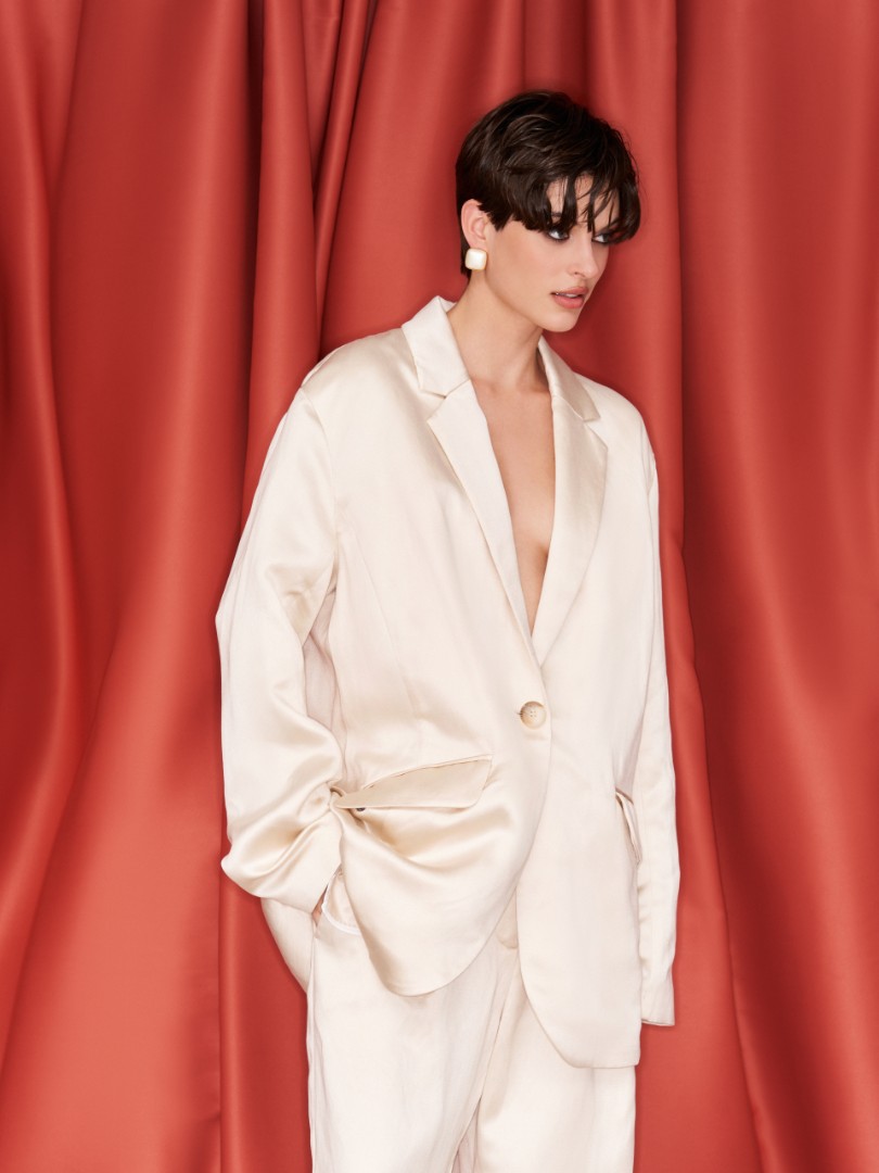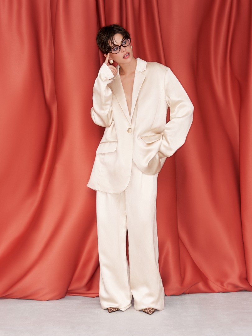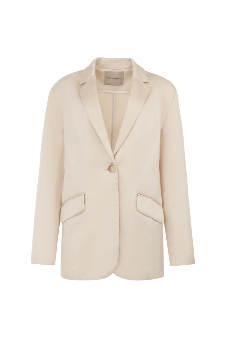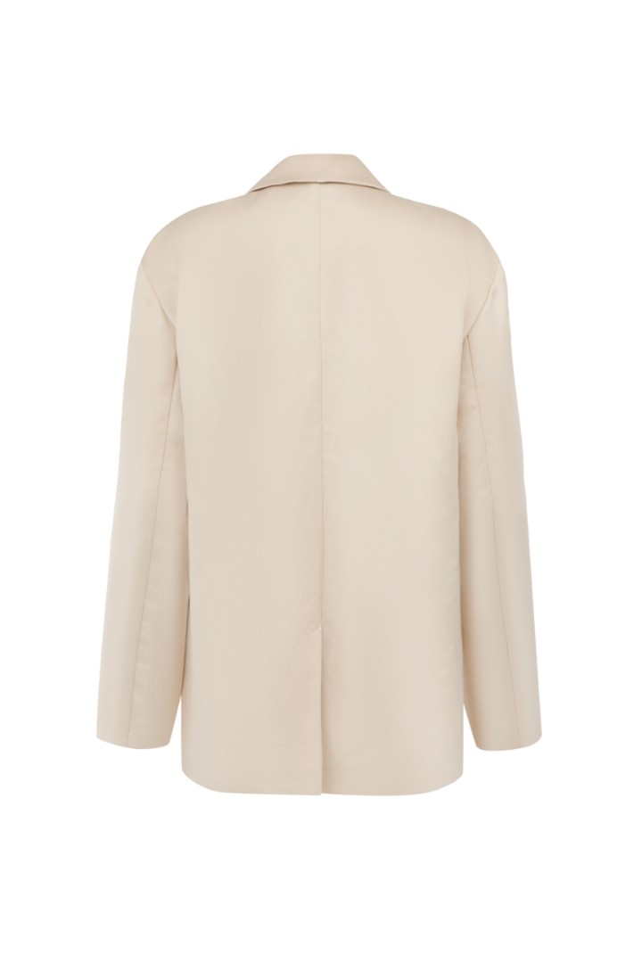 Однобортный жакет свободного кроя на двух пуговицах с врезными карманами и широкими клапанами. Модель «с мужского плеча» окутывает нежностью: волокна льна объединили с гладким лиоцеллом, который придал ткани деликатный сатиновый блеск и прочность. Создает безупречный сет в сочетании с брюками RICH WIFE из той же ткани.