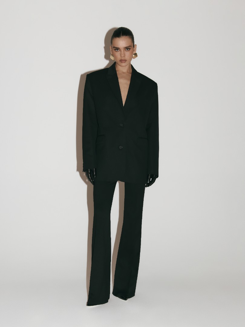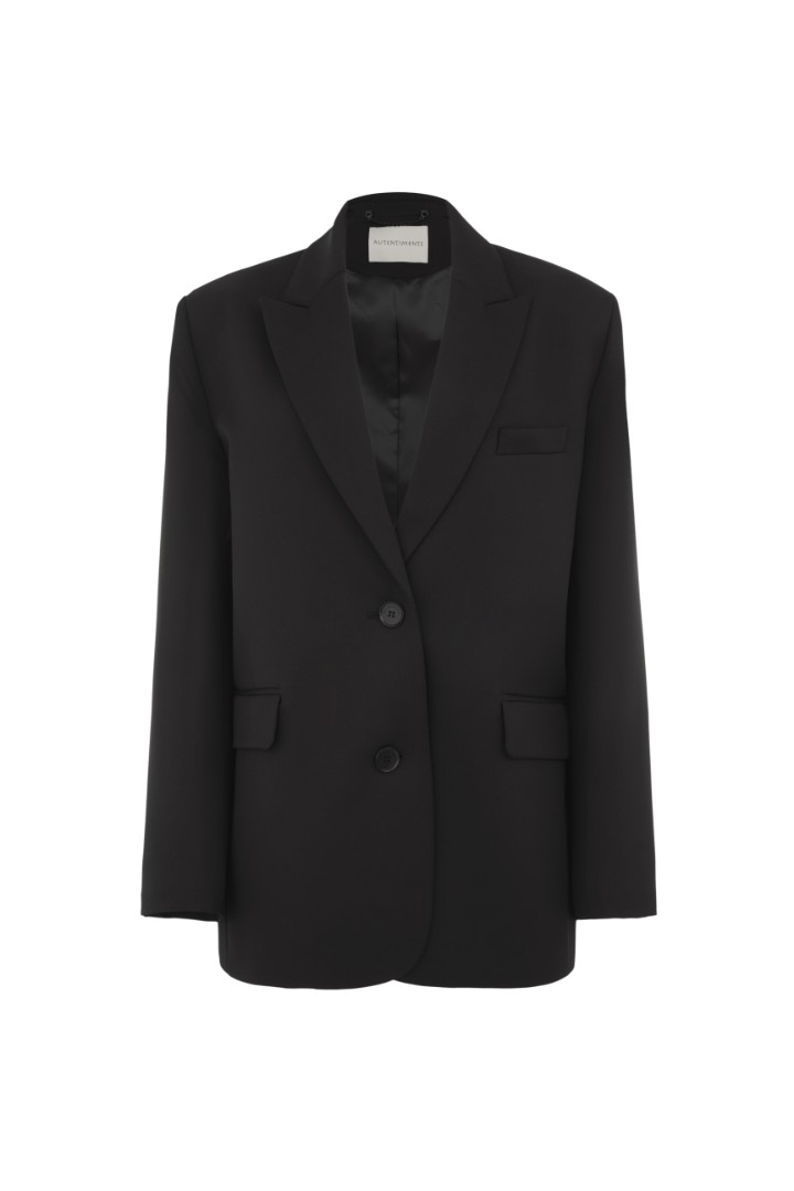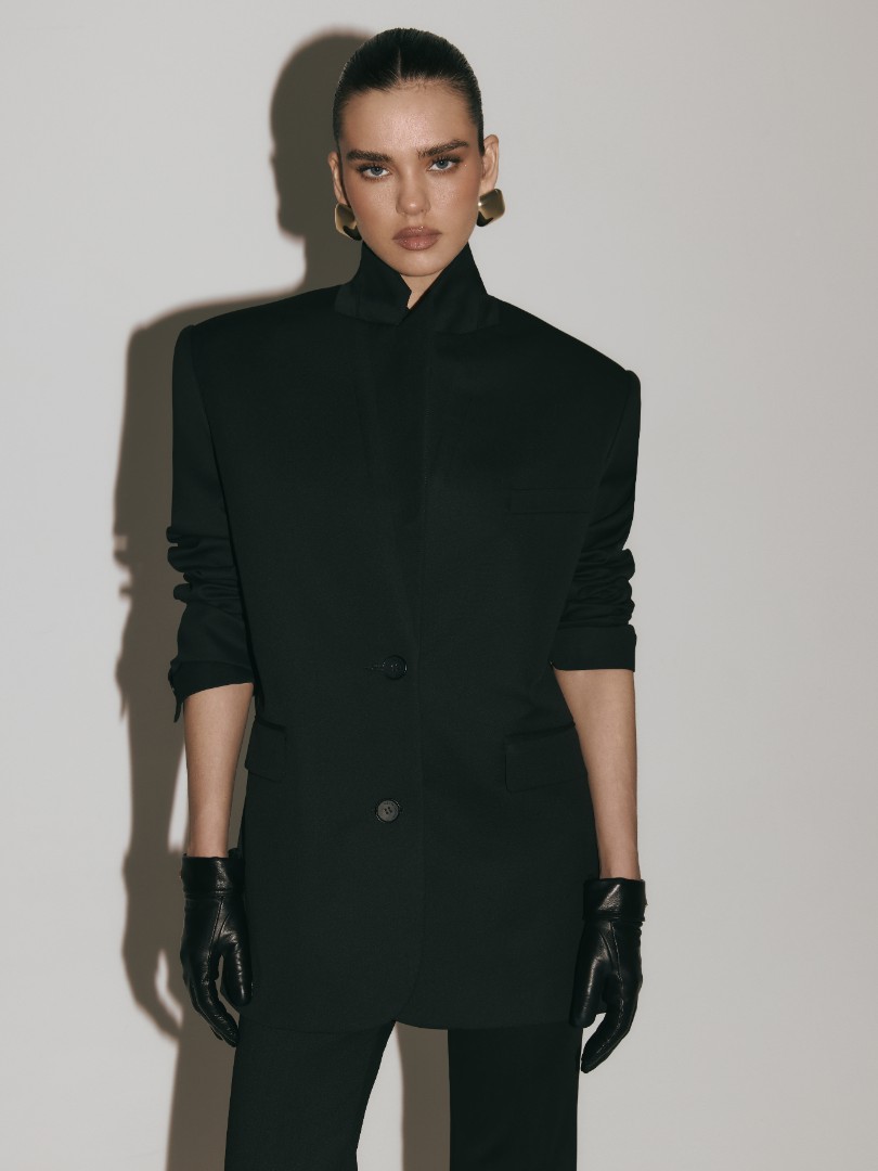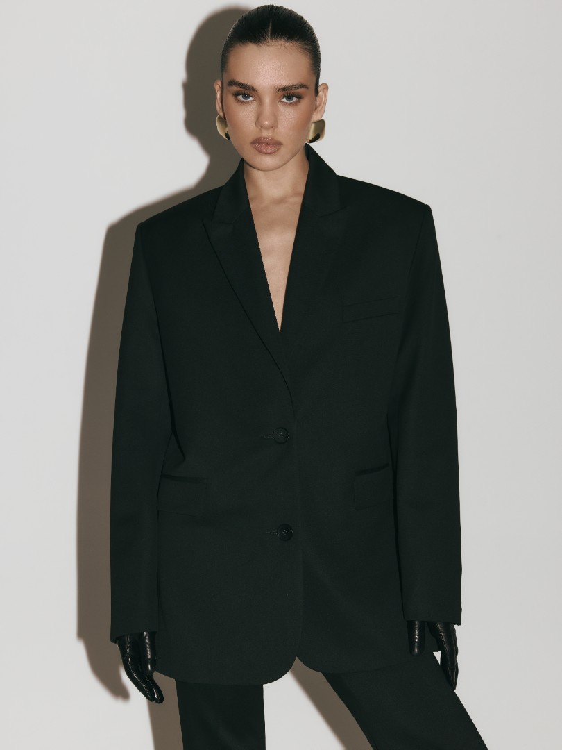 Однобортный жакет оверсайз кроя из плотной костюмной ткани. Модель с подплечниками, двумя карманами с широкими клапанами и застежкой на две пуговицы.