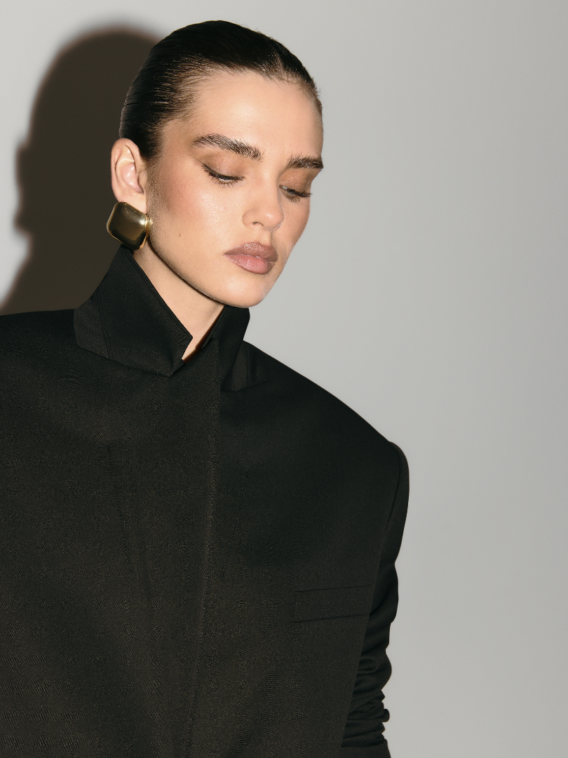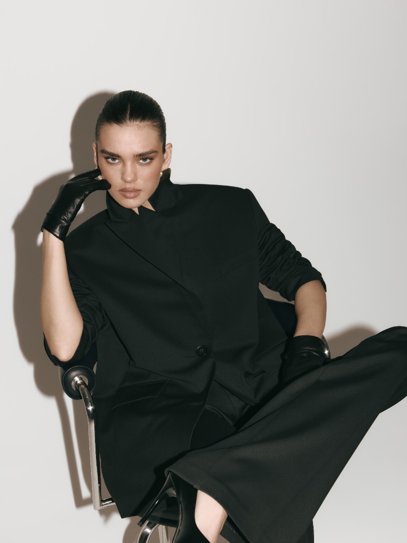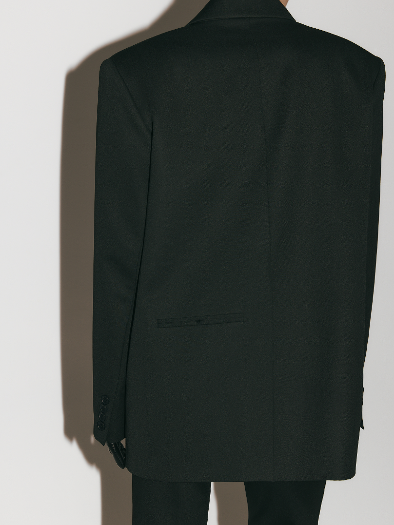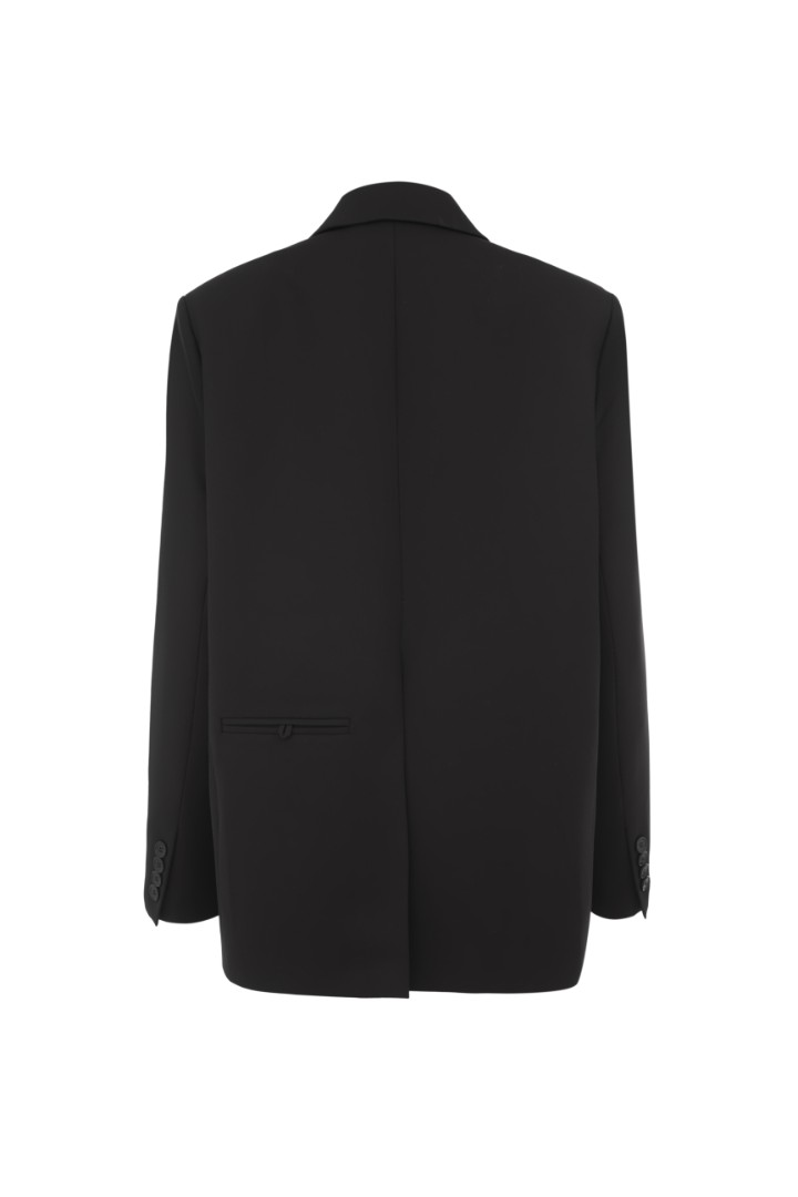 Однобортный жакет оверсайз кроя из плотной костюмной ткани. Модель с подплечниками, двумя карманами с широкими клапанами и застежкой на две пуговицы.