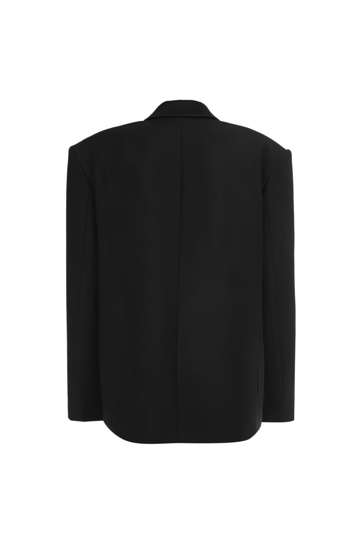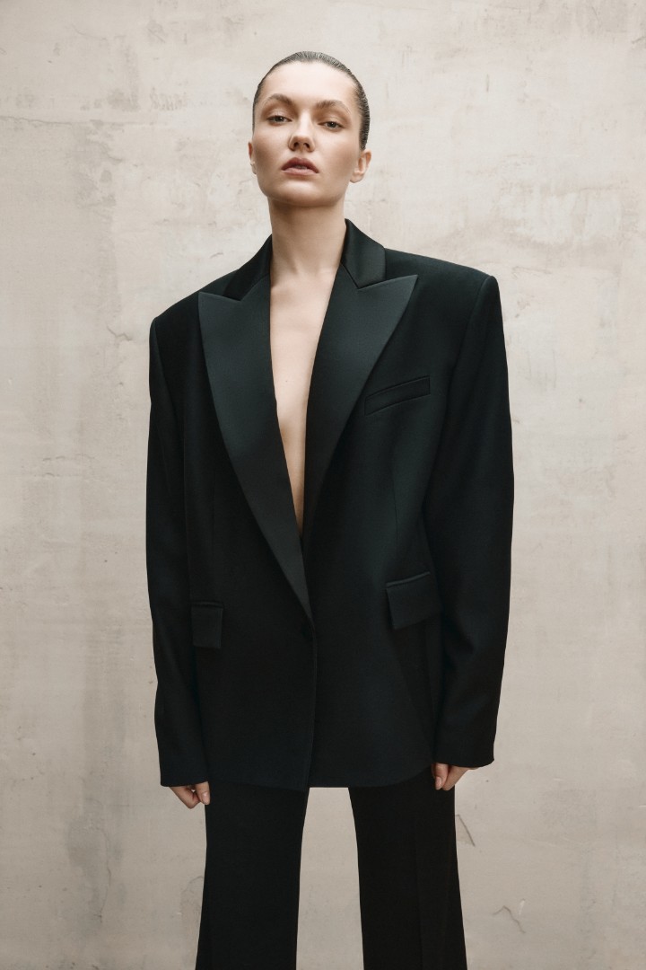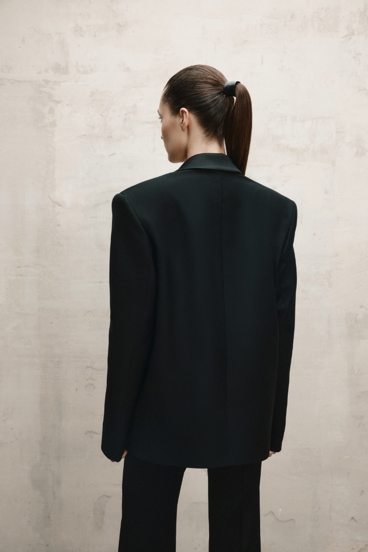 Оверсайз жакет с лацканами из вискозного шелка атласного переплетения. Модель с усиленной линией плеча изготовлена из костюмной шерсти с добавлением шелка. Для создания безупречной костюмной пары сочетайте жакет с брюками SMOKING KILLS из той же ткани.