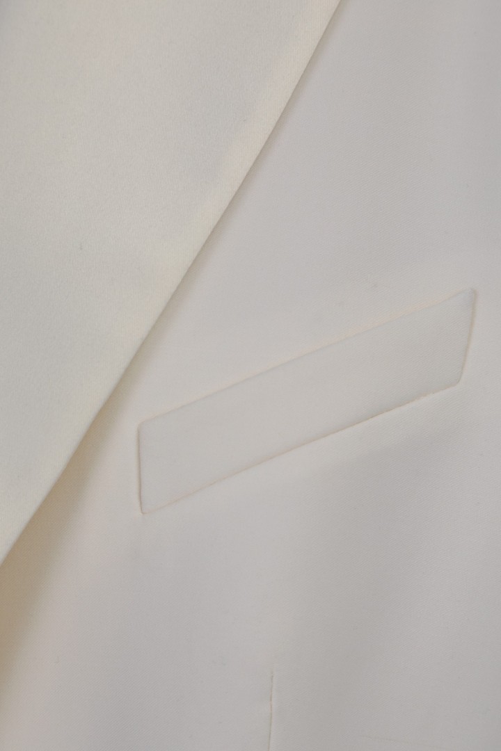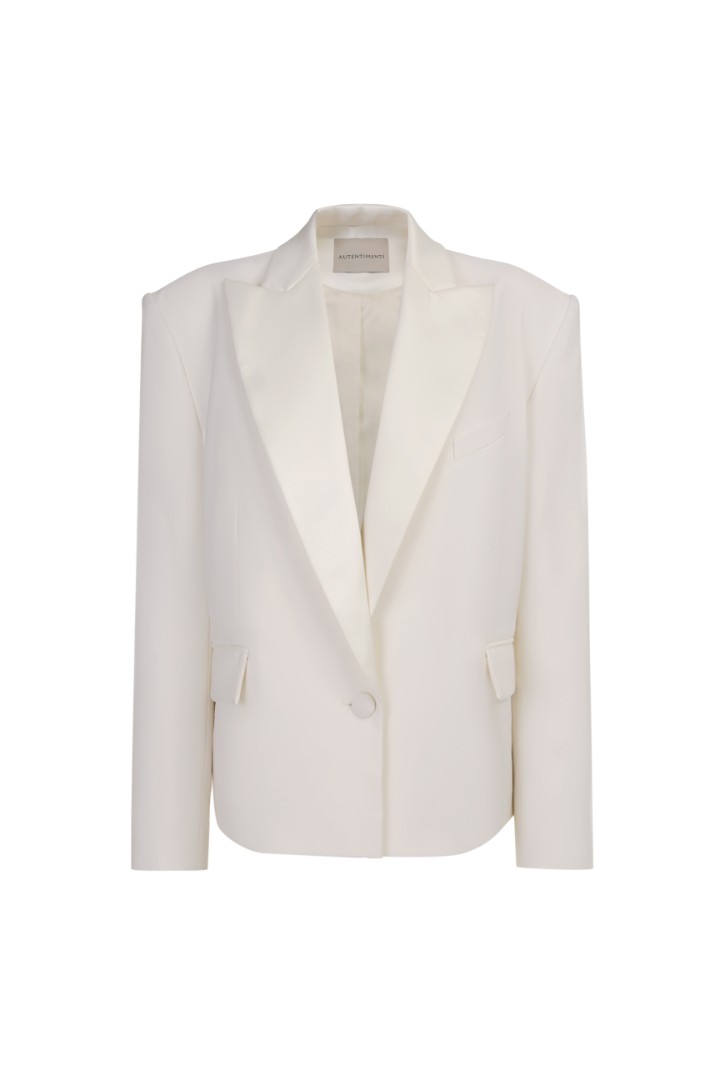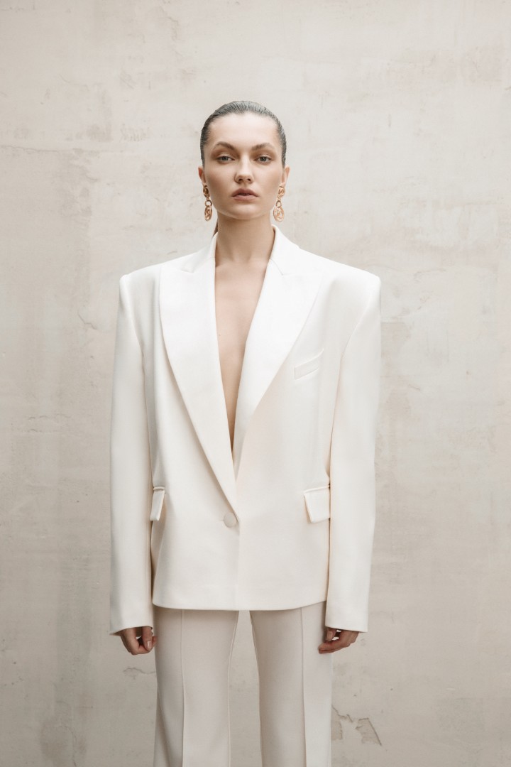 Оверсайз жакет с лацканами из вискозного шелка атласного переплетения. Модель с усиленной линией плеча изготовлена из костюмной шерсти с добавлением шелка. Для создания безупречной костюмной пары сочетайте жакет с брюками SMOKING KILLS из той же ткани.