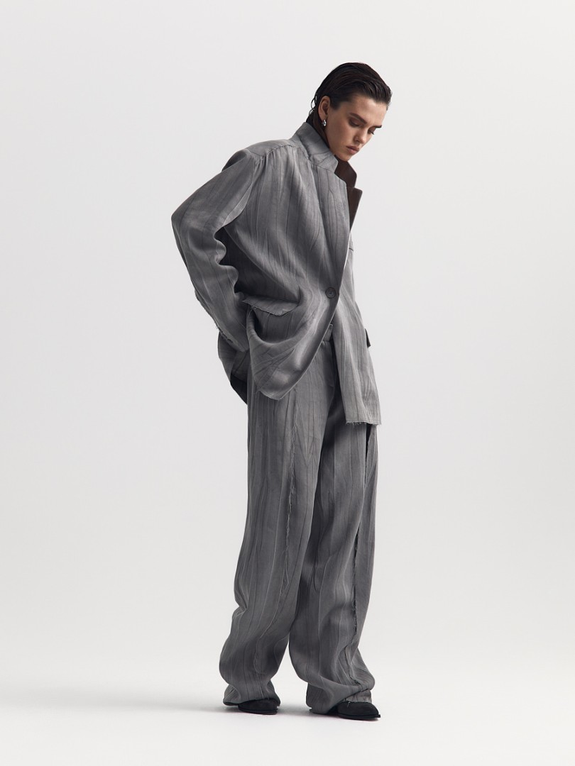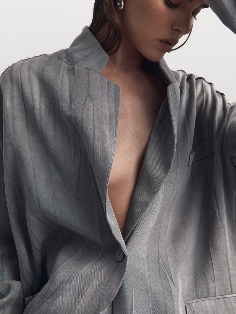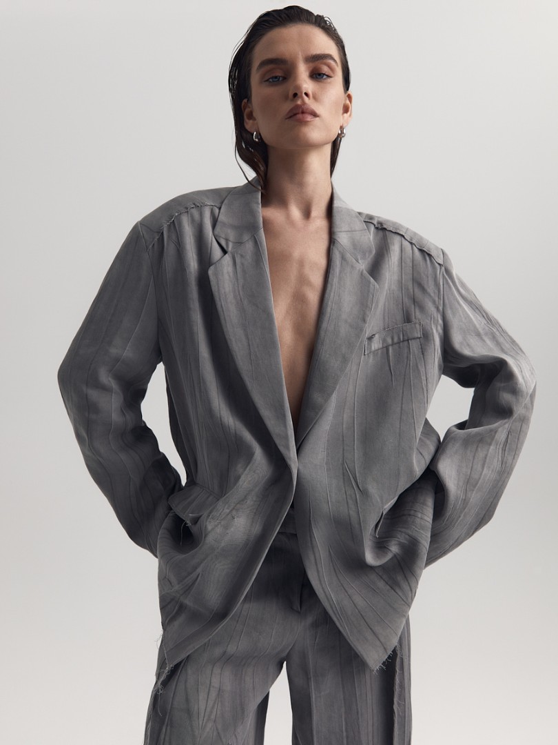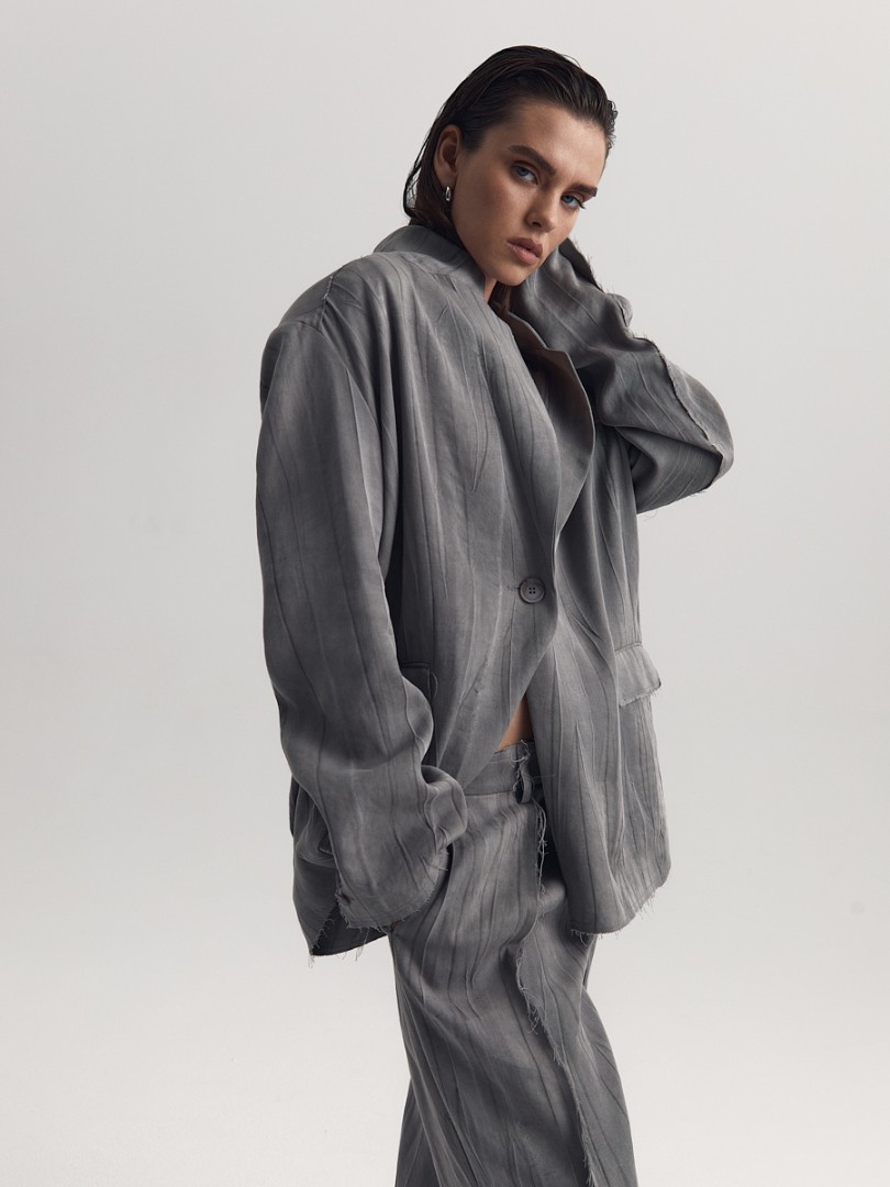 Жакет из жатой ткани с легким эффектом washed out. Однобортная модель декорирована необработанными швами на рукавах, клапанах и нижнем крае изделия.