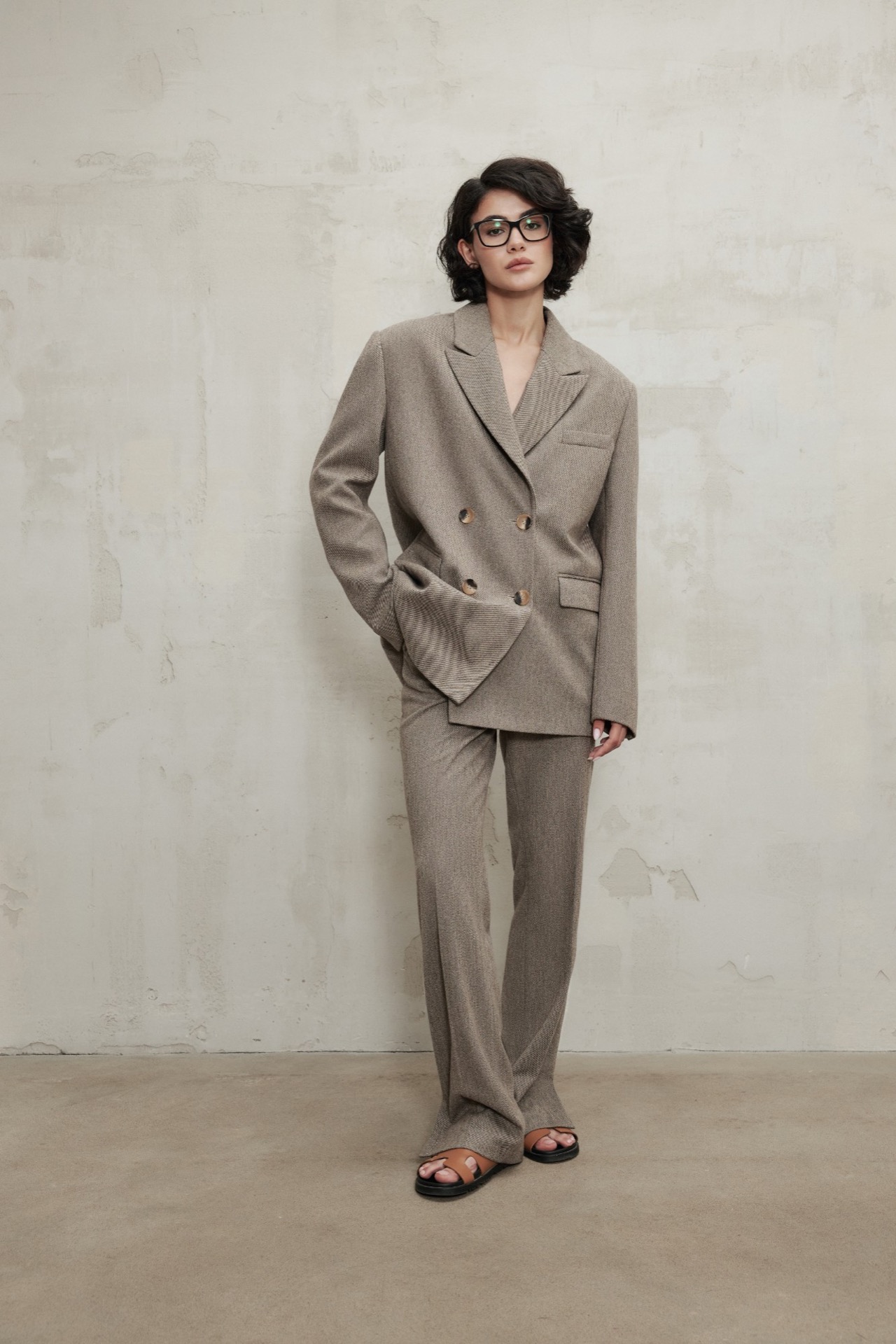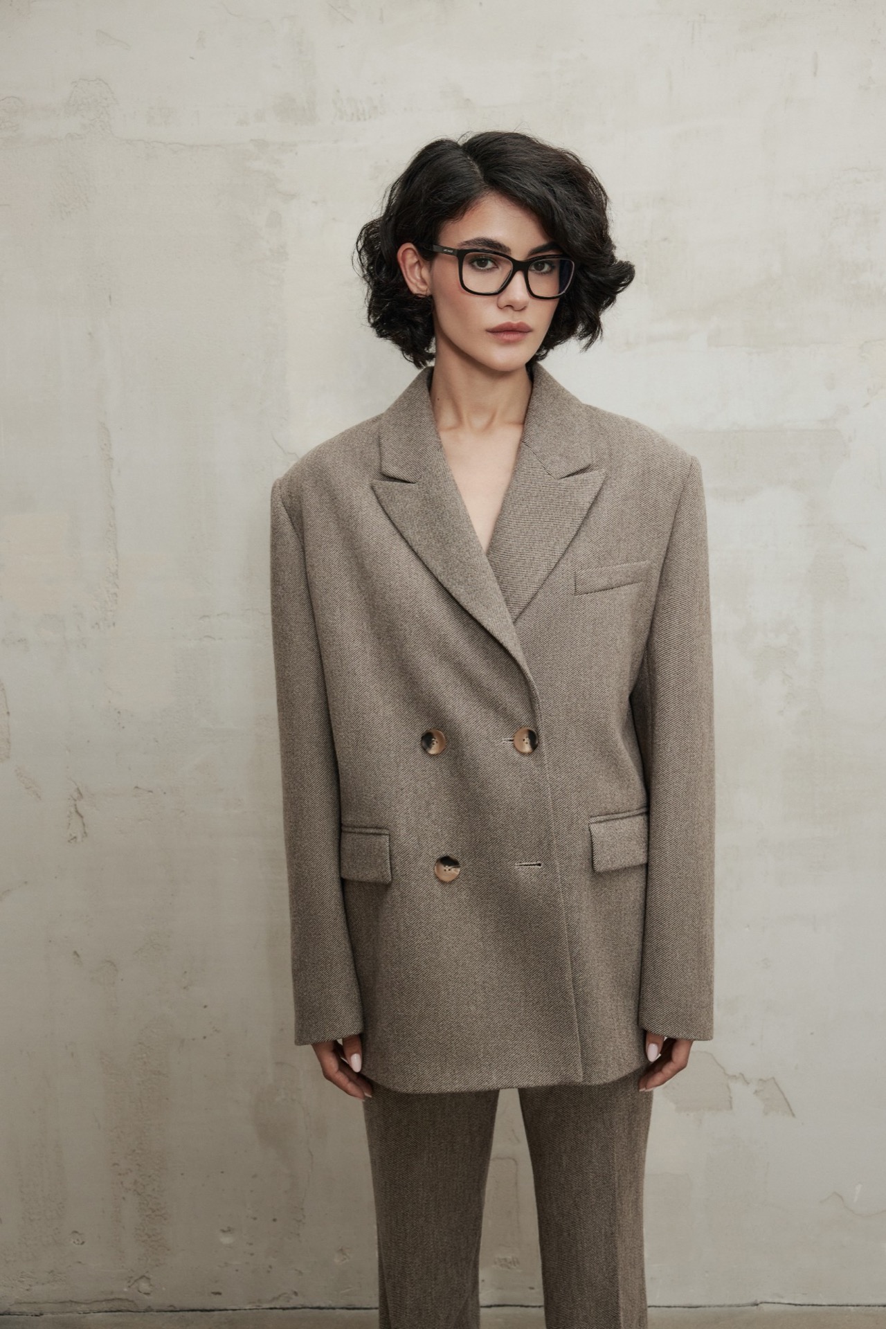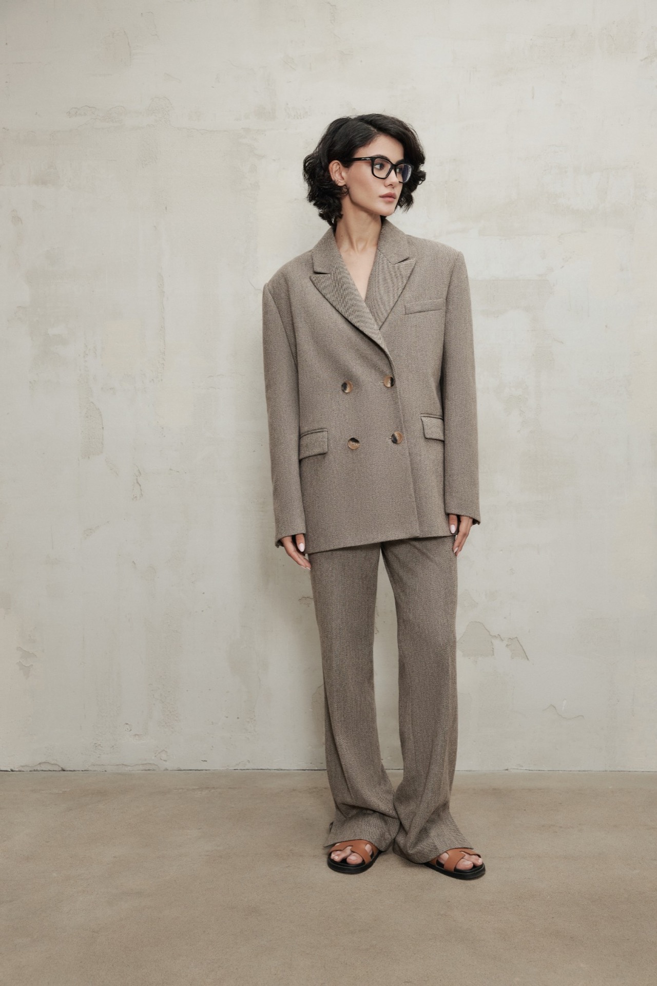 Двубортный жакет из плотной костюмной ткани. Модель дополнена графичными подплечниками и врезными боковыми карманами с широкими клапанами. Для создания костюма сочетайте эту модель с брюками TEDDY из нашей коллекции, а в прохладную погоду носите жакет в качестве элемента верхней одежды.