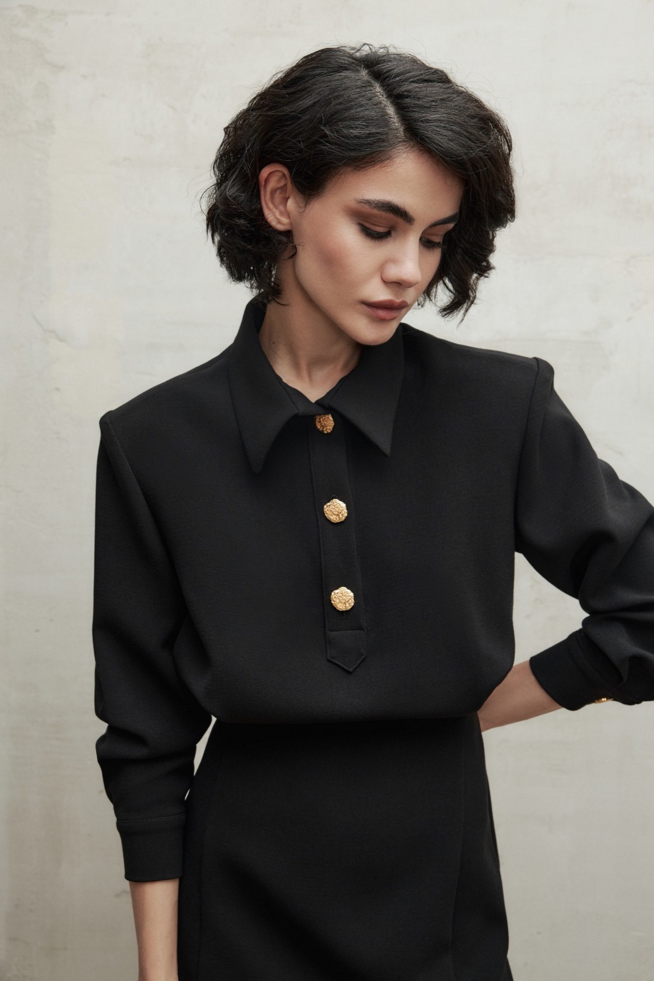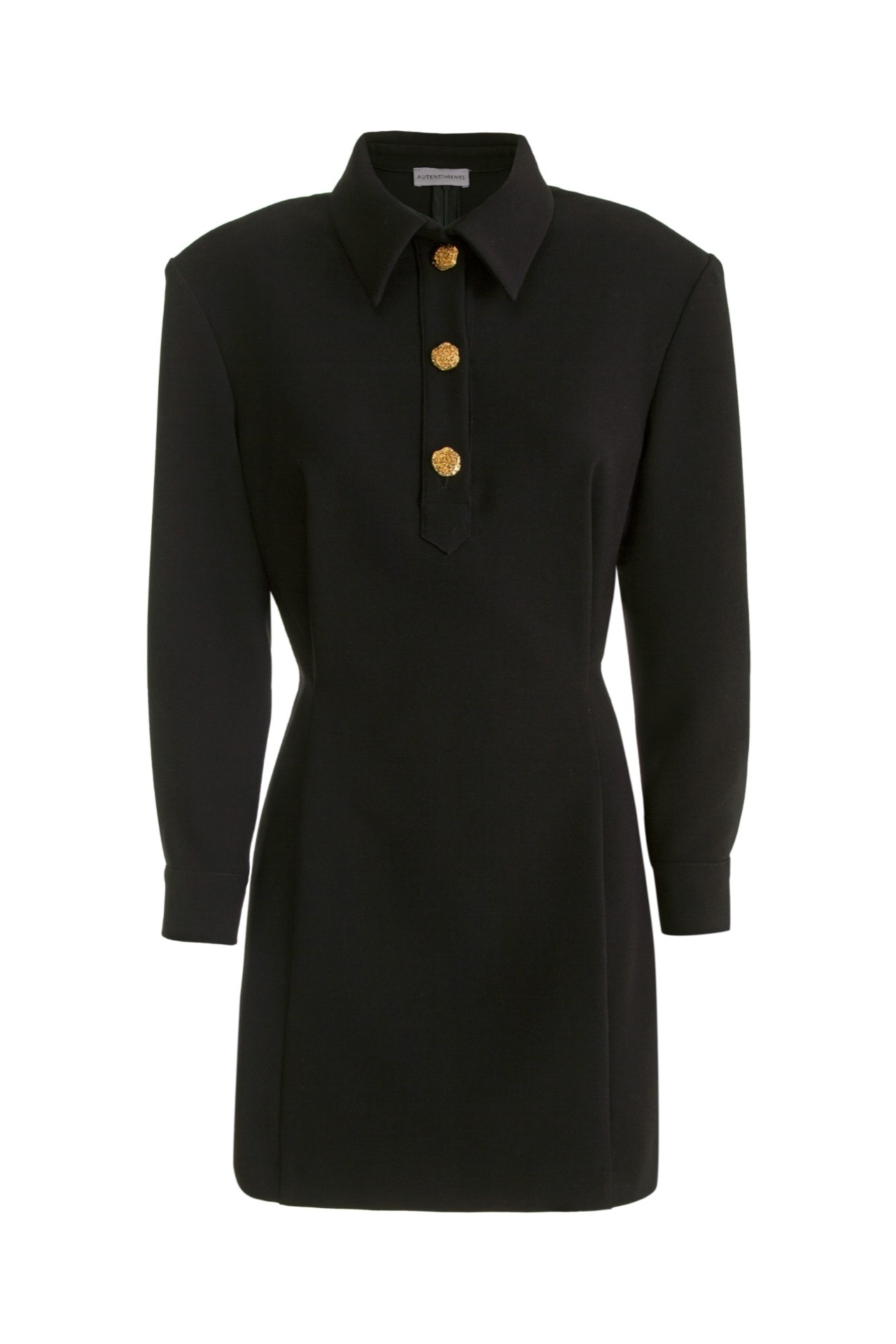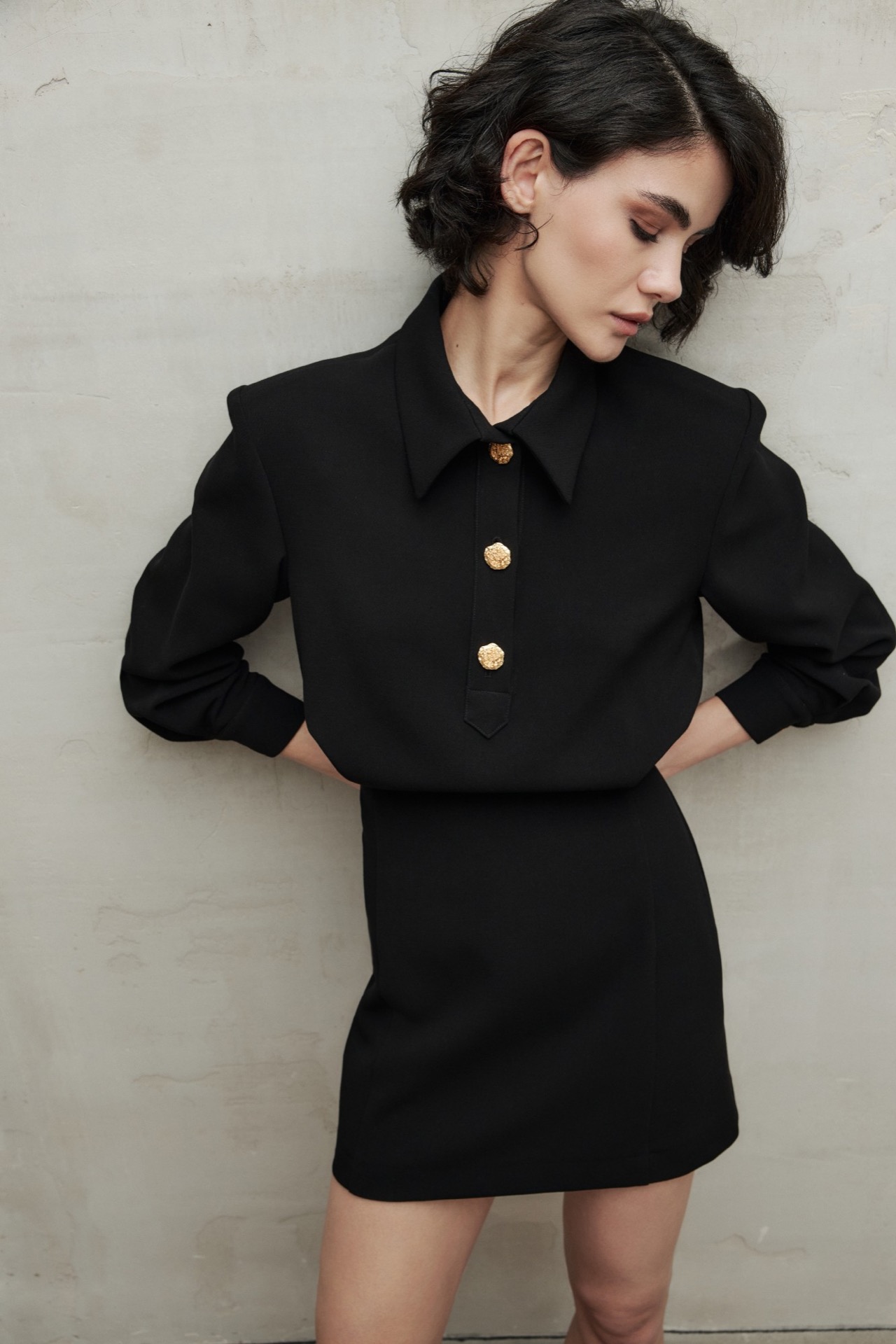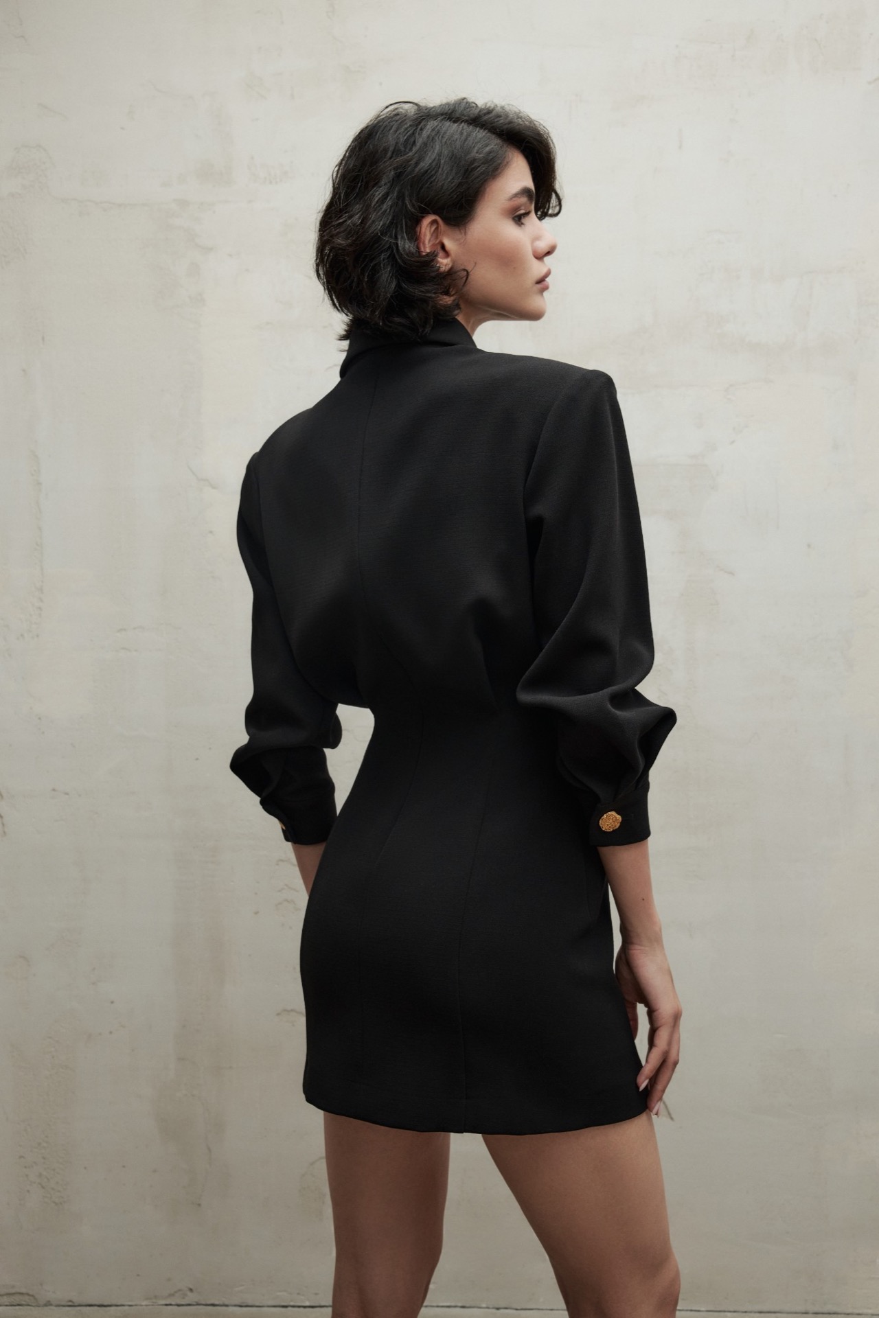 Мини-платье с классическим отложным воротником и акцентными золотыми пуговицами на манжетах и планке. Модель дополнена графичными подплечниками и выточками, создающими акцент на талии. Костюмная ткань хорошо держит форму и не мнется. Маленькое черное платье – прекрасная основа как делового, так и праздничного эффектного образа.