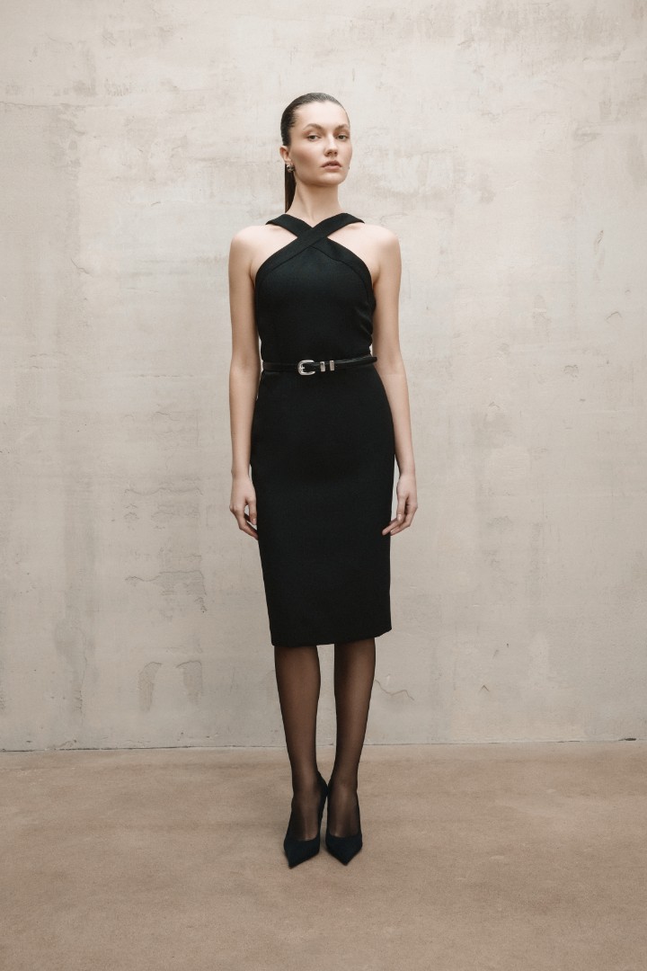 Платье облегающего силуэта с глубоким вырезом на спине. Американская пройма в зоне декольте притягивает внимание к линии плеча, а длина миди позволяет сделать платье элементом не только вечернего, но и делового офисного гардероба.