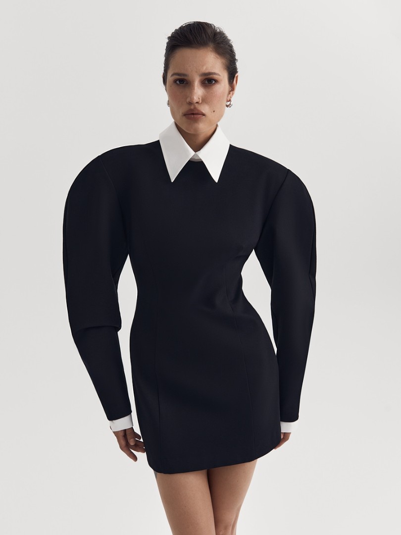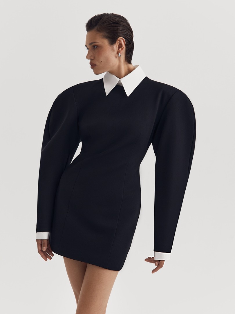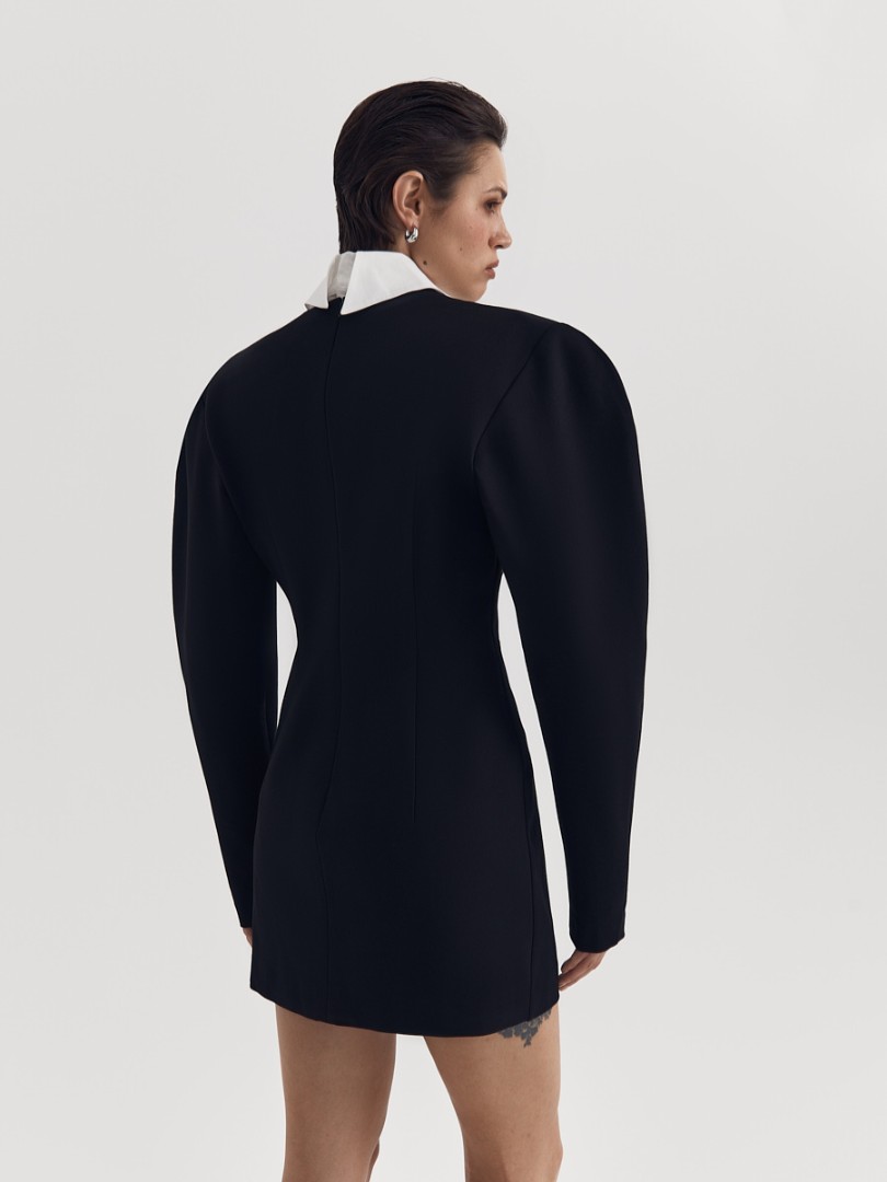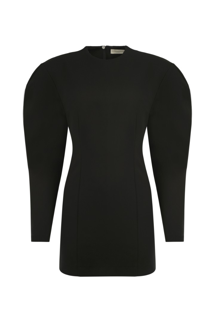 Мини-платье приталенного кроя из плотной ткани джерси. Объемная плечевая линия, круглый вырез и вытачки для лучшей посадки по фигуре. Застежка на потайную молнию сзади.