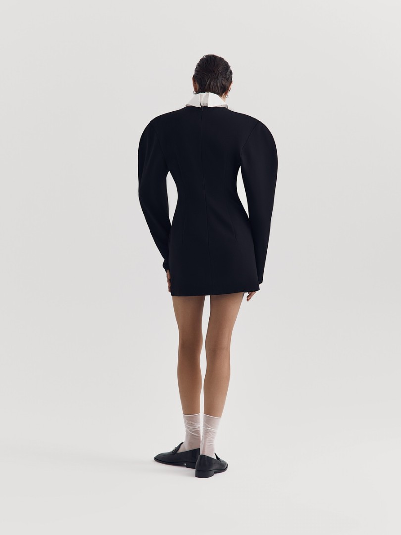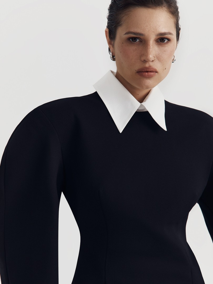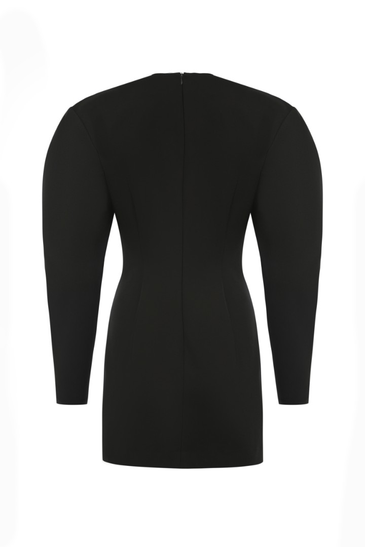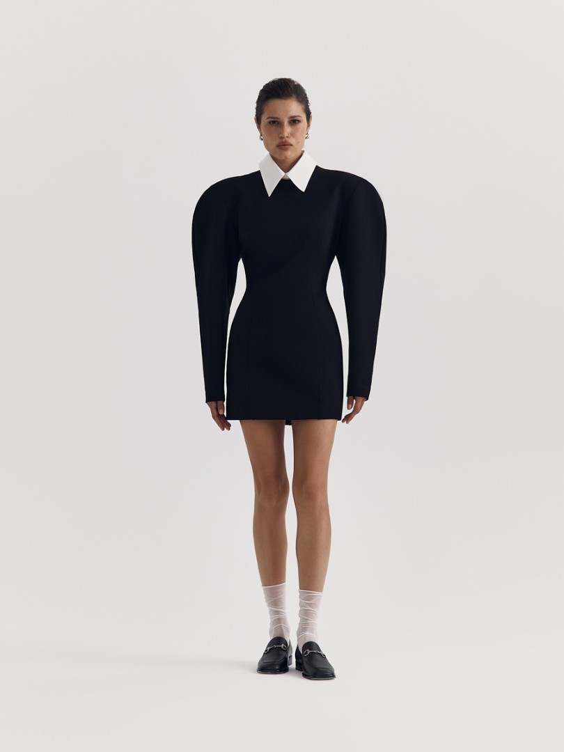 Мини-платье приталенного кроя из плотной ткани джерси. Объемная плечевая линия, круглый вырез и вытачки для лучшей посадки по фигуре. Застежка на потайную молнию сзади.