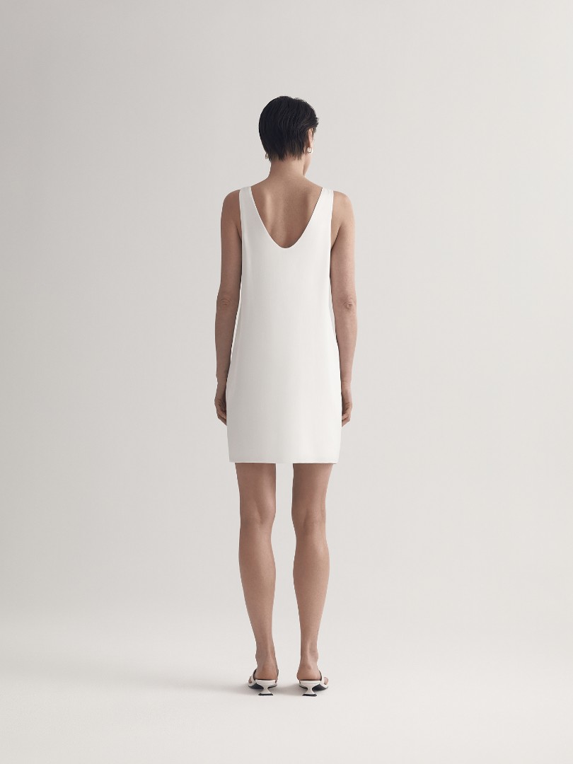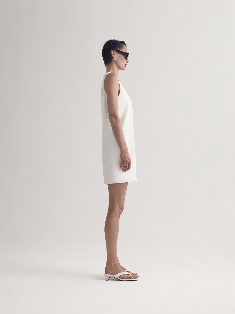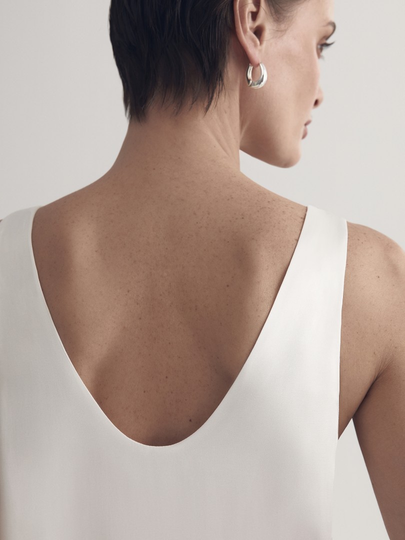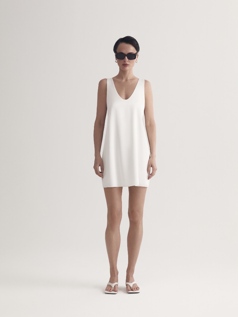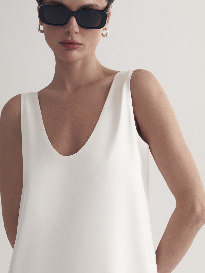 Платье-майка в бельевом стиле с U-образным вырезом и широкими бретелями. Для пошива модели использовался струящийся вискозный шелк, который позволяет телу дышать, сохраняя ощущение комфорта даже в зной.