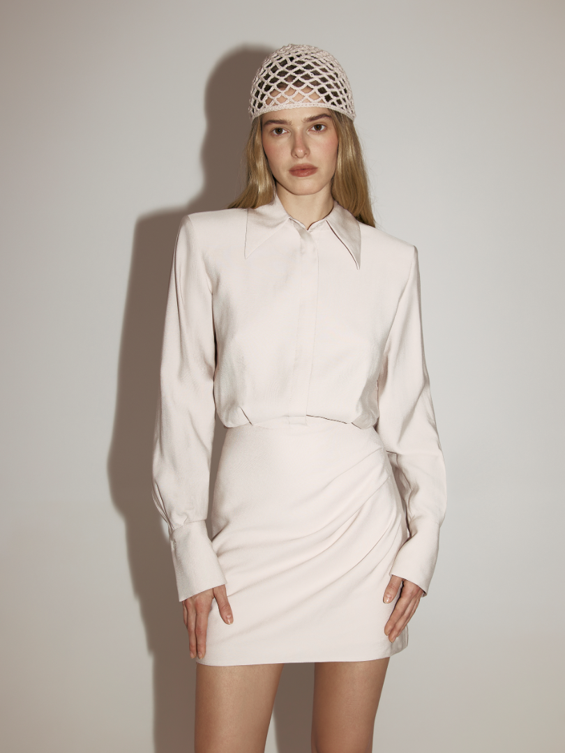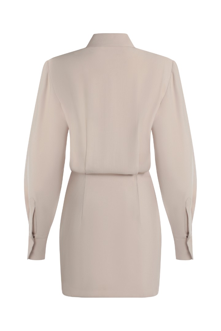 Мини-платье рубашечного кроя. Верх с подплечниками и удлиненными рукавами с широкими манжетами. Асимметричная драпировка на юбке.