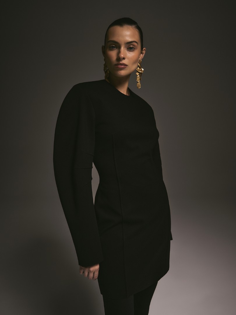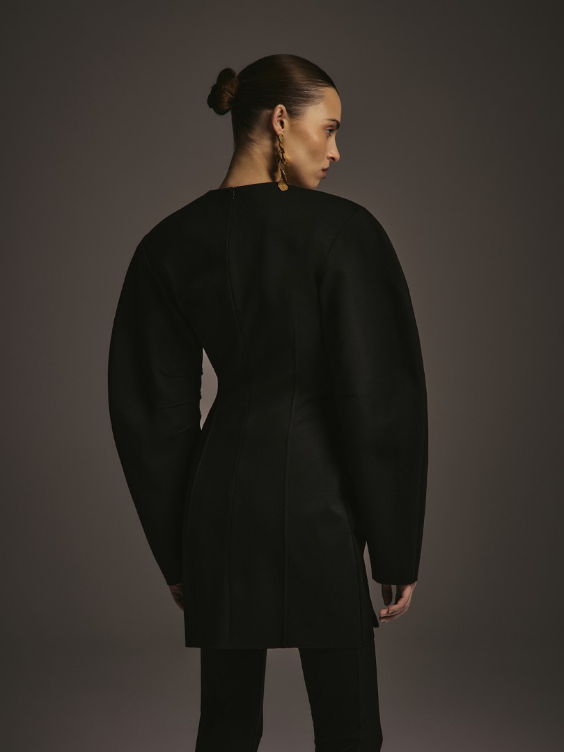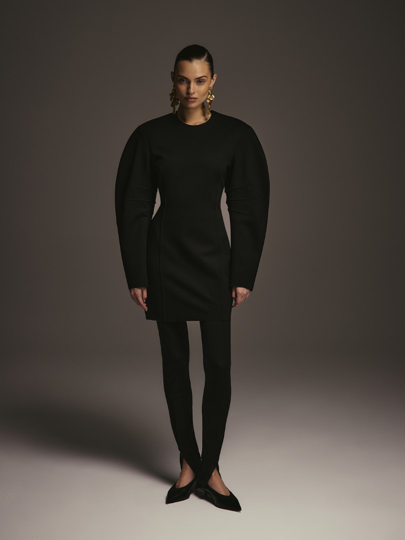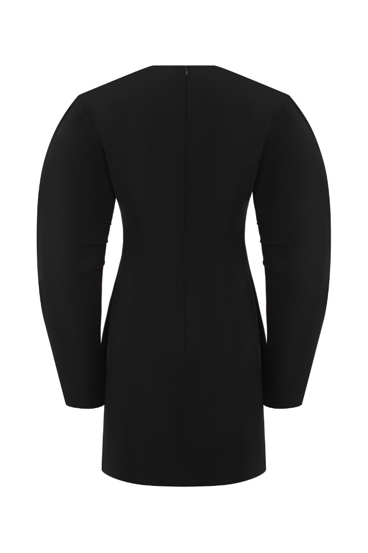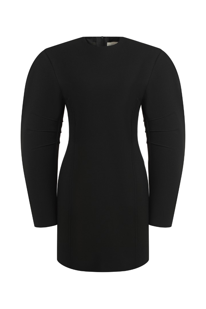 Мини-платье приталенного кроя из плотной ткани джерси. Объёмная плечевая линия, круглый вырез и декоративные вытачки на рукавах. Рельефные швы для создания приталенного силуэта. Застёжка на потайную молнию сзади.