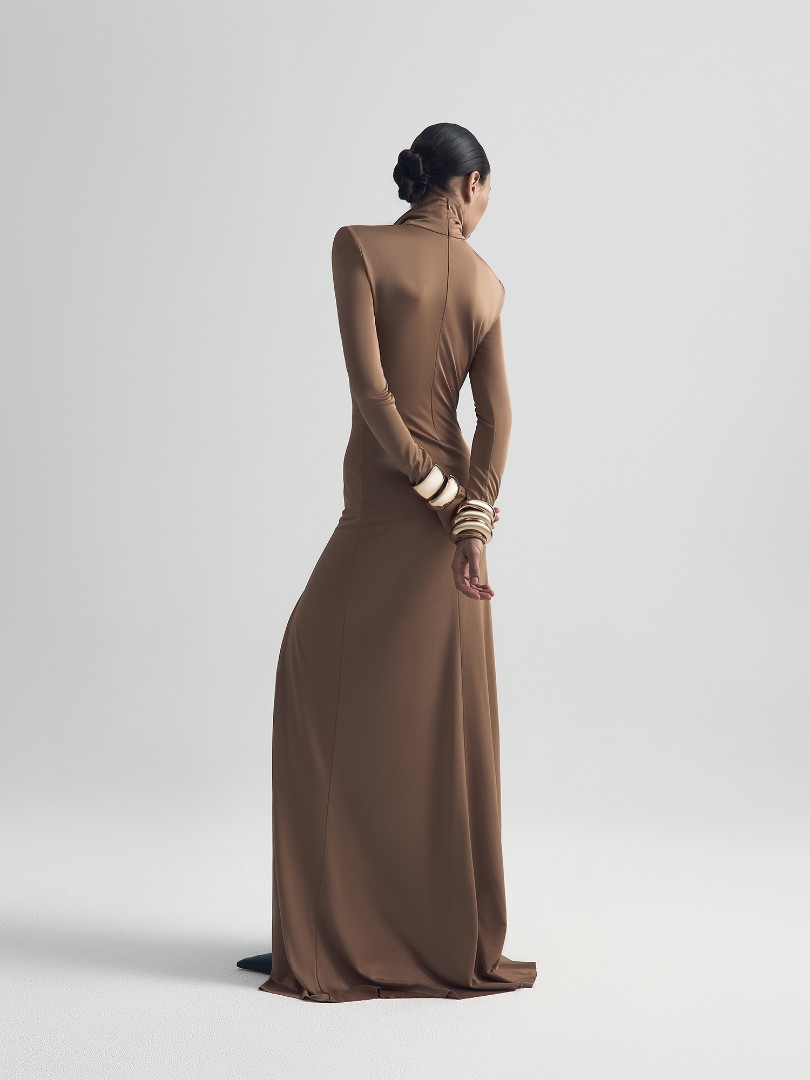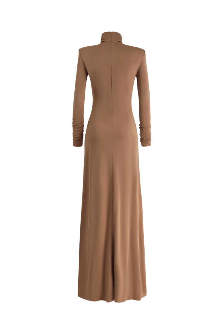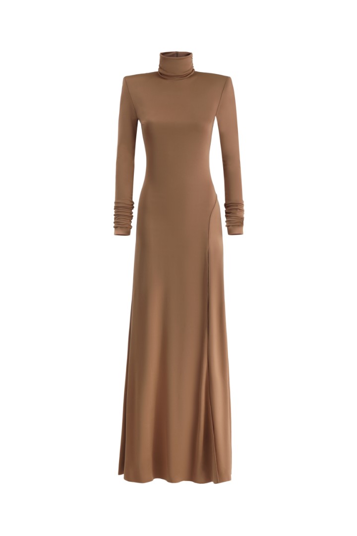Платье макси облегающего кроя. Плотная эластичная вискоза подчеркивает женственный силуэт, а подплечники добавляют платью характера. Модель с длинным рукавом, воротником-стойкой и высоким разрезом спереди. Застежка на потайную молнию сзади.