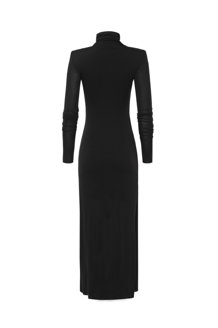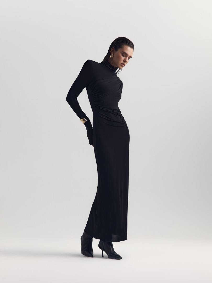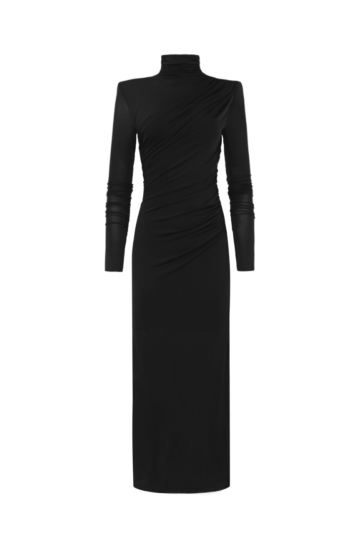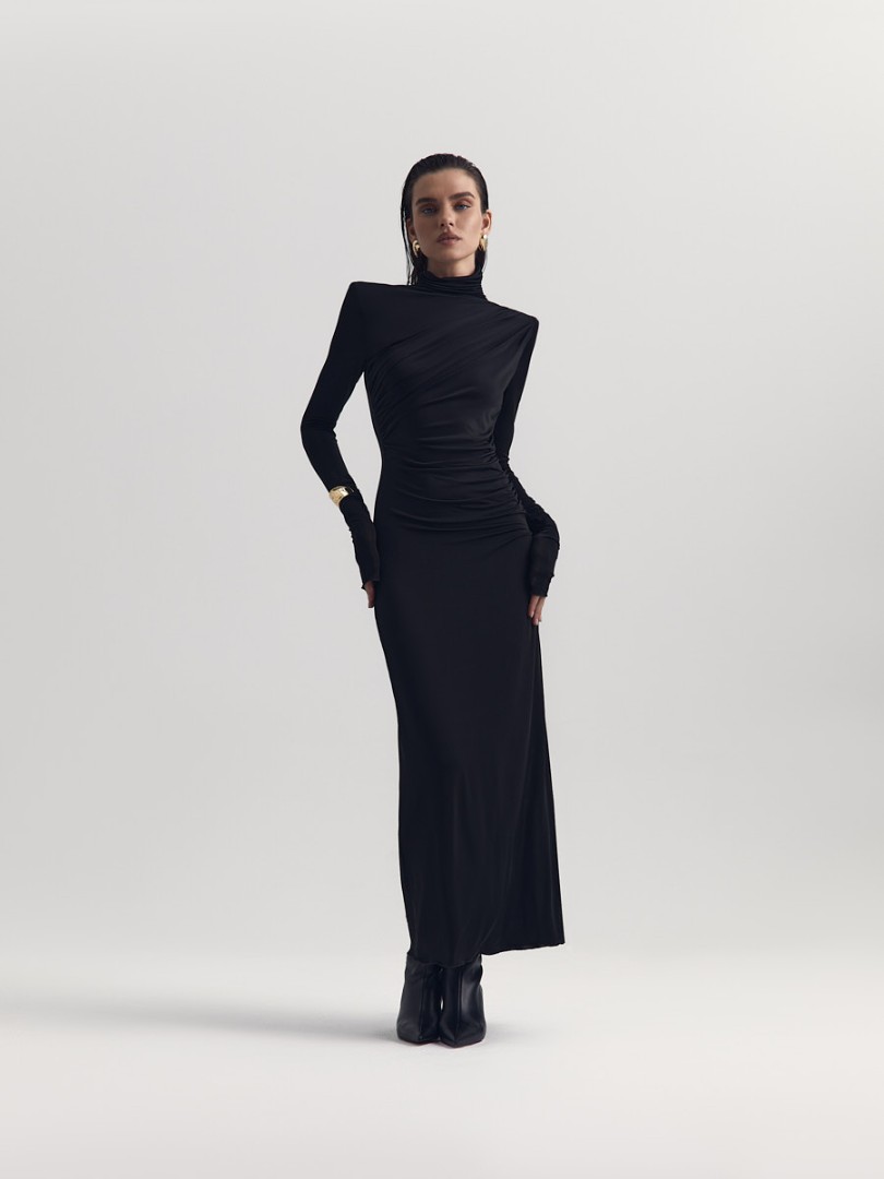 Платье макси с асимметричной драпировкой, подчеркивающей силуэт. Модель с удлиненными рукавами и графичными подплечниками из мягкой вискозы, которая комфортно облегает фигуру и почти не мнется.