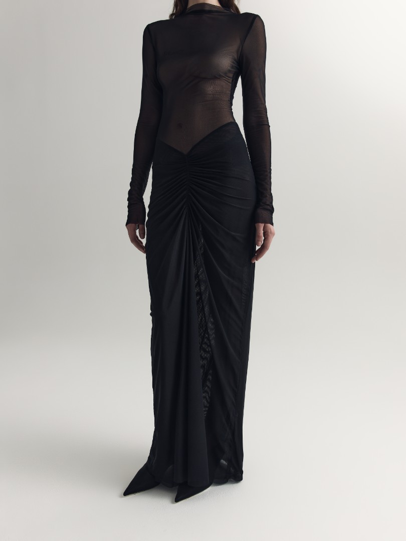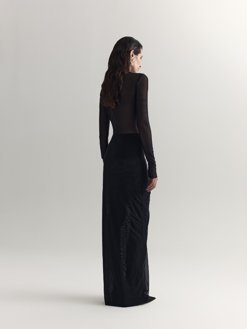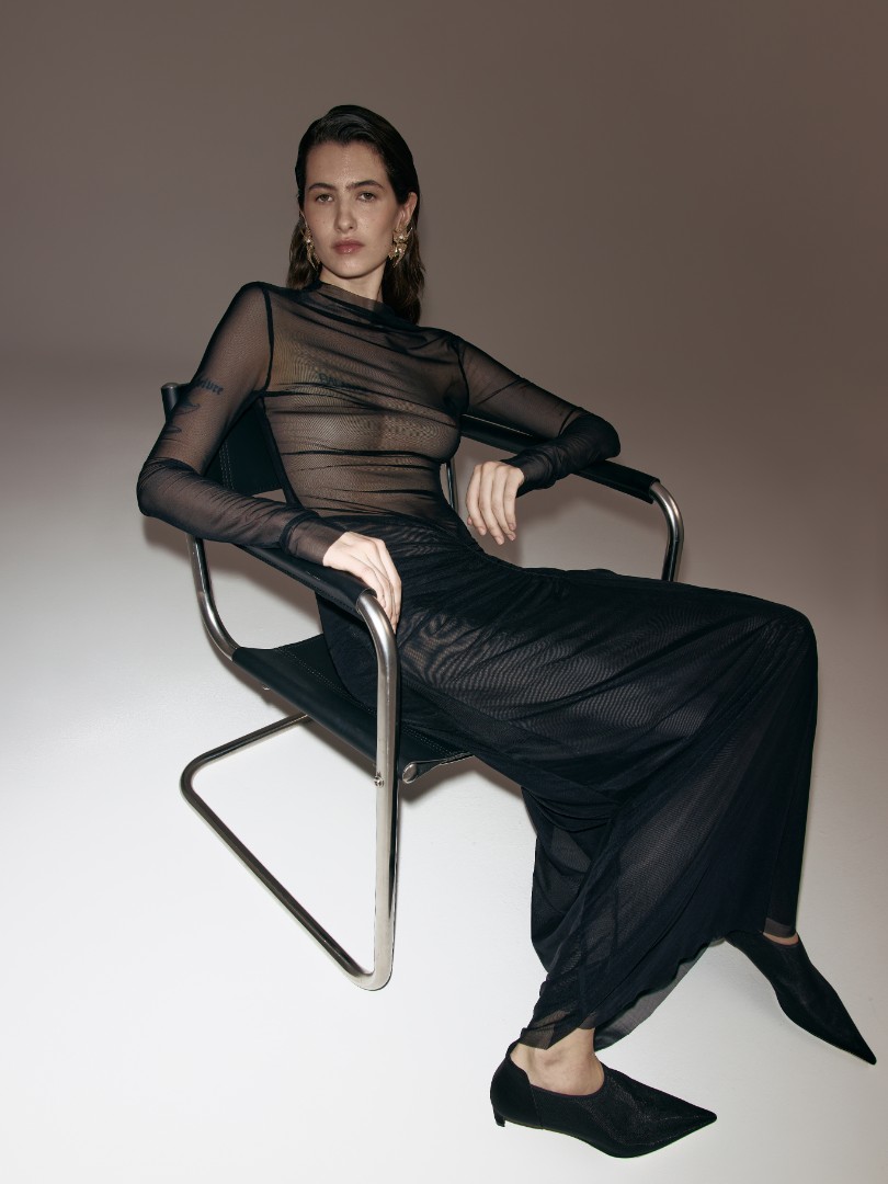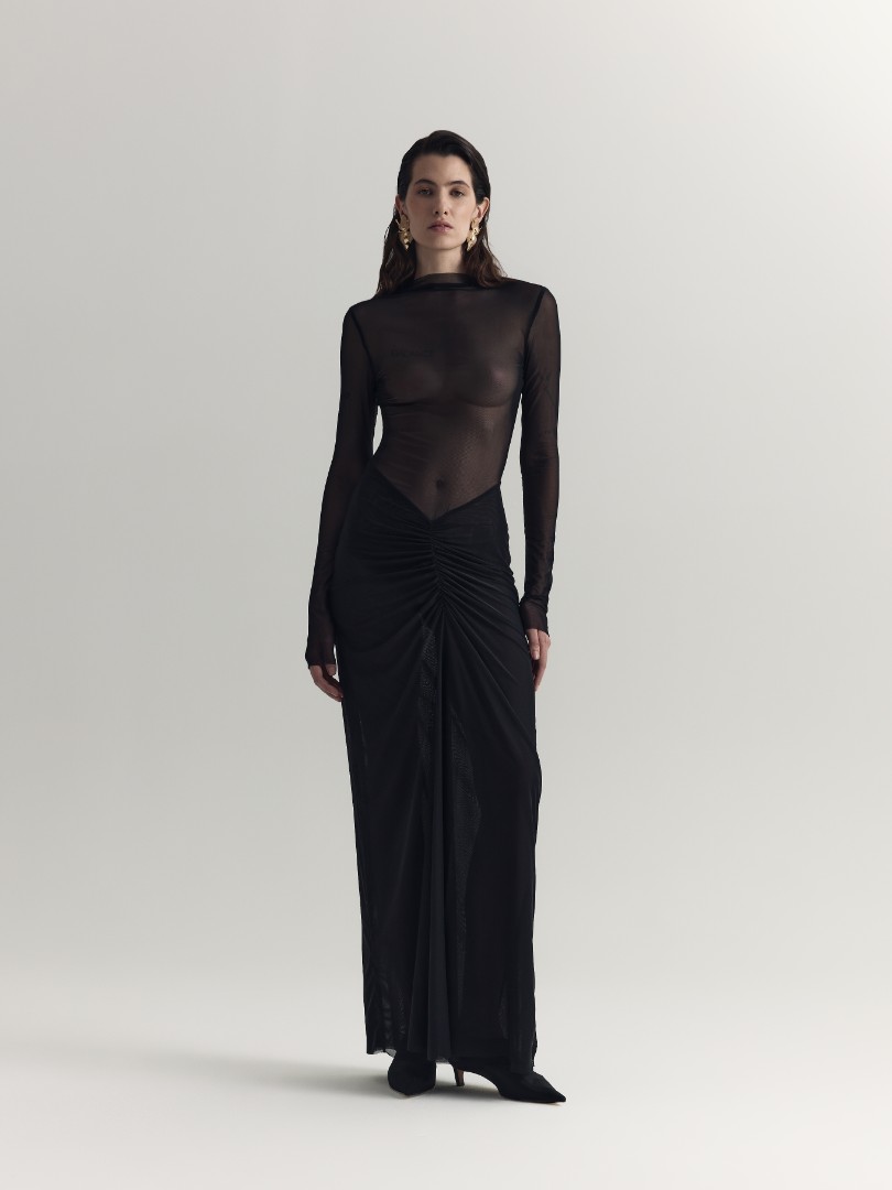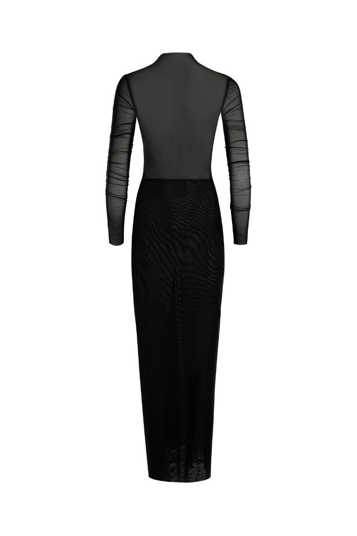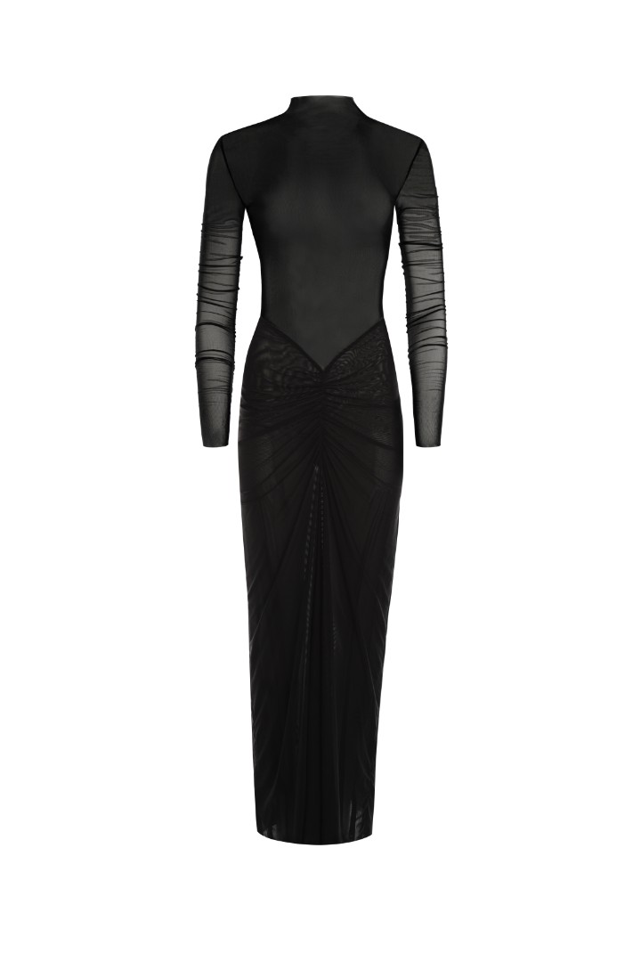 Платье OBSESSION — отражение того, что мы называем «деликатной провокацией». Чувственная полупрозрачная ткань сочетается в нем с полностью закрытым силуэтом и длинным рукавом, что помогает создать ощущение баланса.