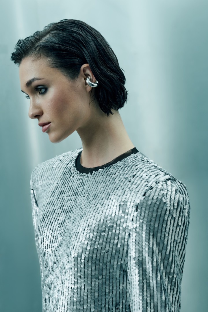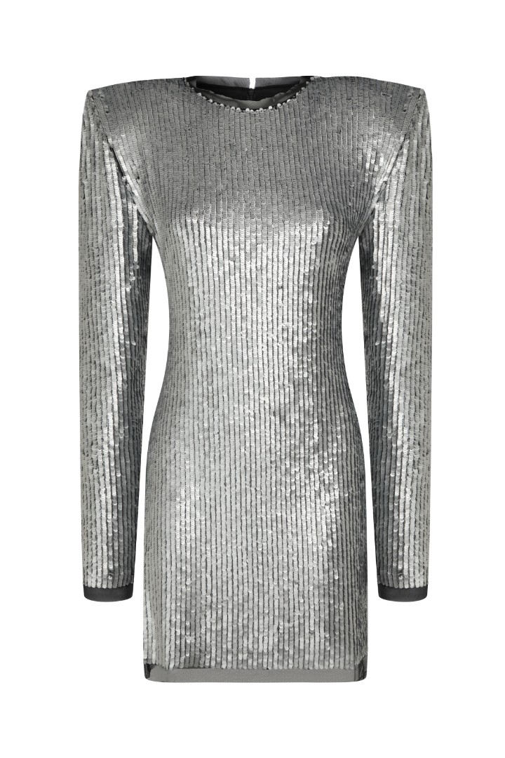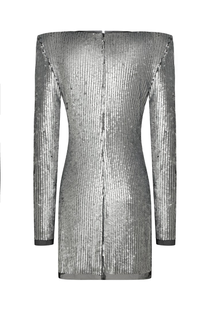 Металлическое мини-платье прямого кроя с длинными рукавами выполнено из пайеточной ткани с изысканным матовым блеском, задающим атмосферу праздника.