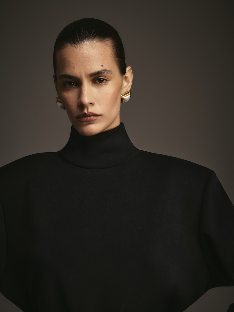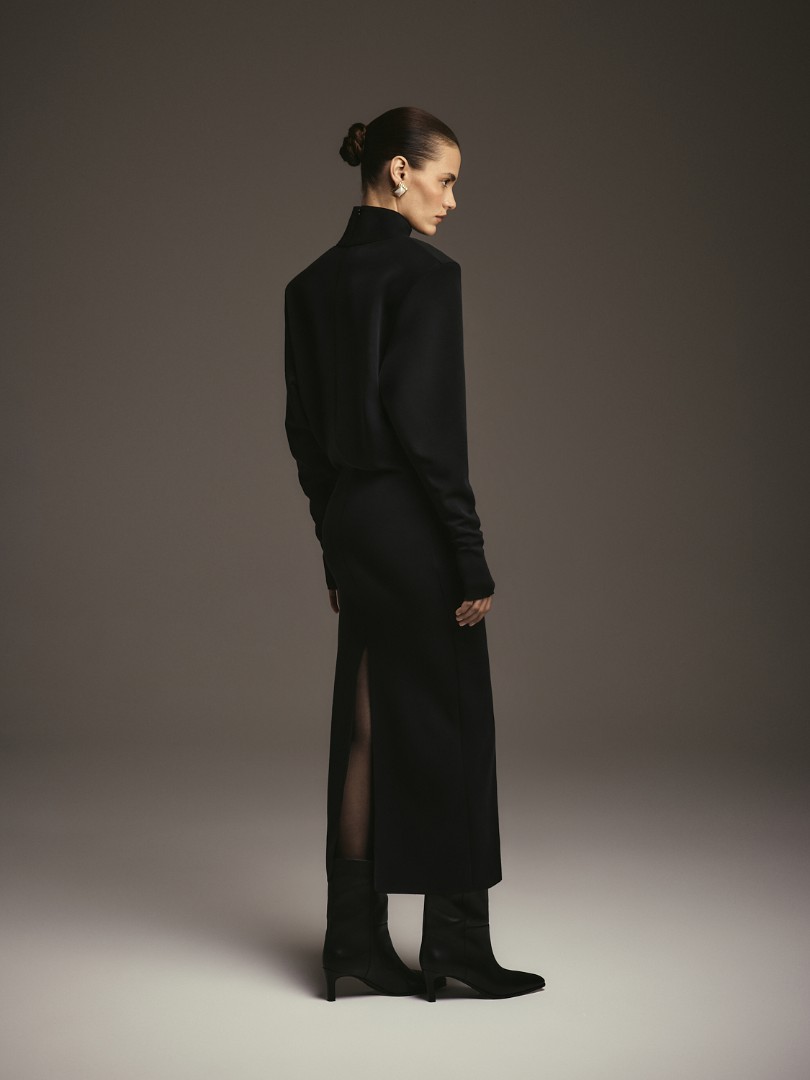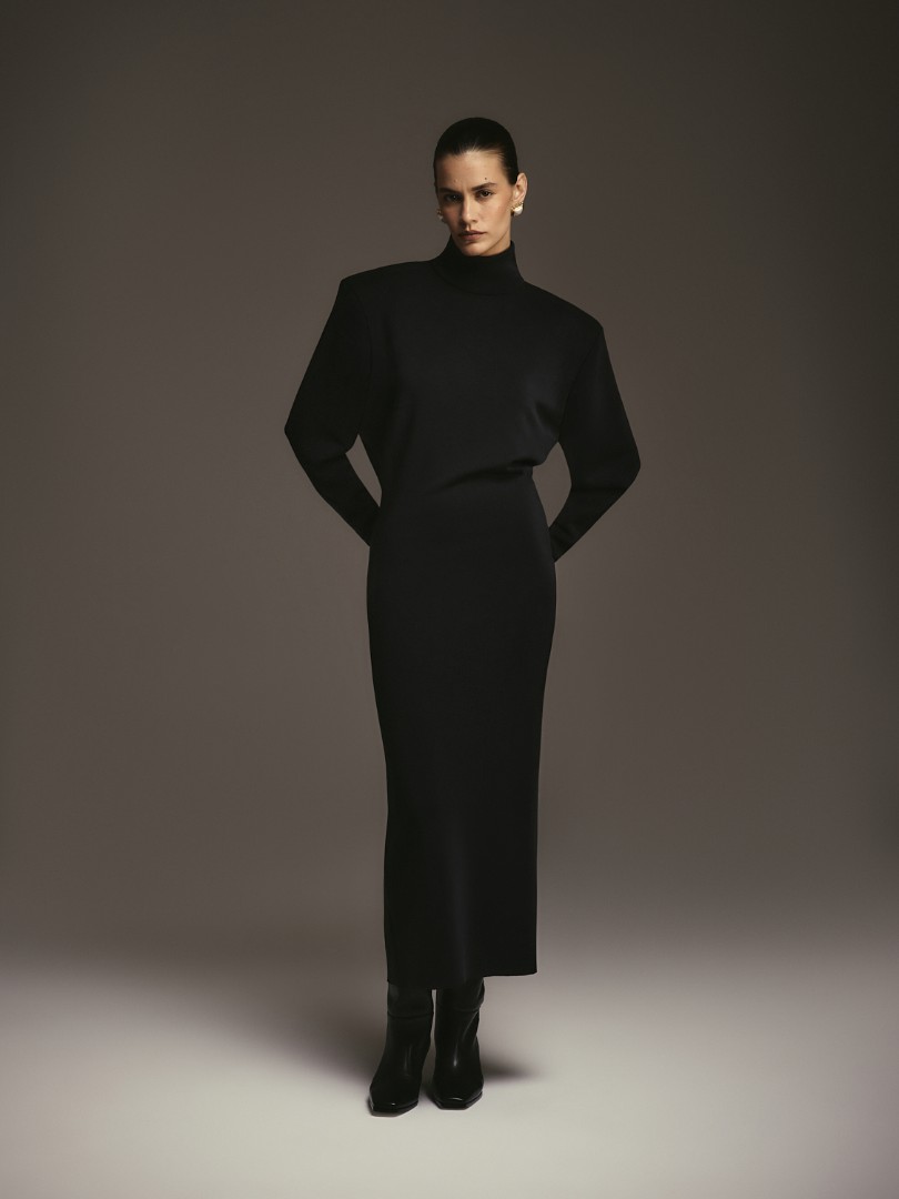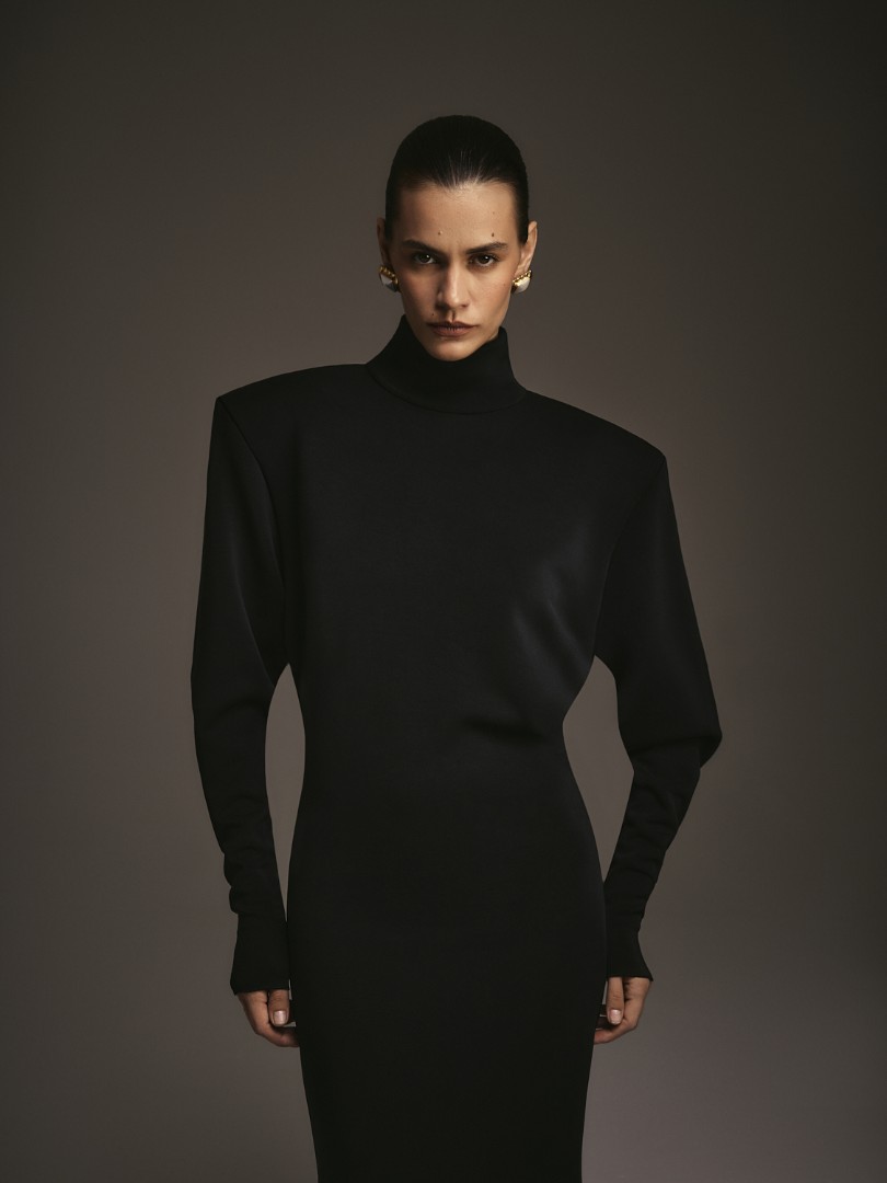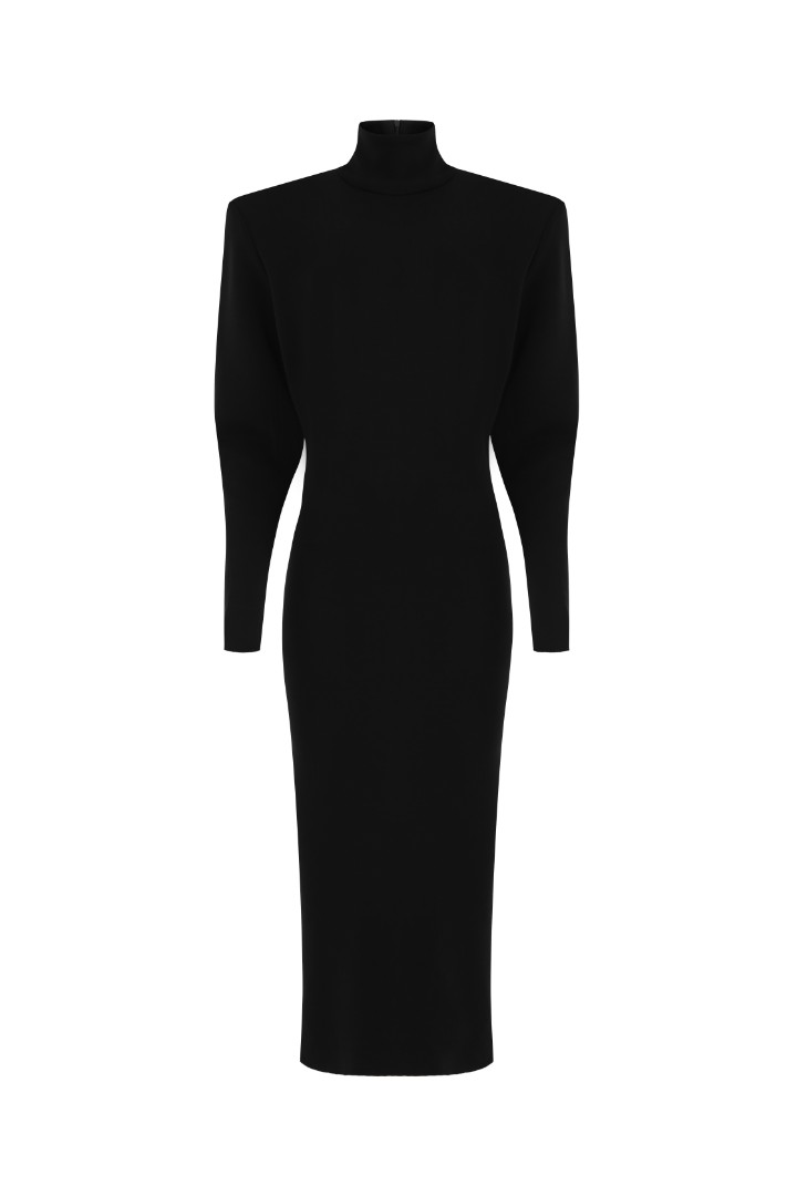 Макси-платье из плотного эластичного трикотажа с деликатным сатиновым блеском. Графичные подплечники, воротник-стойка и облегающий низ рукава. Застёжка на потайную молнию сзади.