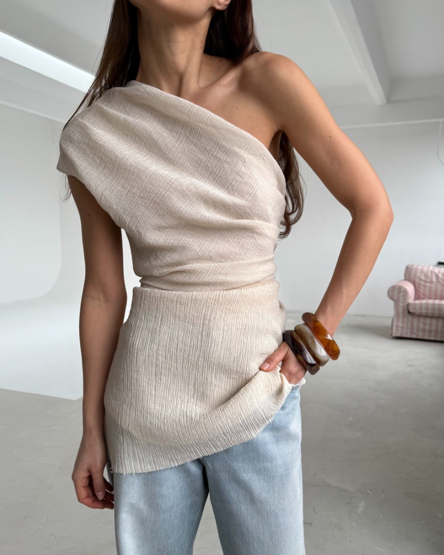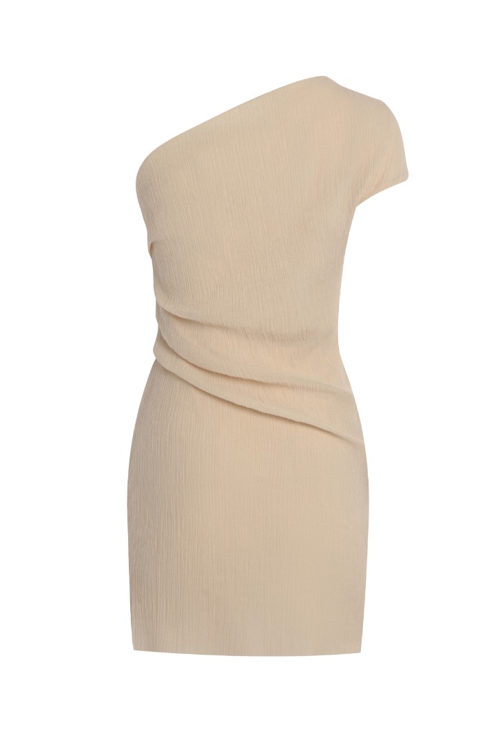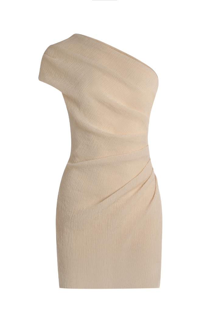 Асимметричное мини-платье с драпировками из фактурной ткани. Потайная застежка на молнию сбоку.