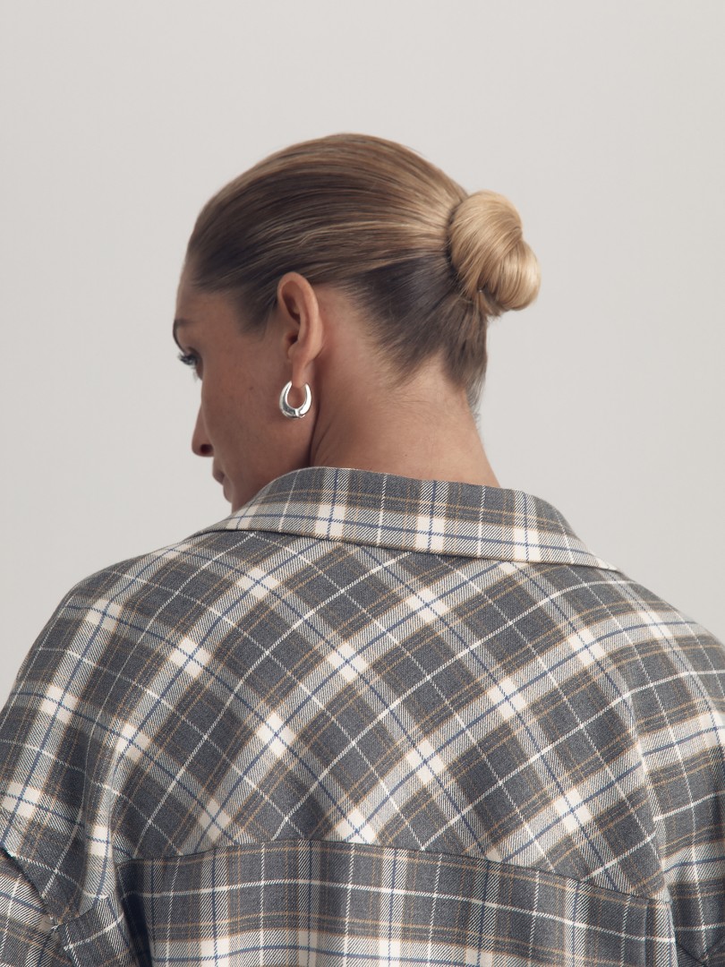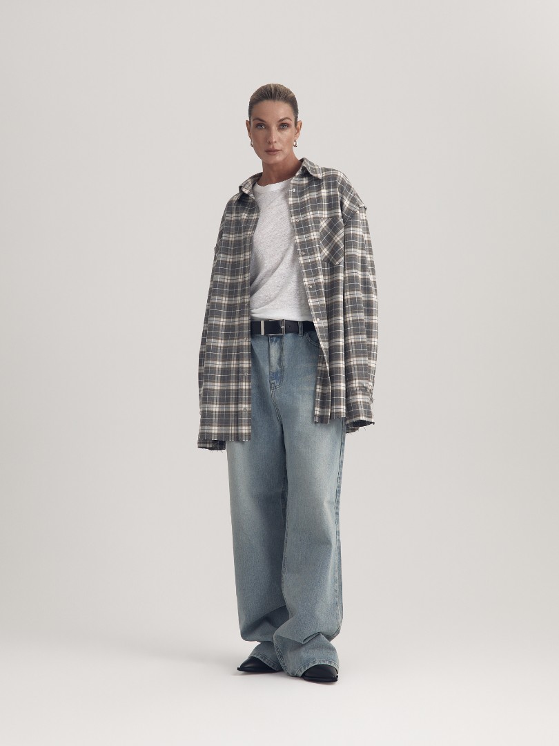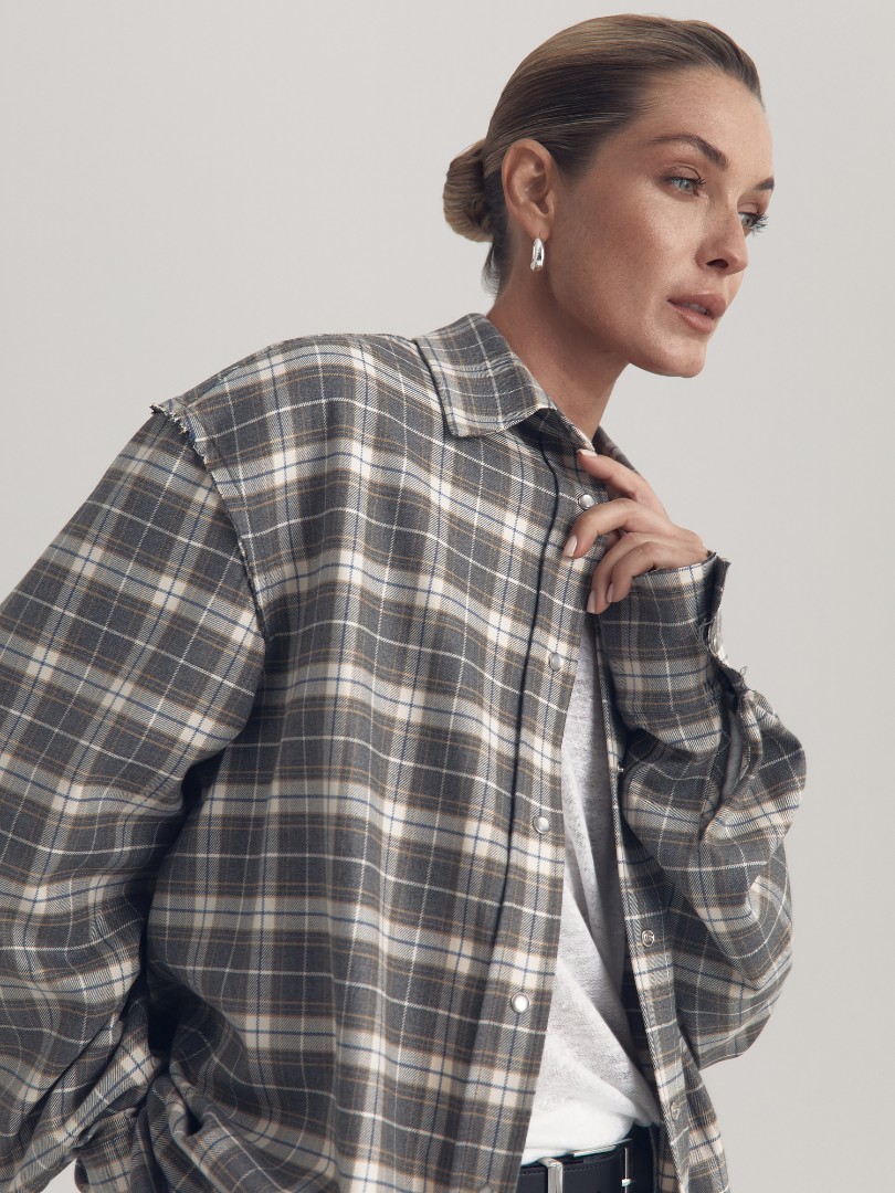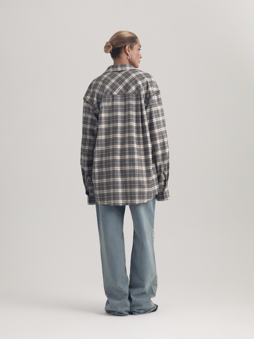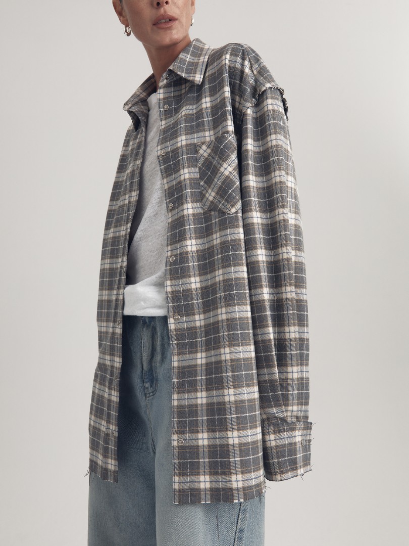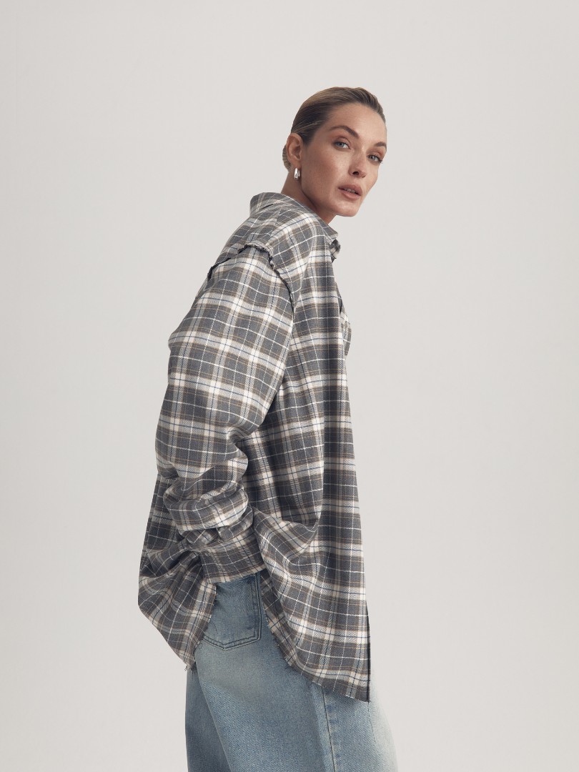 Рубашка в клетку — классика повседневных образов. Модель оверсайз кроя с удлиненными рукавами декорирована необработанным краем по плечевому и нижнему швам.