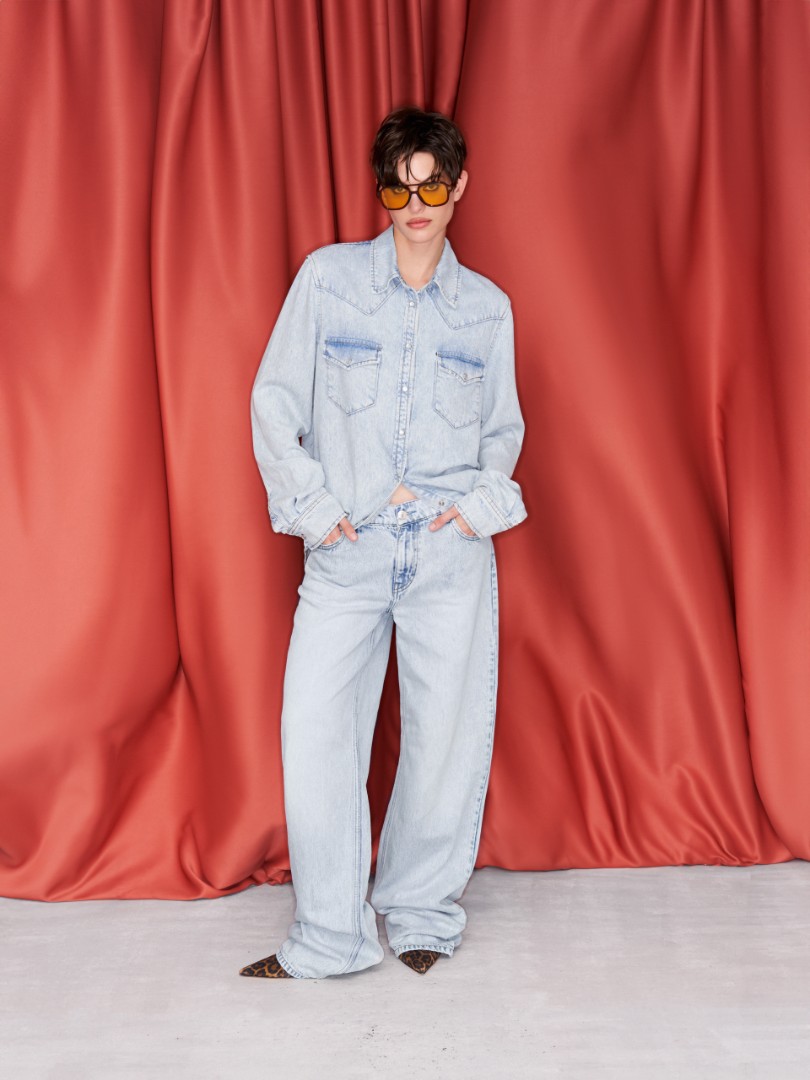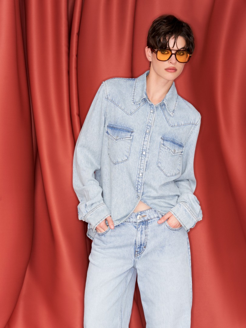 Рубашка прямого кроя с отложным воротником из облегченного премиум денима. Модель с удлиненными рукавами и нагрудными карманами с клапанами выполнена в выбеленном голубом цвете с эффектом делаве. Идеальный выбор для создания повседневного образа с ноткой ретро-шика. Сочетайте с брюками CANADIAN SET из той же ткани.