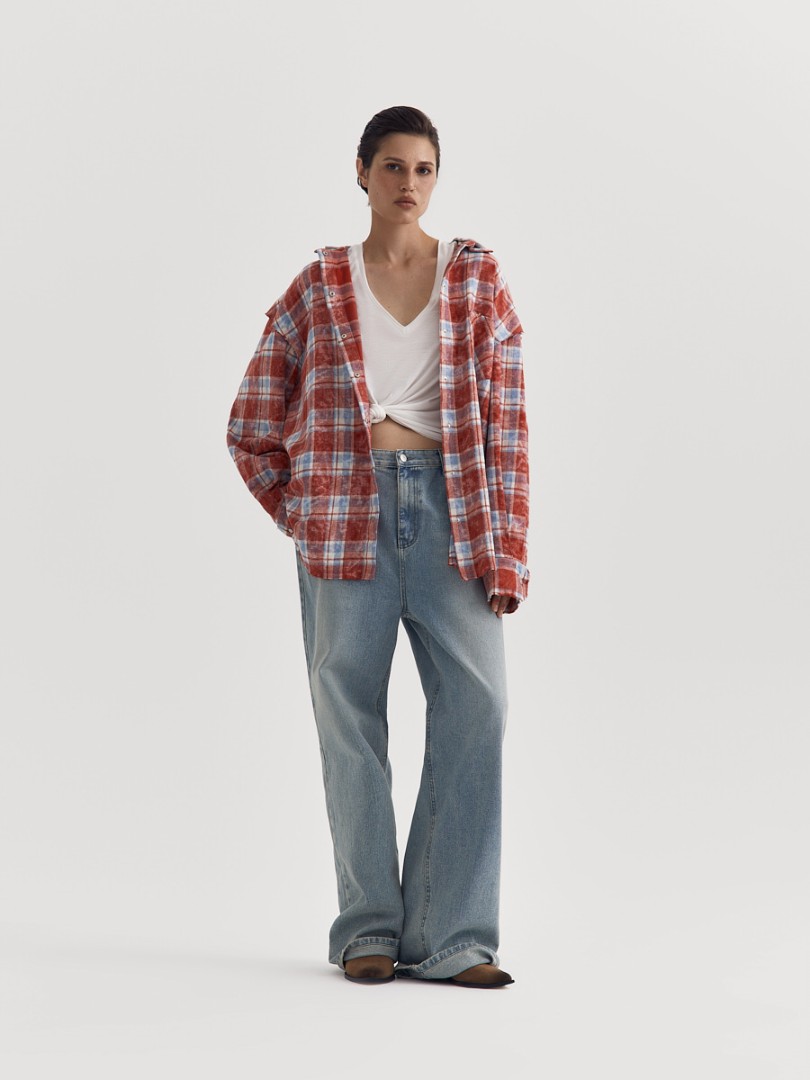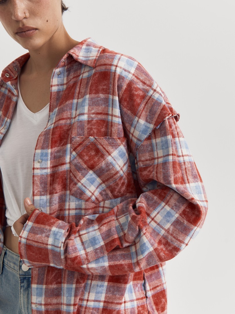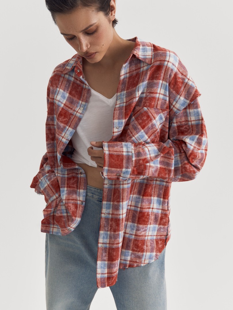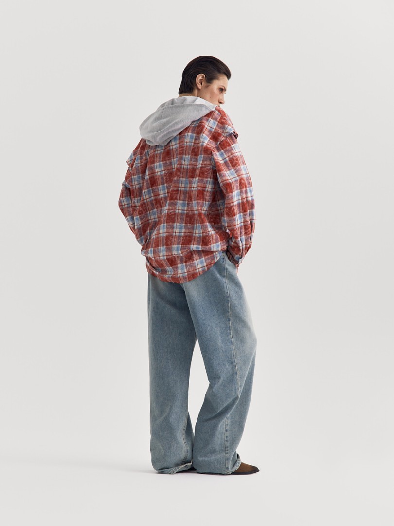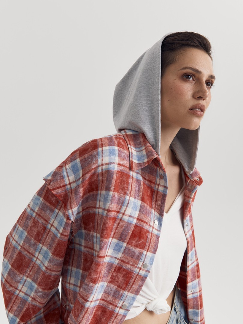 Рубашка в клетку со спущенным плечом. Декорирована необработанным краем на манжетах, нагрудном кармане, плечевом и нижнем швах. Застежка на металлические кнопки. Дополнена отстегивающимся трикотажным капюшоном.