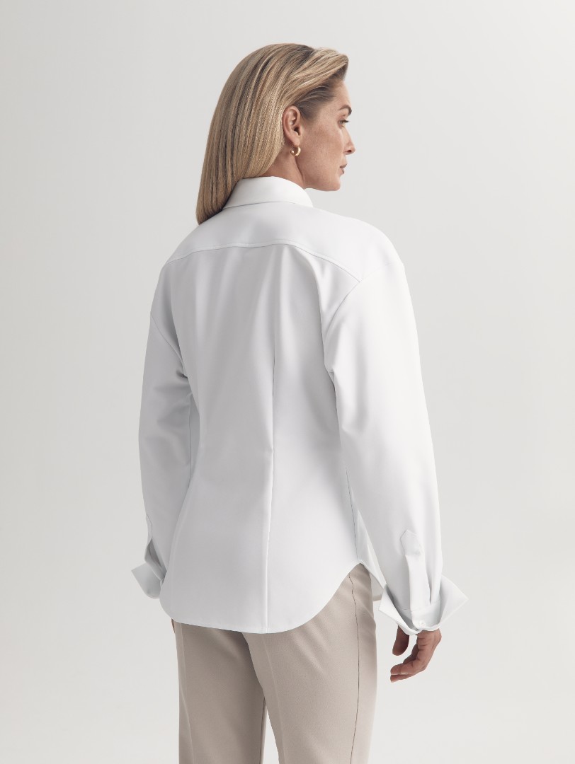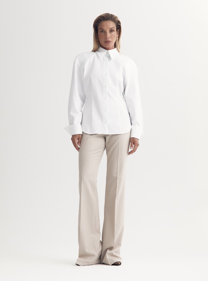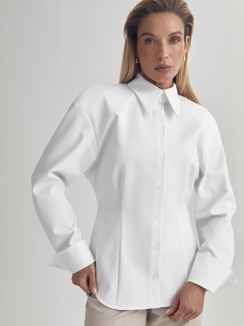 Блуза из плотного хлопка с объемной плечевой линией. Приталенная модель дополнена вытачками для лучшей посадки по фигуре. Удлиненные рукава с заниженной линией плеча и широкими манжетами. Застежка на пуговицы в тон ткани.