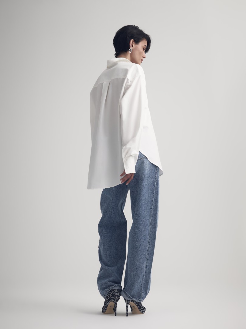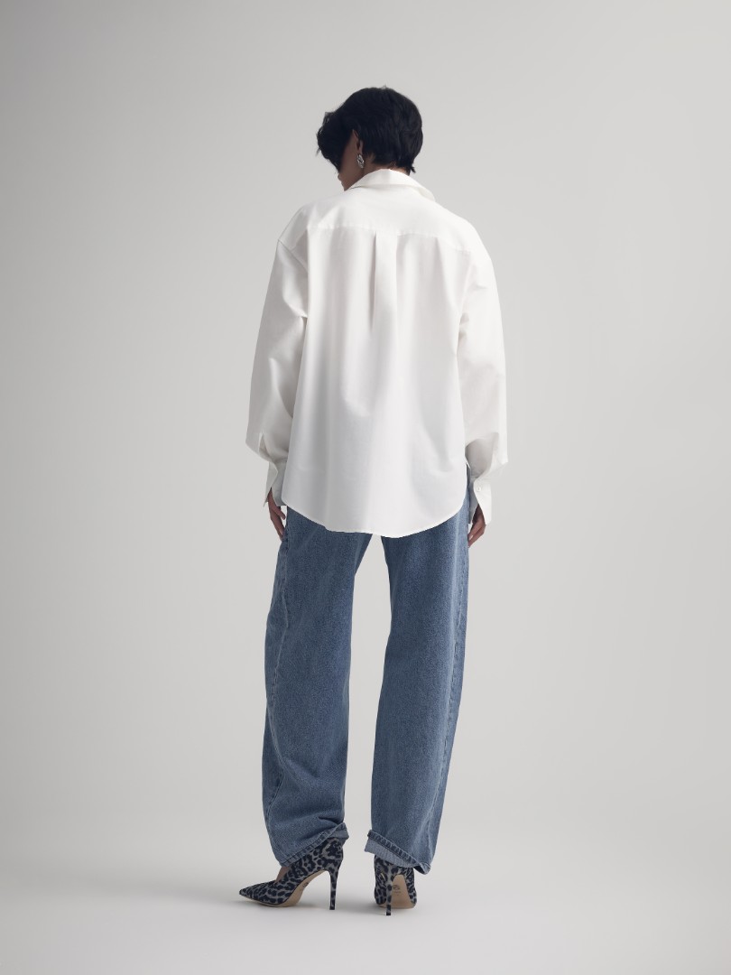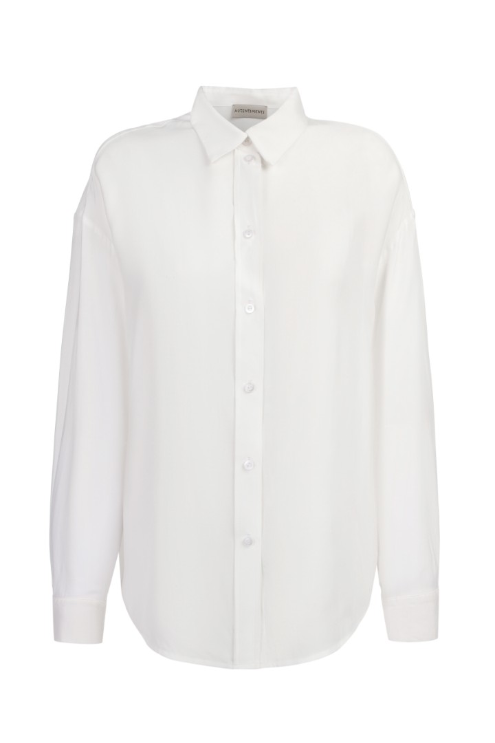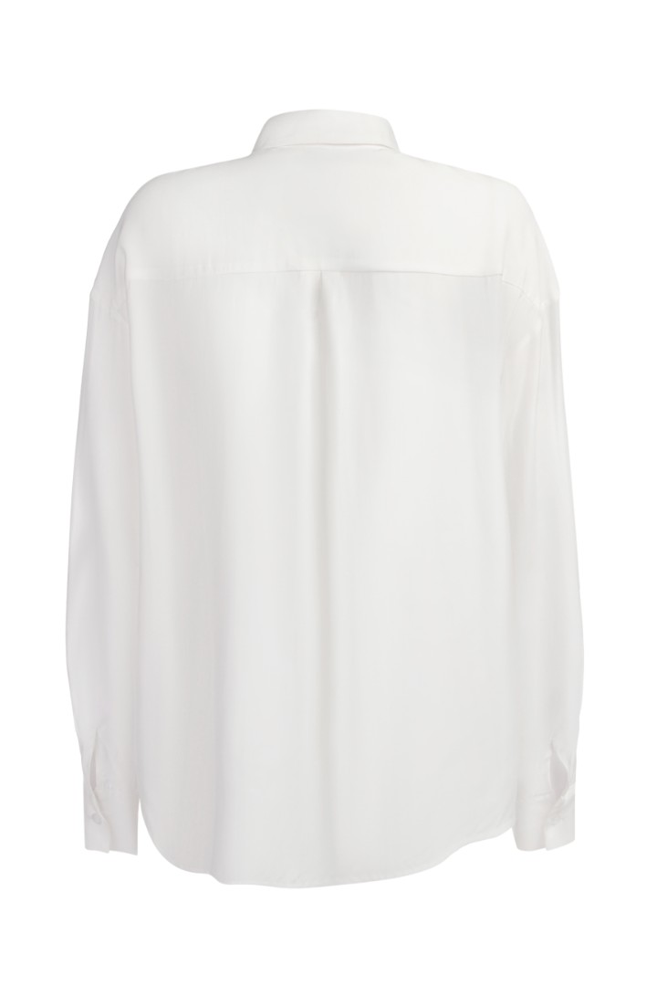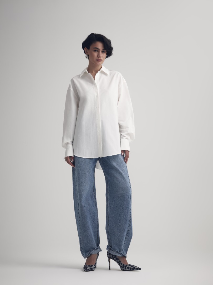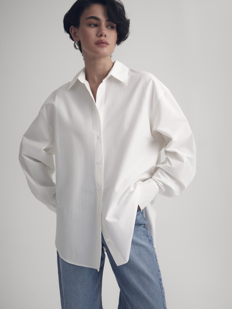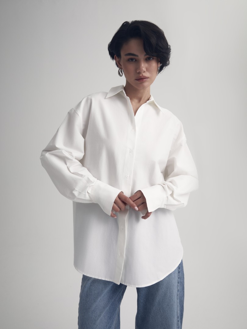 Классическая белая рубашка – must-have любого гардероба. Модель объемного кроя со спущенной линией плеча и удлиненными рукавами.