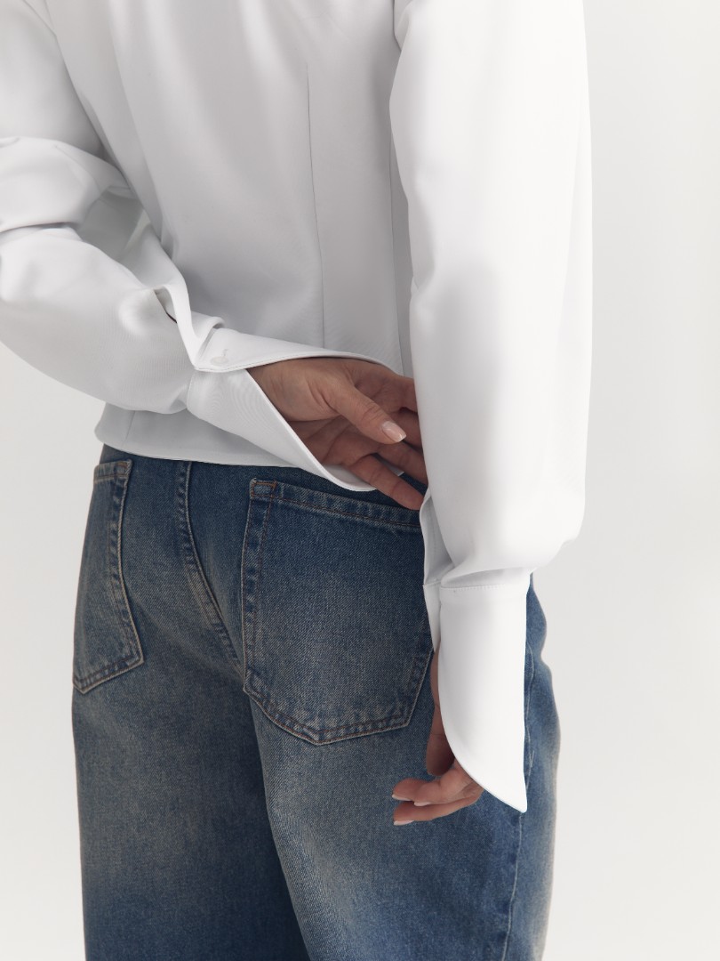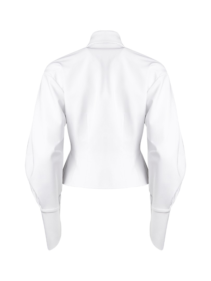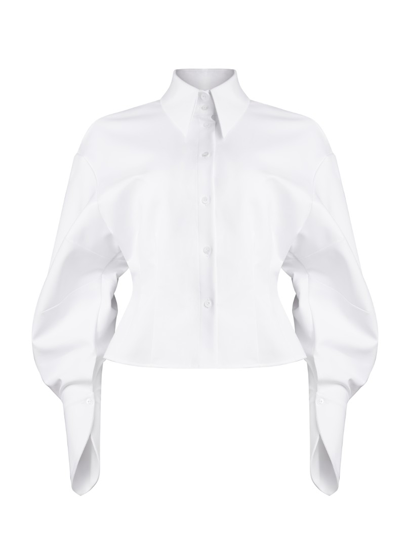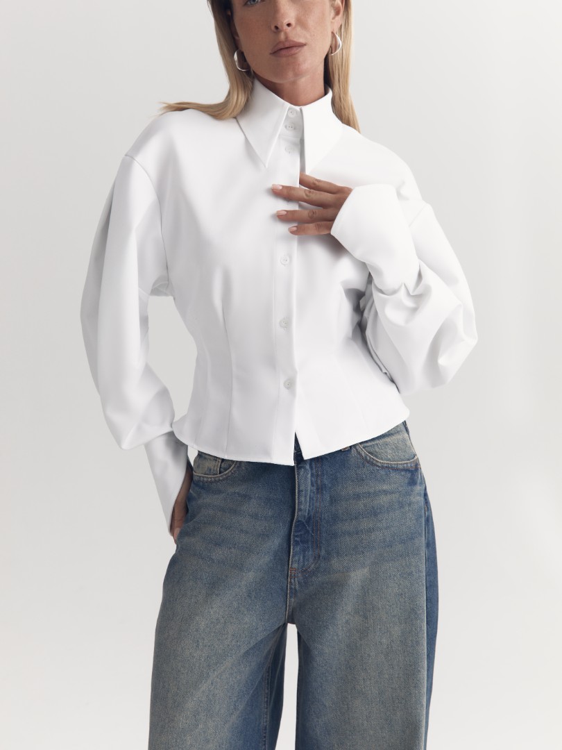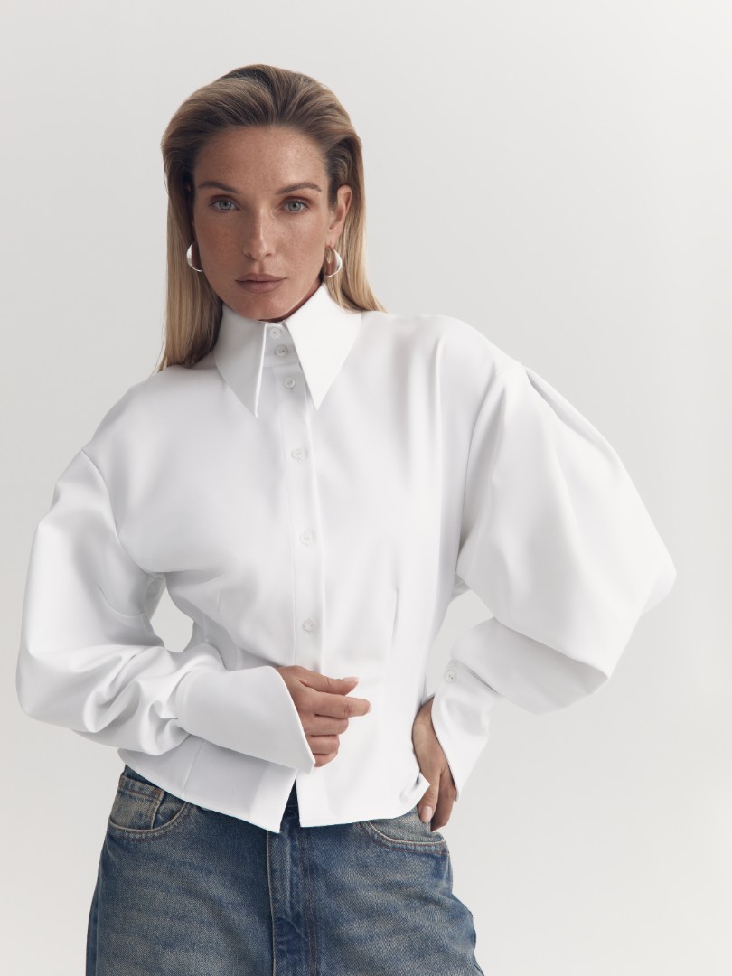 Приталенная рубашка с заниженной линией плеча и объемными рукавами. Модель с классическим отложным воротником, удлиненными манжетами и вытачками для лучшей посадки по фигуре.