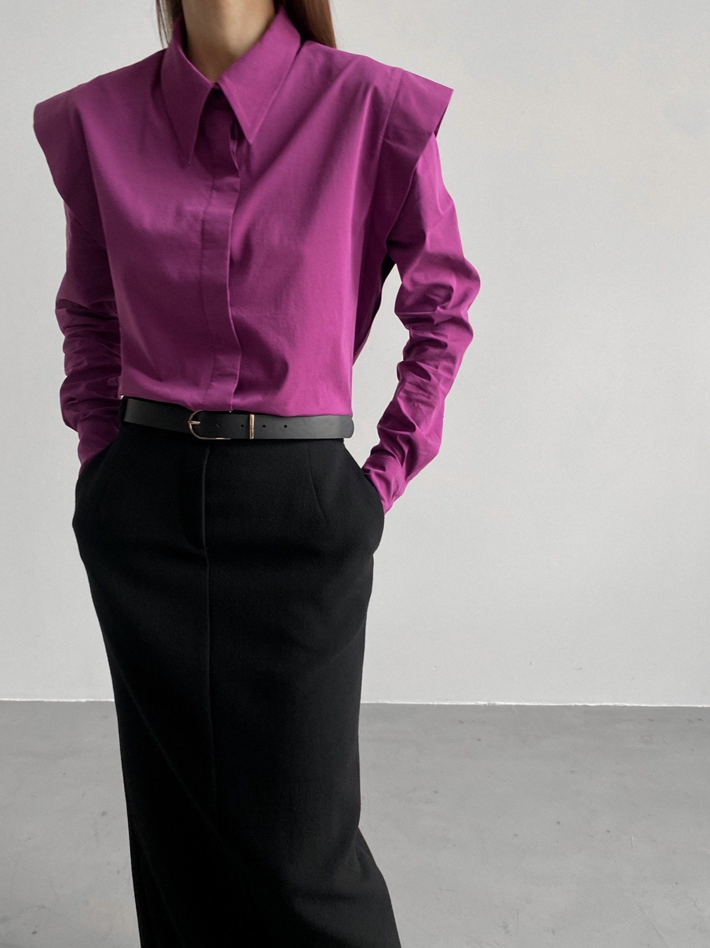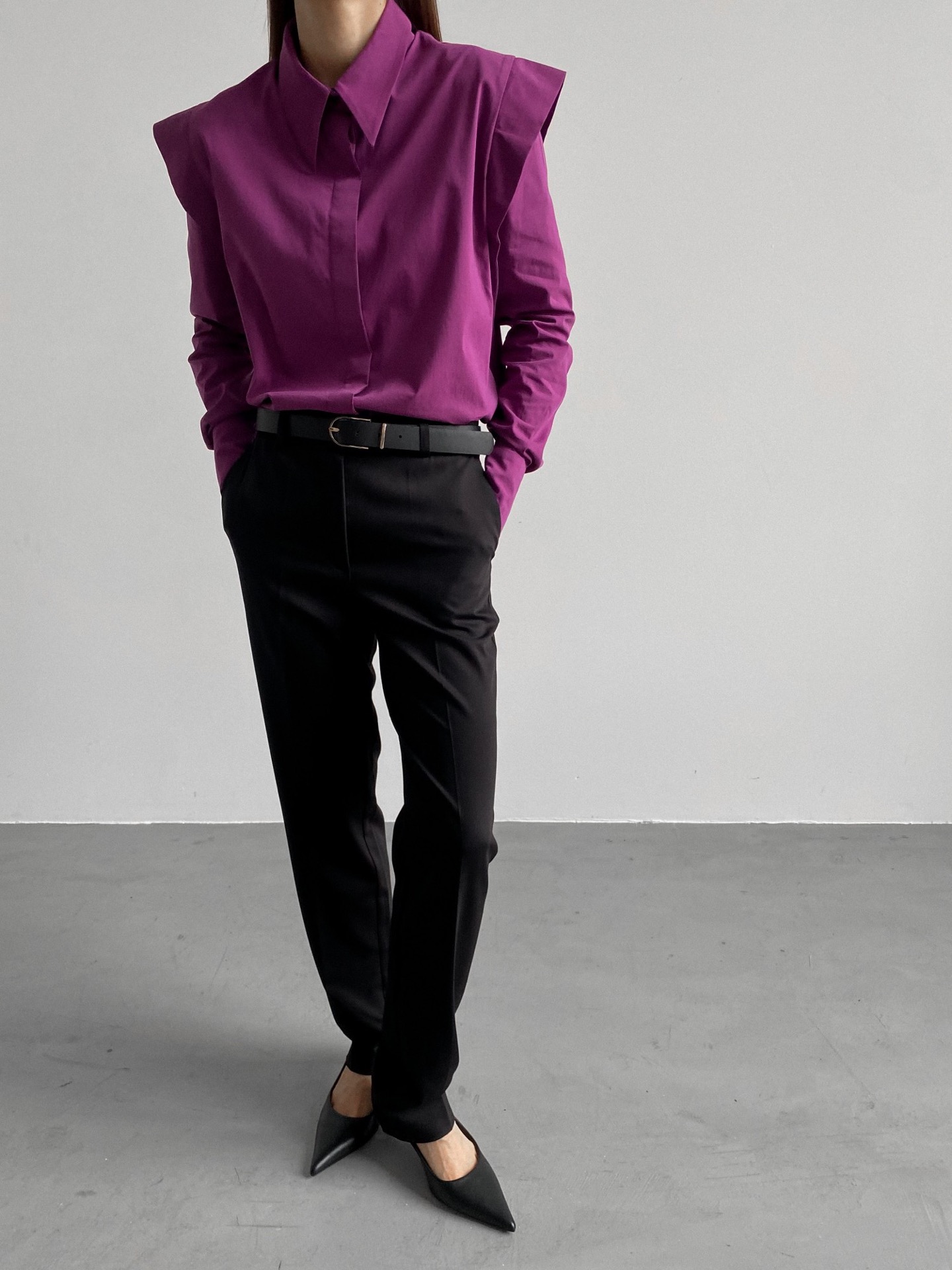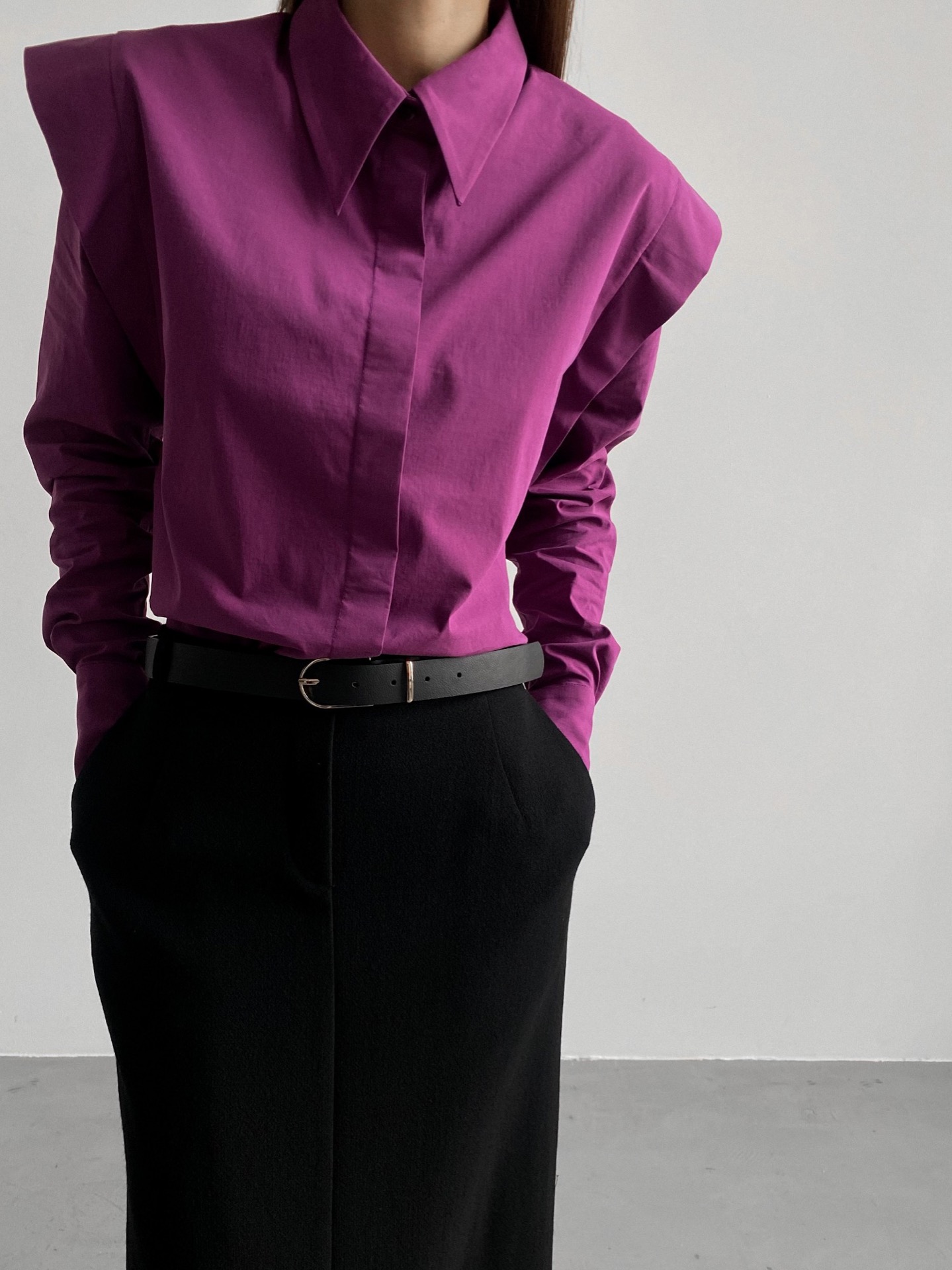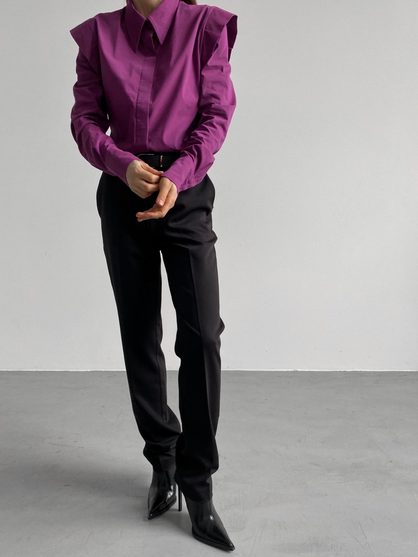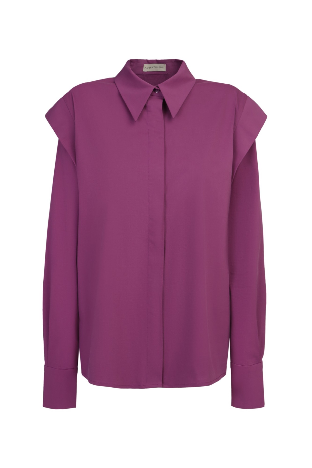 Рубашка с фактурными плечами подойдёт для создания заметного, но при этом аккуратного и сдержанного образа. Накладные детали визуально усиляют плечевую линию, делая образ графичным. Модель дополняют широкие манжеты и скрытая застежка.