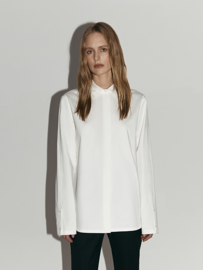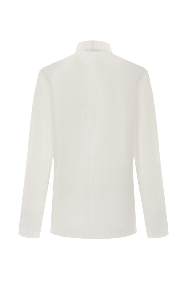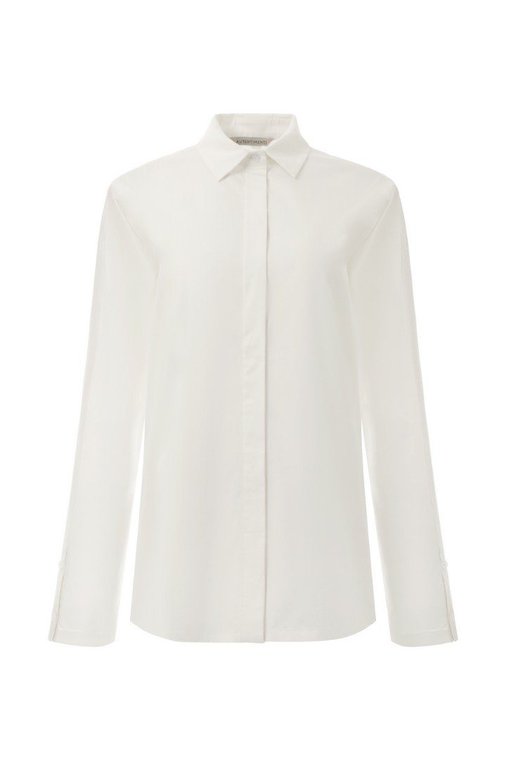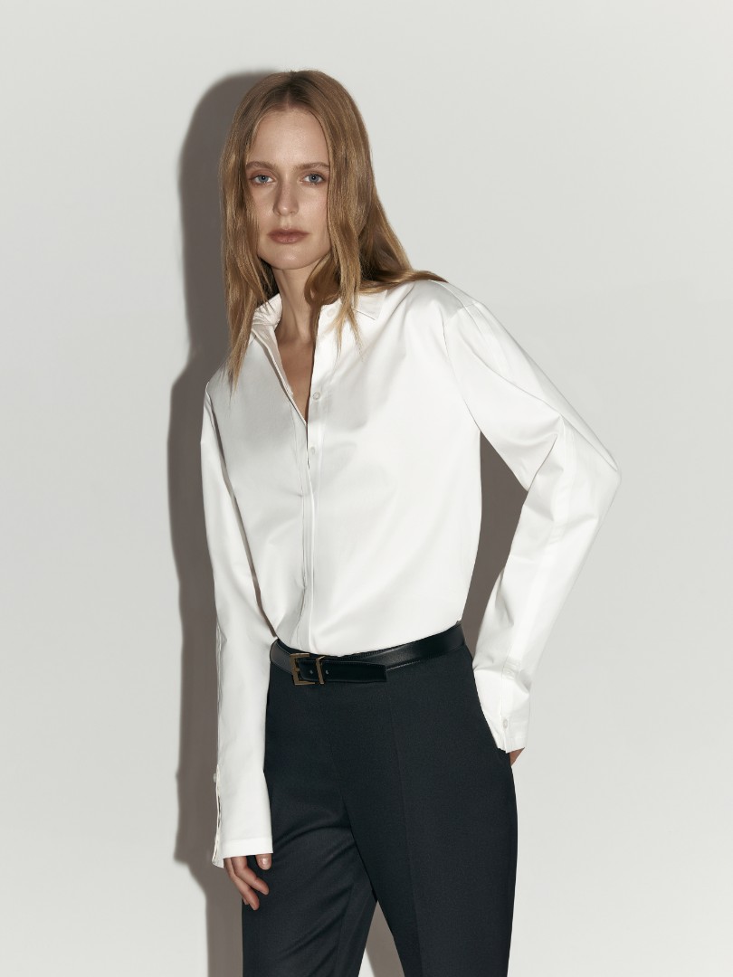 Классическая рубашка из плотного хлопка с длинным рукавом, супатной застежкой на пуговицы и разрезами по боковым швам. Воротник изделия отложной на стойке с застежкой на пуговицу.