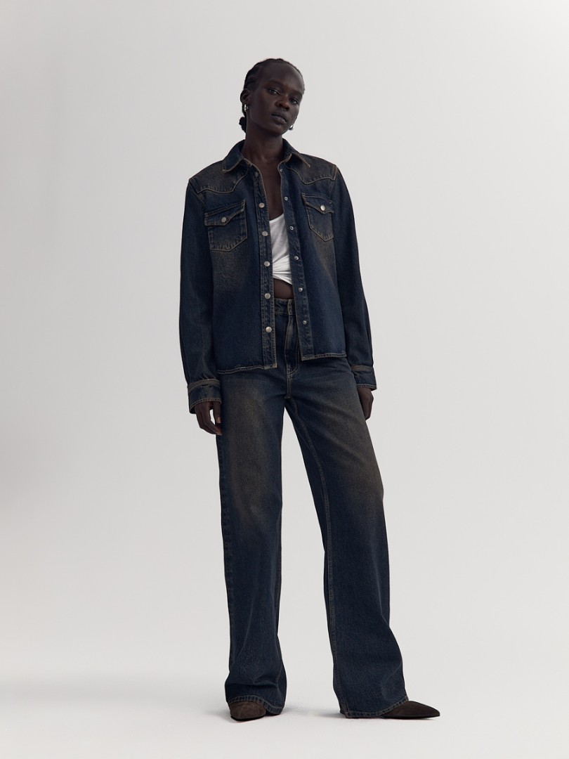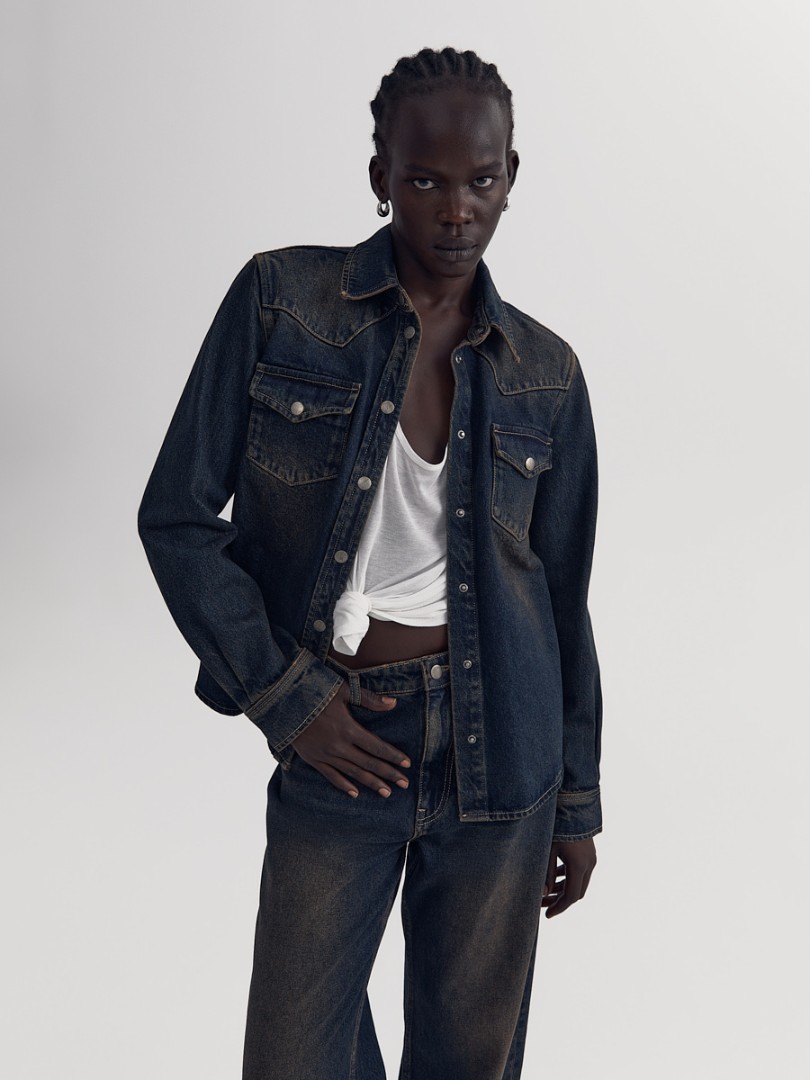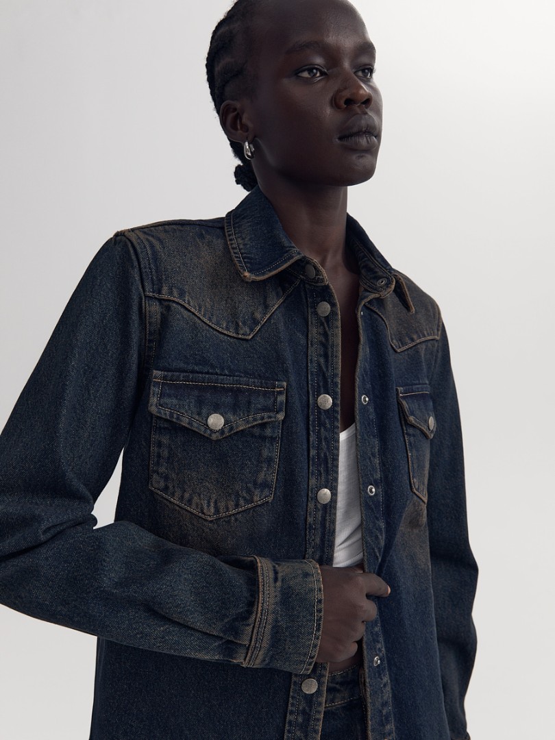 Рубашка прямого кроя из плотного денима с эффектом делаве. Отложной воротник, два нагрудных кармана с клапанами и застежка на металлические кнопки.