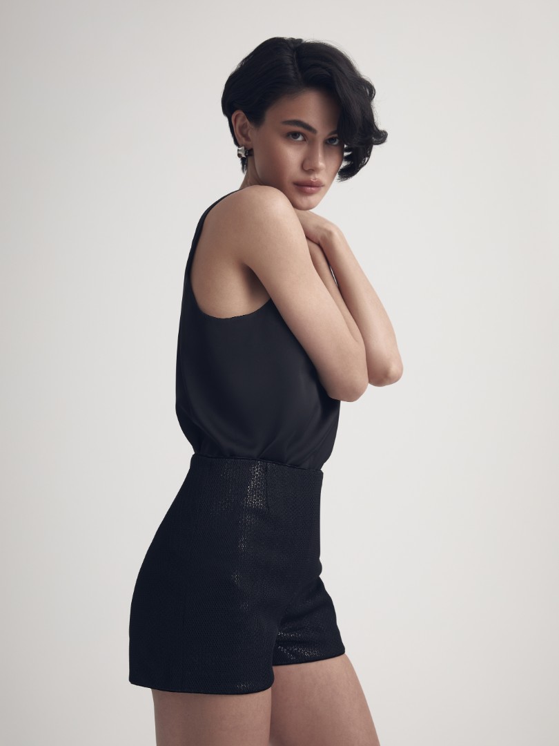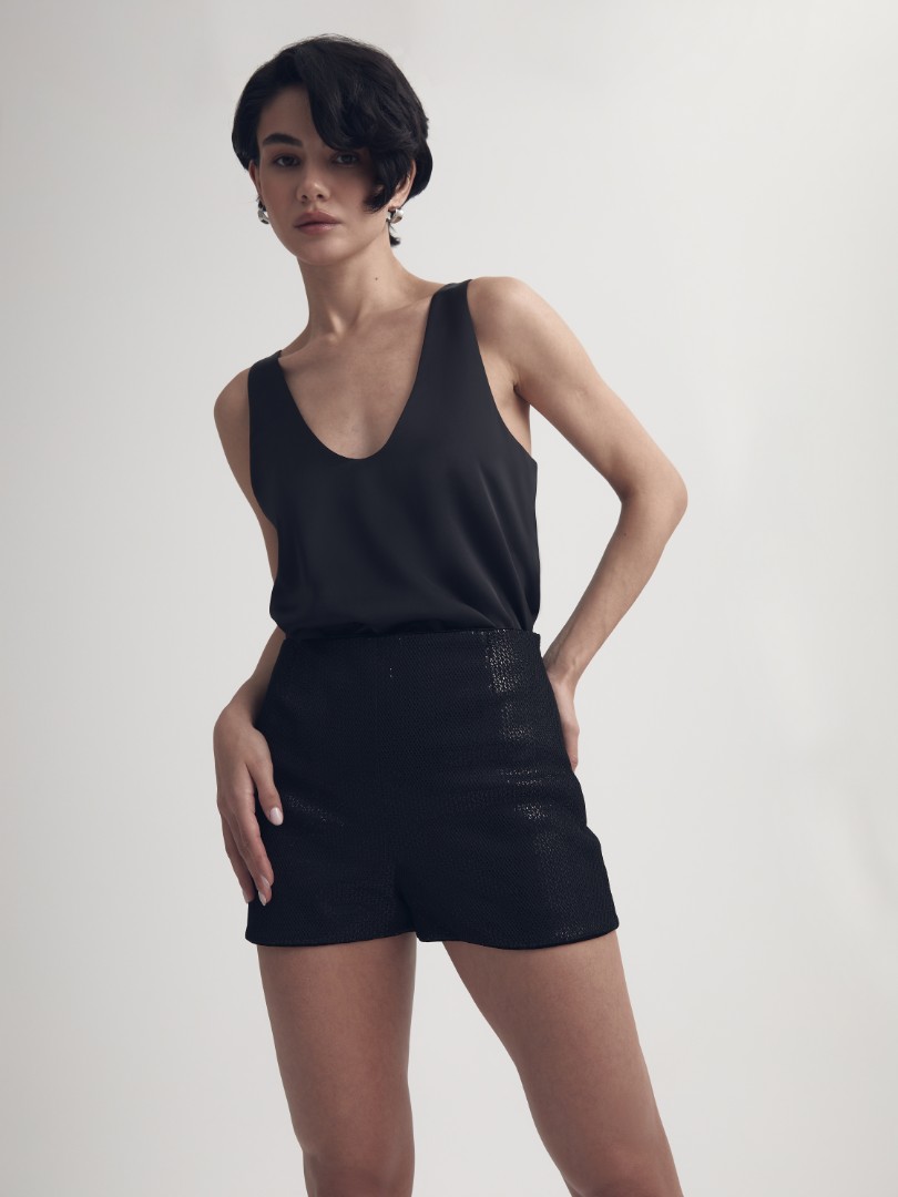 Шорты длины мини. Модель с высокой посадкой декорирована мерцающими пайетками.