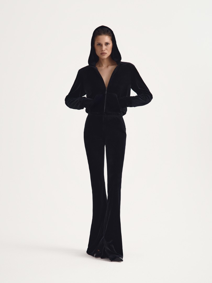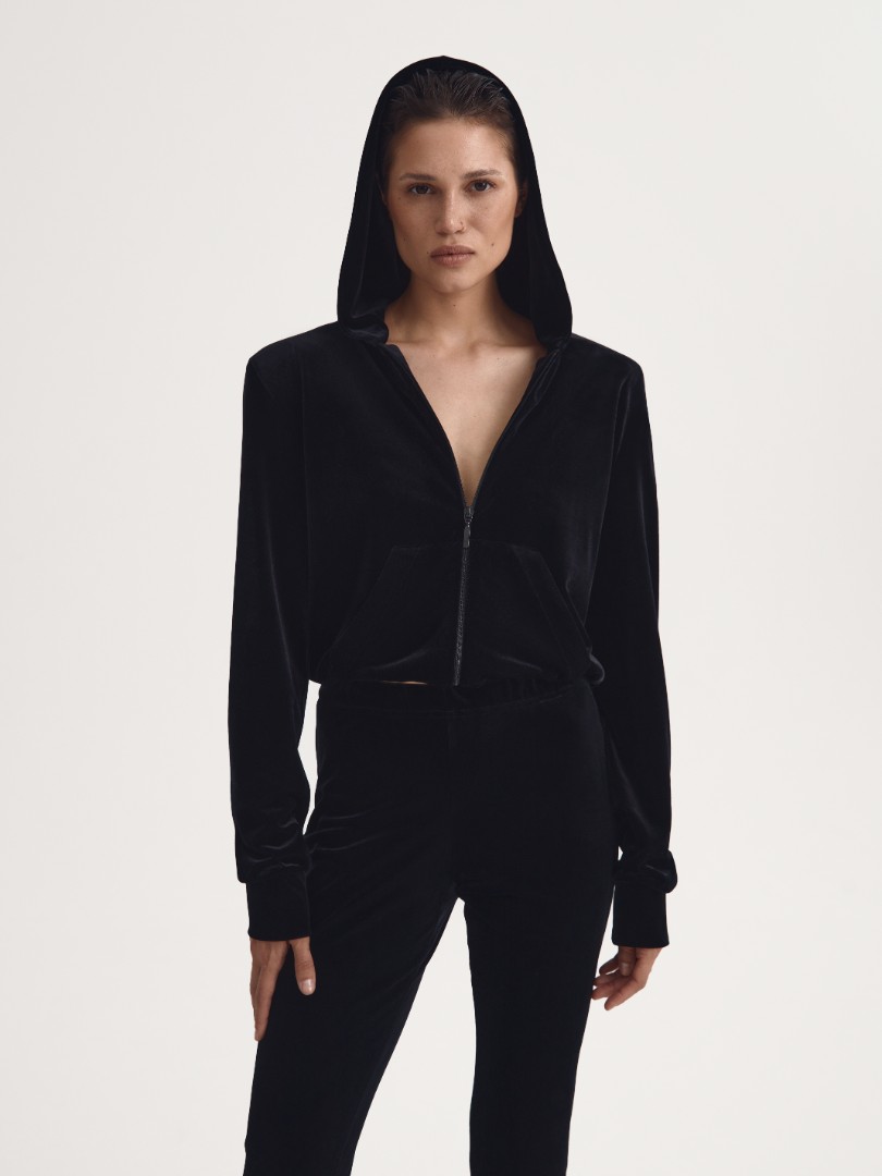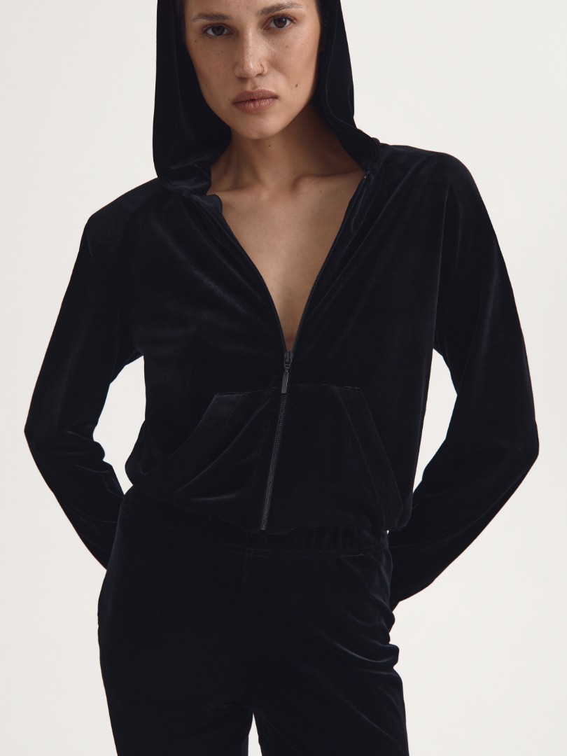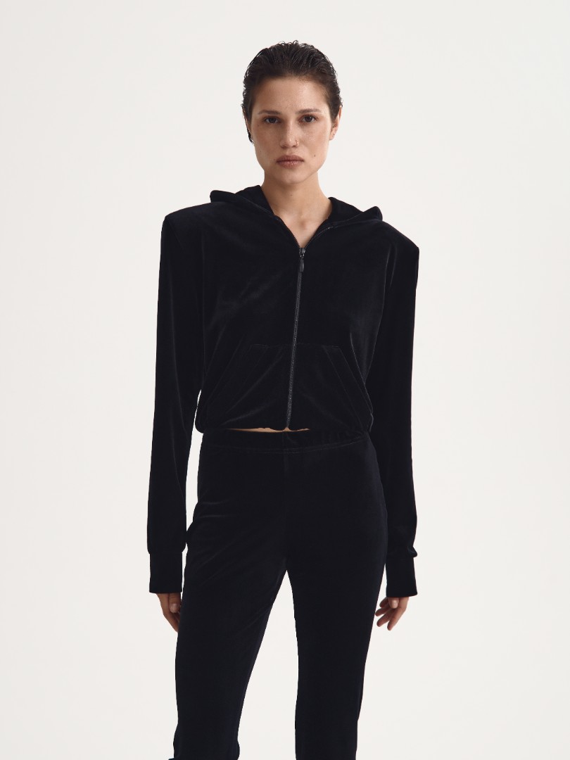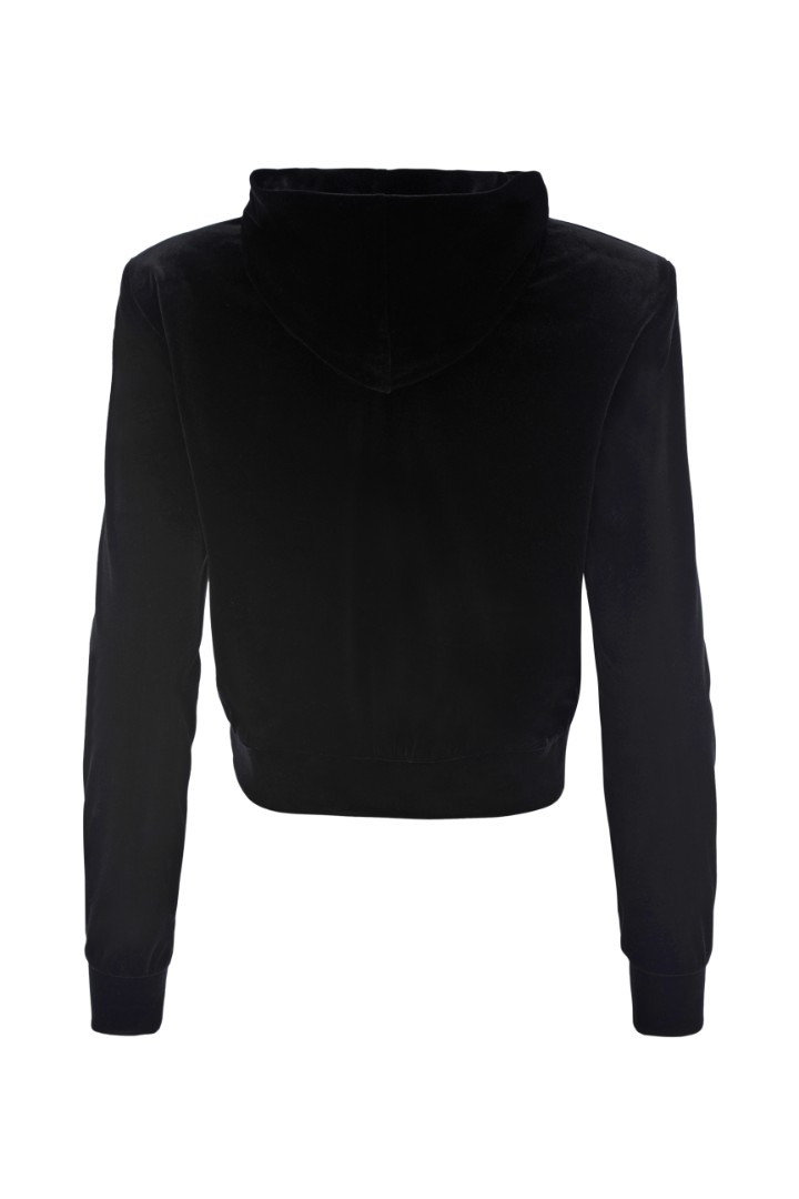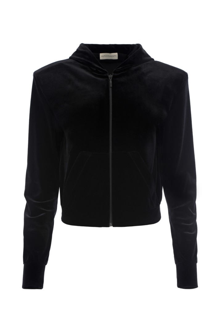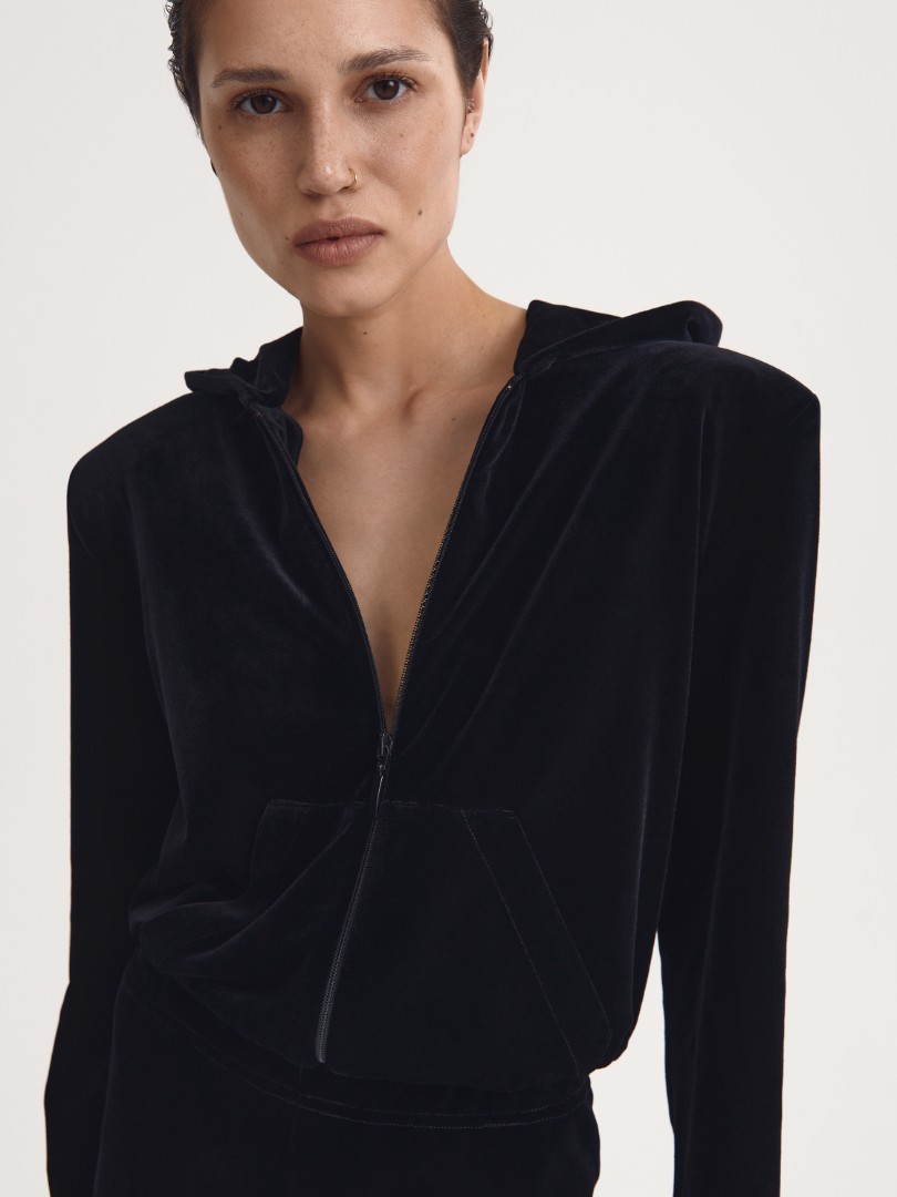 Укороченное худи на молнии из мягкого бархата. Дополнено карманом-кенгуру, капюшоном и вшитыми подплечниками, создающими графичный силуэт.