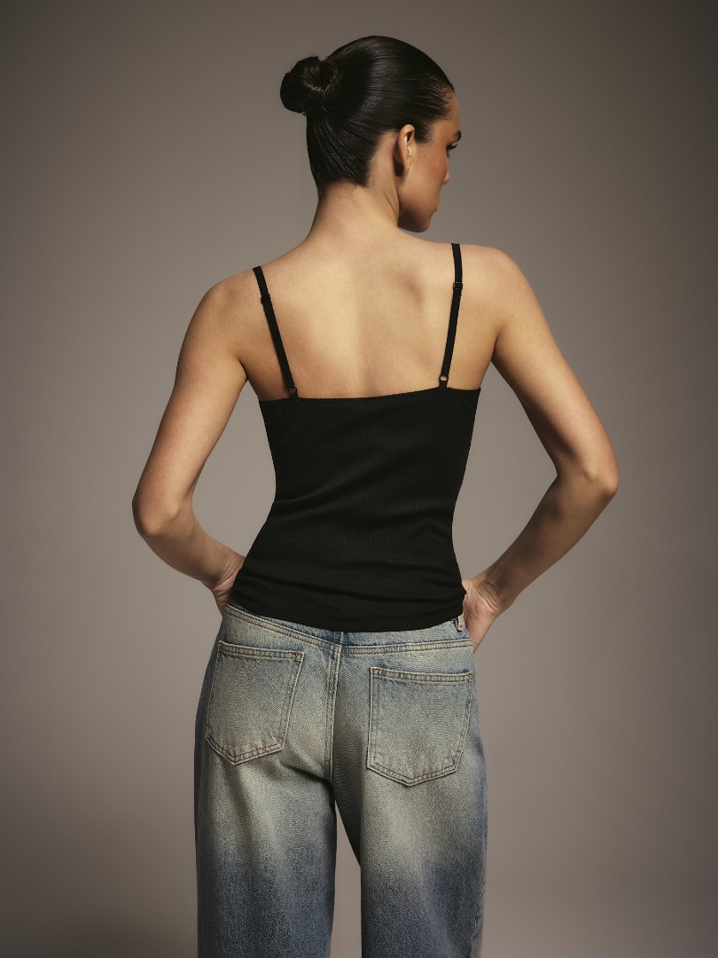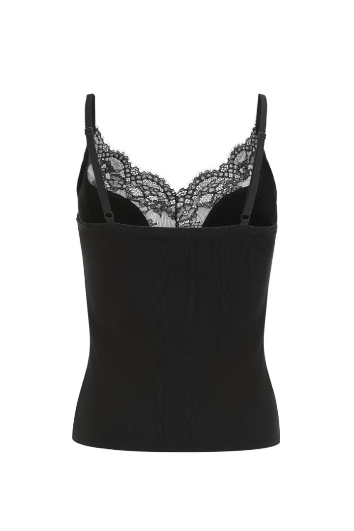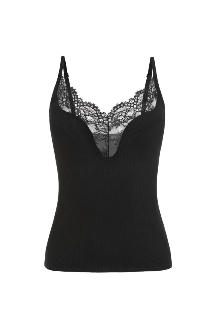 Топ на тонких регулируемых бретелях из эластичного трикотажа в рубчик с глубоким вырезом. V-образная вставка из прозрачного кружева в области декольте.